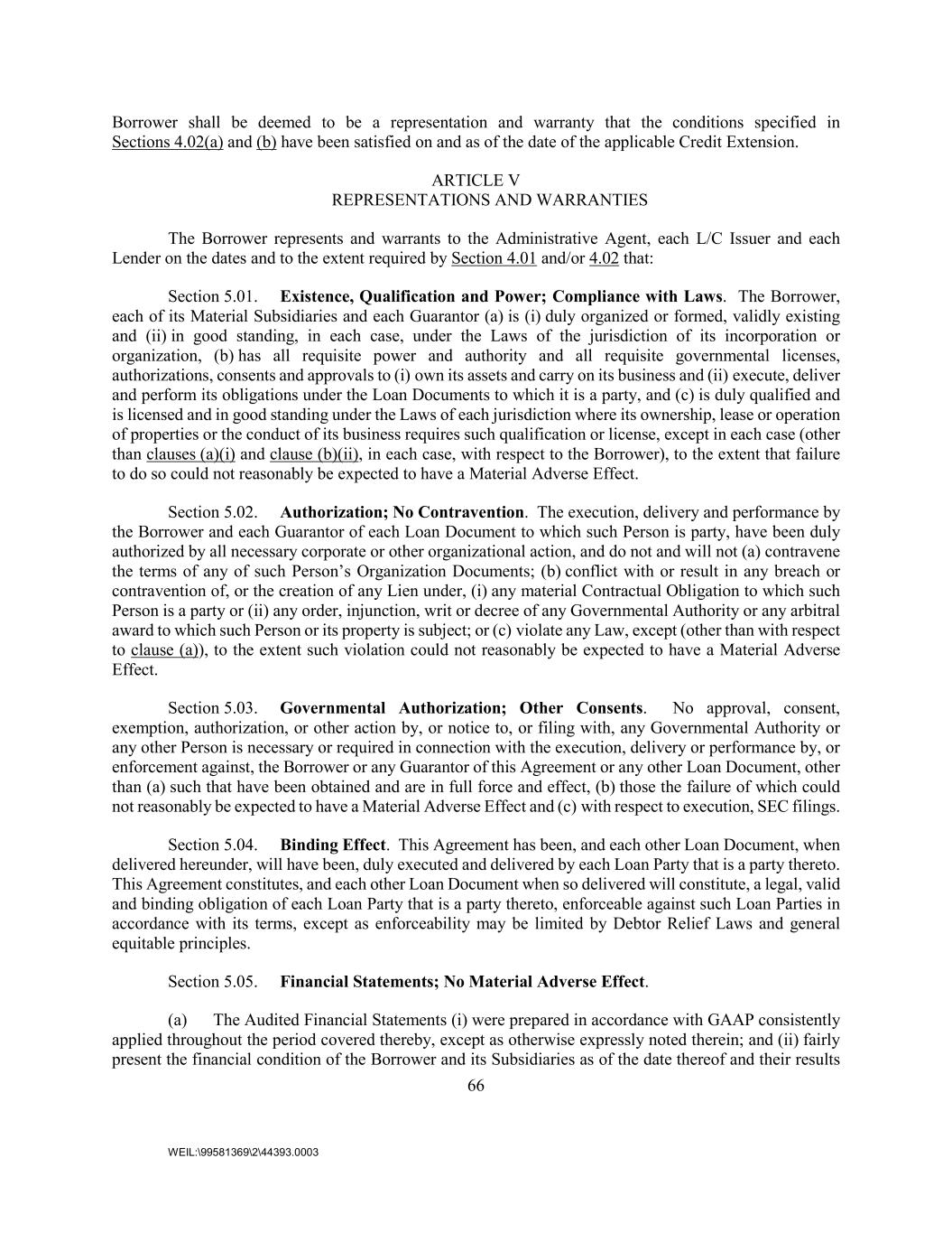 66 WEIL:\99581369\2\44393.0003 Borrower shall be deemed to be a representation and warranty that the conditions specified in Sections 4.02(a) and (b) have been satisfied on and as of the date of the applicable Credit Extension. ARTICLE V REPRESENTATIONS AND WARRANTIES The Borrower represents and warrants to the Administrative Agent, each L/C Issuer and each Lender on the dates and to the extent required by Section 4.01 and/or 4.02 that: Section 5.01. Existence, Qualification and Power; Compliance with Laws. The Borrower, each of its Material Subsidiaries and each Guarantor (a) is (i) duly organized or formed, validly existing and (ii) in good standing, in each case, under the Laws of the jurisdiction of its incorporation or organization, (b) has all requisite power and authority and all requisite governmental licenses, authorizations, consents and approvals to (i) own its assets and carry on its business and (ii) execute, deliver and perform its obligations under the Loan Documents to which it is a party, and (c) is duly qualified and is licensed and in good standing under the Laws of each jurisdiction where its ownership, lease or operation of properties or the conduct of its business requires such qualification or license, except in each case (other than clauses (a)(i) and clause (b)(ii), in each case, with respect to the Borrower), to the extent that failure to do so could not reasonably be expected to have a Material Adverse Effect. Section 5.02. Authorization; No Contravention. The execution, delivery and performance by the Borrower and each Guarantor of each Loan Document to which such Person is party, have been duly authorized by all necessary corporate or other organizational action, and do not and will not (a) contravene the terms of any of such Person’s Organization Documents; (b) conflict with or result in any breach or contravention of, or the creation of any Lien under, (i) any material Contractual Obligation to which such Person is a party or (ii) any order, injunction, writ or decree of any Governmental Authority or any arbitral award to which such Person or its property is subject; or (c) violate any Law, except (other than with respect to clause (a)), to the extent such violation could not reasonably be expected to have a Material Adverse Effect. Section 5.03. Governmental Authorization; Other Consents. No approval, consent, exemption, authorization, or other action by, or notice to, or filing with, any Governmental Authority or any other Person is necessary or required in connection with the execution, delivery or performance by, or enforcement against, the Borrower or any Guarantor of this Agreement or any other Loan Document, other than (a) such that have been obtained and are in full force and effect, (b) those the failure of which could not reasonably be expected to have a Material Adverse Effect and (c) with respect to execution, SEC filings. Section 5.04. Binding Effect. This Agreement has been, and each other Loan Document, when delivered hereunder, will have been, duly executed and delivered by each Loan Party that is a party thereto. This Agreement constitutes, and each other Loan Document when so delivered will constitute, a legal, valid and binding obligation of each Loan Party that is a party thereto, enforceable against such Loan Parties in accordance with its terms, except as enforceability may be limited by Debtor Relief Laws and general equitable principles. Section 5.05. Financial Statements; No Material Adverse Effect. (a) The Audited Financial Statements (i) were prepared in accordance with GAAP consistently applied throughout the period covered thereby, except as otherwise expressly noted therein; and (ii) fairly present the financial condition of the Borrower and its Subsidiaries as of the date thereof and their results
