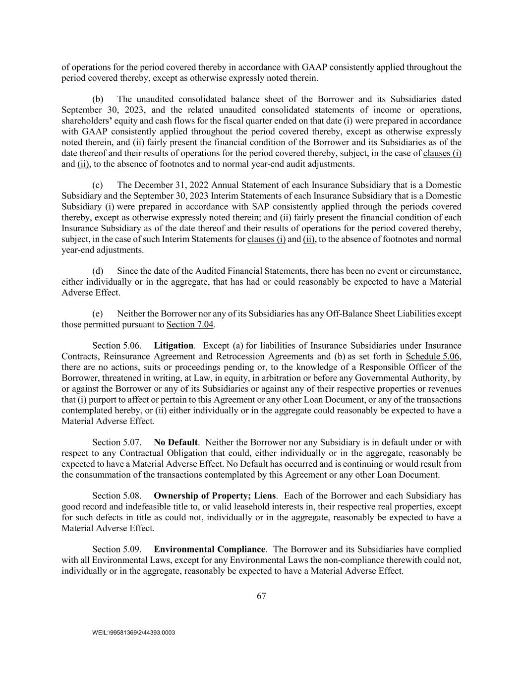 67 WEIL:\99581369\2\44393.0003 of operations for the period covered thereby in accordance with GAAP consistently applied throughout the period covered thereby, except as otherwise expressly noted therein. (b) The unaudited consolidated balance sheet of the Borrower and its Subsidiaries dated September 30, 2023, and the related unaudited consolidated statements of income or operations, shareholders’ equity and cash flows for the fiscal quarter ended on that date (i) were prepared in accordance with GAAP consistently applied throughout the period covered thereby, except as otherwise expressly noted therein, and (ii) fairly present the financial condition of the Borrower and its Subsidiaries as of the date thereof and their results of operations for the period covered thereby, subject, in the case of clauses (i) and (ii), to the absence of footnotes and to normal year-end audit adjustments. (c) The December 31, 2022 Annual Statement of each Insurance Subsidiary that is a Domestic Subsidiary and the September 30, 2023 Interim Statements of each Insurance Subsidiary that is a Domestic Subsidiary (i) were prepared in accordance with SAP consistently applied through the periods covered thereby, except as otherwise expressly noted therein; and (ii) fairly present the financial condition of each Insurance Subsidiary as of the date thereof and their results of operations for the period covered thereby, subject, in the case of such Interim Statements for clauses (i) and (ii), to the absence of footnotes and normal year-end adjustments. (d) Since the date of the Audited Financial Statements, there has been no event or circumstance, either individually or in the aggregate, that has had or could reasonably be expected to have a Material Adverse Effect. (e) Neither the Borrower nor any of its Subsidiaries has any Off-Balance Sheet Liabilities except those permitted pursuant to Section 7.04. Section 5.06. Litigation. Except (a) for liabilities of Insurance Subsidiaries under Insurance Contracts, Reinsurance Agreement and Retrocession Agreements and (b) as set forth in Schedule 5.06, there are no actions, suits or proceedings pending or, to the knowledge of a Responsible Officer of the Borrower, threatened in writing, at Law, in equity, in arbitration or before any Governmental Authority, by or against the Borrower or any of its Subsidiaries or against any of their respective properties or revenues that (i) purport to affect or pertain to this Agreement or any other Loan Document, or any of the transactions contemplated hereby, or (ii) either individually or in the aggregate could reasonably be expected to have a Material Adverse Effect. Section 5.07. No Default. Neither the Borrower nor any Subsidiary is in default under or with respect to any Contractual Obligation that could, either individually or in the aggregate, reasonably be expected to have a Material Adverse Effect. No Default has occurred and is continuing or would result from the consummation of the transactions contemplated by this Agreement or any other Loan Document. Section 5.08. Ownership of Property; Liens. Each of the Borrower and each Subsidiary has good record and indefeasible title to, or valid leasehold interests in, their respective real properties, except for such defects in title as could not, individually or in the aggregate, reasonably be expected to have a Material Adverse Effect. Section 5.09. Environmental Compliance. The Borrower and its Subsidiaries have complied with all Environmental Laws, except for any Environmental Laws the non-compliance therewith could not, individually or in the aggregate, reasonably be expected to have a Material Adverse Effect.