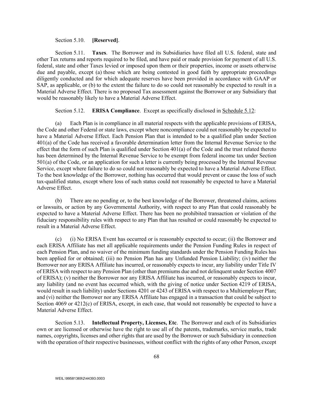 68 WEIL:\99581369\2\44393.0003 Section 5.10. [Reserved]. Section 5.11. Taxes. The Borrower and its Subsidiaries have filed all U.S. federal, state and other Tax returns and reports required to be filed, and have paid or made provision for payment of all U.S. federal, state and other Taxes levied or imposed upon them or their properties, income or assets otherwise due and payable, except (a) those which are being contested in good faith by appropriate proceedings diligently conducted and for which adequate reserves have been provided in accordance with GAAP or SAP, as applicable, or (b) to the extent the failure to do so could not reasonably be expected to result in a Material Adverse Effect. There is no proposed Tax assessment against the Borrower or any Subsidiary that would be reasonably likely to have a Material Adverse Effect. Section 5.12. ERISA Compliance. Except as specifically disclosed in Schedule 5.12: (a) Each Plan is in compliance in all material respects with the applicable provisions of ERISA, the Code and other Federal or state laws, except where noncompliance could not reasonably be expected to have a Material Adverse Effect. Each Pension Plan that is intended to be a qualified plan under Section 401(a) of the Code has received a favorable determination letter from the Internal Revenue Service to the effect that the form of such Plan is qualified under Section 401(a) of the Code and the trust related thereto has been determined by the Internal Revenue Service to be exempt from federal income tax under Section 501(a) of the Code, or an application for such a letter is currently being processed by the Internal Revenue Service, except where failure to do so could not reasonably be expected to have a Material Adverse Effect. To the best knowledge of the Borrower, nothing has occurred that would prevent or cause the loss of such tax-qualified status, except where loss of such status could not reasonably be expected to have a Material Adverse Effect. (b) There are no pending or, to the best knowledge of the Borrower, threatened claims, actions or lawsuits, or action by any Governmental Authority, with respect to any Plan that could reasonably be expected to have a Material Adverse Effect. There has been no prohibited transaction or violation of the fiduciary responsibility rules with respect to any Plan that has resulted or could reasonably be expected to result in a Material Adverse Effect. (c) (i) No ERISA Event has occurred or is reasonably expected to occur; (ii) the Borrower and each ERISA Affiliate has met all applicable requirements under the Pension Funding Rules in respect of each Pension Plan, and no waiver of the minimum funding standards under the Pension Funding Rules has been applied for or obtained; (iii) no Pension Plan has any Unfunded Pension Liability; (iv) neither the Borrower nor any ERISA Affiliate has incurred, or reasonably expects to incur, any liability under Title IV of ERISA with respect to any Pension Plan (other than premiums due and not delinquent under Section 4007 of ERISA); (v) neither the Borrower nor any ERISA Affiliate has incurred, or reasonably expects to incur, any liability (and no event has occurred which, with the giving of notice under Section 4219 of ERISA, would result in such liability) under Sections 4201 or 4243 of ERISA with respect to a Multiemployer Plan; and (vi) neither the Borrower nor any ERISA Affiliate has engaged in a transaction that could be subject to Section 4069 or 4212(c) of ERISA, except, in each case, that would not reasonably be expected to have a Material Adverse Effect. Section 5.13. Intellectual Property, Licenses, Etc. The Borrower and each of its Subsidiaries own or are licensed or otherwise have the right to use all of the patents, trademarks, service marks, trade names, copyrights, licenses and other rights that are used by the Borrower or such Subsidiary in connection with the operation of their respective businesses, without conflict with the rights of any other Person, except