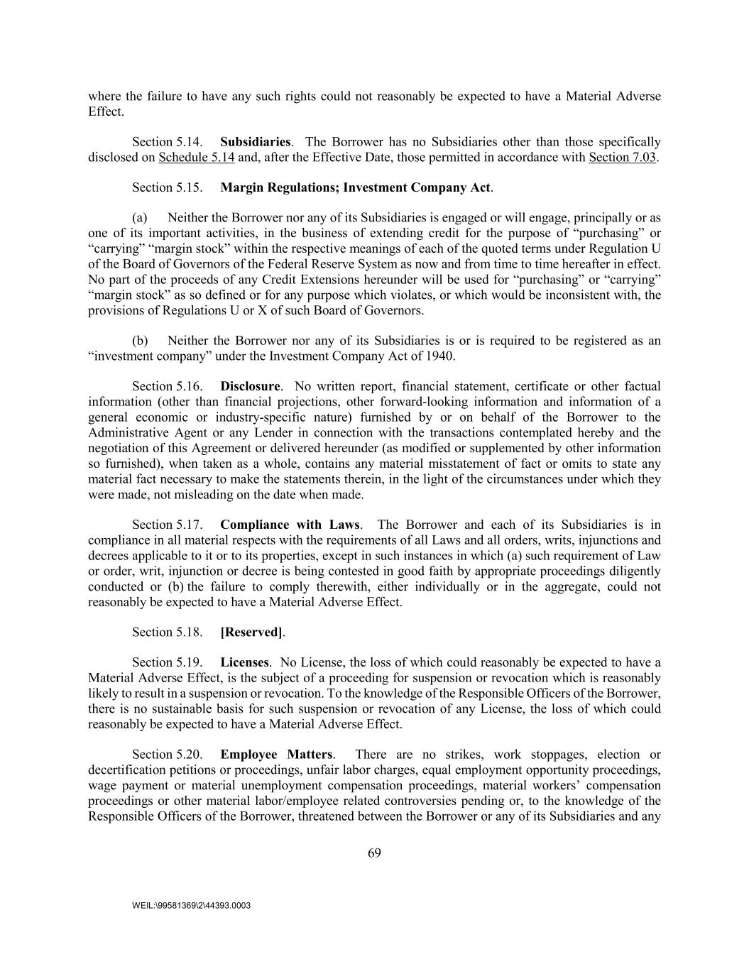 69 WEIL:\99581369\2\44393.0003 where the failure to have any such rights could not reasonably be expected to have a Material Adverse Effect. Section 5.14. Subsidiaries. The Borrower has no Subsidiaries other than those specifically disclosed on Schedule 5.14 and, after the Effective Date, those permitted in accordance with Section 7.03. Section 5.15. Margin Regulations; Investment Company Act. (a) Neither the Borrower nor any of its Subsidiaries is engaged or will engage, principally or as one of its important activities, in the business of extending credit for the purpose of “purchasing” or “carrying” “margin stock” within the respective meanings of each of the quoted terms under Regulation U of the Board of Governors of the Federal Reserve System as now and from time to time hereafter in effect. No part of the proceeds of any Credit Extensions hereunder will be used for “purchasing” or “carrying” “margin stock” as so defined or for any purpose which violates, or which would be inconsistent with, the provisions of Regulations U or X of such Board of Governors. (b) Neither the Borrower nor any of its Subsidiaries is or is required to be registered as an “investment company” under the Investment Company Act of 1940. Section 5.16. Disclosure. No written report, financial statement, certificate or other factual information (other than financial projections, other forward-looking information and information of a general economic or industry-specific nature) furnished by or on behalf of the Borrower to the Administrative Agent or any Lender in connection with the transactions contemplated hereby and the negotiation of this Agreement or delivered hereunder (as modified or supplemented by other information so furnished), when taken as a whole, contains any material misstatement of fact or omits to state any material fact necessary to make the statements therein, in the light of the circumstances under which they were made, not misleading on the date when made. Section 5.17. Compliance with Laws. The Borrower and each of its Subsidiaries is in compliance in all material respects with the requirements of all Laws and all orders, writs, injunctions and decrees applicable to it or to its properties, except in such instances in which (a) such requirement of Law or order, writ, injunction or decree is being contested in good faith by appropriate proceedings diligently conducted or (b) the failure to comply therewith, either individually or in the aggregate, could not reasonably be expected to have a Material Adverse Effect. Section 5.18. [Reserved]. Section 5.19. Licenses. No License, the loss of which could reasonably be expected to have a Material Adverse Effect, is the subject of a proceeding for suspension or revocation which is reasonably likely to result in a suspension or revocation. To the knowledge of the Responsible Officers of the Borrower, there is no sustainable basis for such suspension or revocation of any License, the loss of which could reasonably be expected to have a Material Adverse Effect. Section 5.20. Employee Matters. There are no strikes, work stoppages, election or decertification petitions or proceedings, unfair labor charges, equal employment opportunity proceedings, wage payment or material unemployment compensation proceedings, material workers’ compensation proceedings or other material labor/employee related controversies pending or, to the knowledge of the Responsible Officers of the Borrower, threatened between the Borrower or any of its Subsidiaries and any