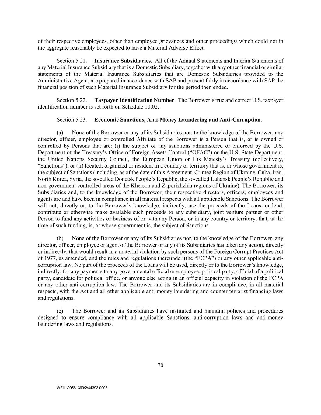 70 WEIL:\99581369\2\44393.0003 of their respective employees, other than employee grievances and other proceedings which could not in the aggregate reasonably be expected to have a Material Adverse Effect. Section 5.21. Insurance Subsidiaries. All of the Annual Statements and Interim Statements of any Material Insurance Subsidiary that is a Domestic Subsidiary, together with any other financial or similar statements of the Material Insurance Subsidiaries that are Domestic Subsidiaries provided to the Administrative Agent, are prepared in accordance with SAP and present fairly in accordance with SAP the financial position of such Material Insurance Subsidiary for the period then ended. Section 5.22. Taxpayer Identification Number. The Borrower’s true and correct U.S. taxpayer identification number is set forth on Schedule 10.02. Section 5.23. Economic Sanctions, Anti-Money Laundering and Anti-Corruption. (a) None of the Borrower or any of its Subsidiaries nor, to the knowledge of the Borrower, any director, officer, employee or controlled Affiliate of the Borrower is a Person that is, or is owned or controlled by Persons that are: (i) the subject of any sanctions administered or enforced by the U.S. Department of the Treasury’s Office of Foreign Assets Control (“OFAC”) or the U.S. State Department, the United Nations Security Council, the European Union or His Majesty’s Treasury (collectively, “Sanctions”), or (ii) located, organized or resident in a country or territory that is, or whose government is, the subject of Sanctions (including, as of the date of this Agreement, Crimea Region of Ukraine, Cuba, Iran, North Korea, Syria, the so-called Donetsk People’s Republic, the so-called Luhansk People’s Republic and non-government controlled areas of the Kherson and Zaporizhzhia regions of Ukraine). The Borrower, its Subsidiaries and, to the knowledge of the Borrower, their respective directors, officers, employees and agents are and have been in compliance in all material respects with all applicable Sanctions. The Borrower will not, directly or, to the Borrower’s knowledge, indirectly, use the proceeds of the Loans, or lend, contribute or otherwise make available such proceeds to any subsidiary, joint venture partner or other Person to fund any activities or business of or with any Person, or in any country or territory, that, at the time of such funding, is, or whose government is, the subject of Sanctions. (b) None of the Borrower or any of its Subsidiaries nor, to the knowledge of the Borrower, any director, officer, employee or agent of the Borrower or any of its Subsidiaries has taken any action, directly or indirectly, that would result in a material violation by such persons of the Foreign Corrupt Practices Act of 1977, as amended, and the rules and regulations thereunder (the “FCPA”) or any other applicable anti- corruption law. No part of the proceeds of the Loans will be used, directly or to the Borrower’s knowledge, indirectly, for any payments to any governmental official or employee, political party, official of a political party, candidate for political office, or anyone else acting in an official capacity in violation of the FCPA or any other anti-corruption law. The Borrower and its Subsidiaries are in compliance, in all material respects, with the Act and all other applicable anti-money laundering and counter-terrorist financing laws and regulations. (c) The Borrower and its Subsidiaries have instituted and maintain policies and procedures designed to ensure compliance with all applicable Sanctions, anti-corruption laws and anti-money laundering laws and regulations.