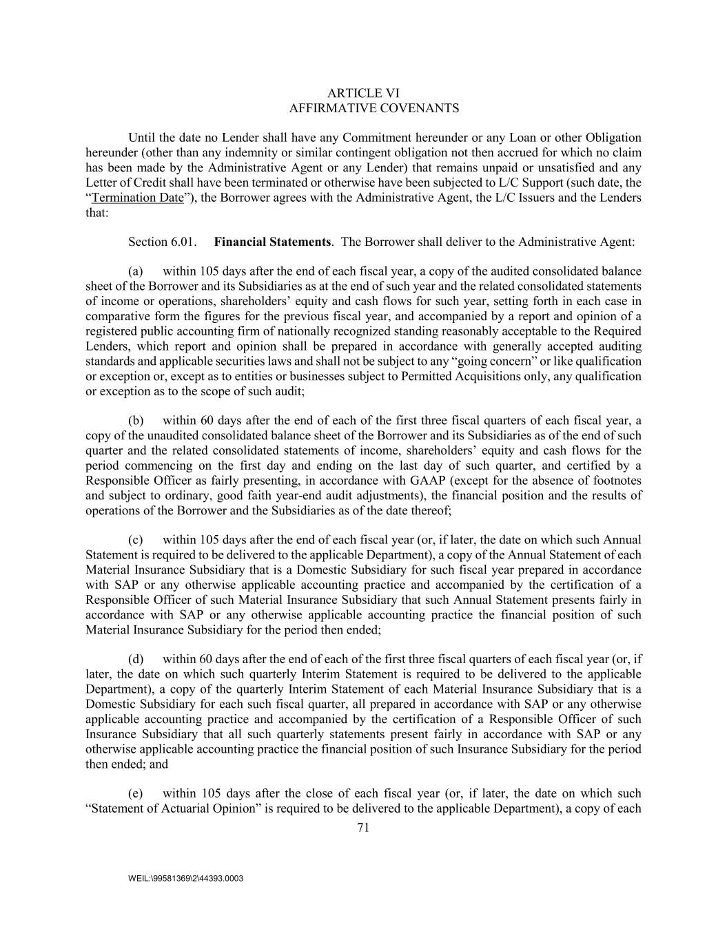 71 WEIL:\99581369\2\44393.0003 ARTICLE VI AFFIRMATIVE COVENANTS Until the date no Lender shall have any Commitment hereunder or any Loan or other Obligation hereunder (other than any indemnity or similar contingent obligation not then accrued for which no claim has been made by the Administrative Agent or any Lender) that remains unpaid or unsatisfied and any Letter of Credit shall have been terminated or otherwise have been subjected to L/C Support (such date, the “Termination Date”), the Borrower agrees with the Administrative Agent, the L/C Issuers and the Lenders that: Section 6.01. Financial Statements. The Borrower shall deliver to the Administrative Agent: (a) within 105 days after the end of each fiscal year, a copy of the audited consolidated balance sheet of the Borrower and its Subsidiaries as at the end of such year and the related consolidated statements of income or operations, shareholders’ equity and cash flows for such year, setting forth in each case in comparative form the figures for the previous fiscal year, and accompanied by a report and opinion of a registered public accounting firm of nationally recognized standing reasonably acceptable to the Required Lenders, which report and opinion shall be prepared in accordance with generally accepted auditing standards and applicable securities laws and shall not be subject to any “going concern” or like qualification or exception or, except as to entities or businesses subject to Permitted Acquisitions only, any qualification or exception as to the scope of such audit; (b) within 60 days after the end of each of the first three fiscal quarters of each fiscal year, a copy of the unaudited consolidated balance sheet of the Borrower and its Subsidiaries as of the end of such quarter and the related consolidated statements of income, shareholders’ equity and cash flows for the period commencing on the first day and ending on the last day of such quarter, and certified by a Responsible Officer as fairly presenting, in accordance with GAAP (except for the absence of footnotes and subject to ordinary, good faith year-end audit adjustments), the financial position and the results of operations of the Borrower and the Subsidiaries as of the date thereof; (c) within 105 days after the end of each fiscal year (or, if later, the date on which such Annual Statement is required to be delivered to the applicable Department), a copy of the Annual Statement of each Material Insurance Subsidiary that is a Domestic Subsidiary for such fiscal year prepared in accordance with SAP or any otherwise applicable accounting practice and accompanied by the certification of a Responsible Officer of such Material Insurance Subsidiary that such Annual Statement presents fairly in accordance with SAP or any otherwise applicable accounting practice the financial position of such Material Insurance Subsidiary for the period then ended; (d) within 60 days after the end of each of the first three fiscal quarters of each fiscal year (or, if later, the date on which such quarterly Interim Statement is required to be delivered to the applicable Department), a copy of the quarterly Interim Statement of each Material Insurance Subsidiary that is a Domestic Subsidiary for each such fiscal quarter, all prepared in accordance with SAP or any otherwise applicable accounting practice and accompanied by the certification of a Responsible Officer of such Insurance Subsidiary that all such quarterly statements present fairly in accordance with SAP or any otherwise applicable accounting practice the financial position of such Insurance Subsidiary for the period then ended; and (e) within 105 days after the close of each fiscal year (or, if later, the date on which such “Statement of Actuarial Opinion” is required to be delivered to the applicable Department), a copy of each