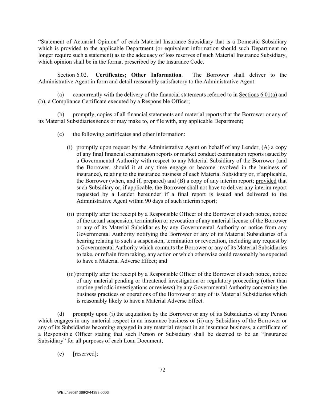 72 WEIL:\99581369\2\44393.0003 “Statement of Actuarial Opinion” of each Material Insurance Subsidiary that is a Domestic Subsidiary which is provided to the applicable Department (or equivalent information should such Department no longer require such a statement) as to the adequacy of loss reserves of such Material Insurance Subsidiary, which opinion shall be in the format prescribed by the Insurance Code. Section 6.02. Certificates; Other Information. The Borrower shall deliver to the Administrative Agent in form and detail reasonably satisfactory to the Administrative Agent: (a) concurrently with the delivery of the financial statements referred to in Sections 6.01(a) and (b), a Compliance Certificate executed by a Responsible Officer; (b) promptly, copies of all financial statements and material reports that the Borrower or any of its Material Subsidiaries sends or may make to, or file with, any applicable Department; (c) the following certificates and other information: (i) promptly upon request by the Administrative Agent on behalf of any Lender, (A) a copy of any final financial examination reports or market conduct examination reports issued by a Governmental Authority with respect to any Material Subsidiary of the Borrower (and the Borrower, should it at any time engage or become involved in the business of insurance), relating to the insurance business of each Material Subsidiary or, if applicable, the Borrower (when, and if, prepared) and (B) a copy of any interim report; provided that such Subsidiary or, if applicable, the Borrower shall not have to deliver any interim report requested by a Lender hereunder if a final report is issued and delivered to the Administrative Agent within 90 days of such interim report; (ii) promptly after the receipt by a Responsible Officer of the Borrower of such notice, notice of the actual suspension, termination or revocation of any material license of the Borrower or any of its Material Subsidiaries by any Governmental Authority or notice from any Governmental Authority notifying the Borrower or any of its Material Subsidiaries of a hearing relating to such a suspension, termination or revocation, including any request by a Governmental Authority which commits the Borrower or any of its Material Subsidiaries to take, or refrain from taking, any action or which otherwise could reasonably be expected to have a Material Adverse Effect; and (iii) promptly after the receipt by a Responsible Officer of the Borrower of such notice, notice of any material pending or threatened investigation or regulatory proceeding (other than routine periodic investigations or reviews) by any Governmental Authority concerning the business practices or operations of the Borrower or any of its Material Subsidiaries which is reasonably likely to have a Material Adverse Effect. (d) promptly upon (i) the acquisition by the Borrower or any of its Subsidiaries of any Person which engages in any material respect in an insurance business or (ii) any Subsidiary of the Borrower or any of its Subsidiaries becoming engaged in any material respect in an insurance business, a certificate of a Responsible Officer stating that such Person or Subsidiary shall be deemed to be an “Insurance Subsidiary” for all purposes of each Loan Document; (e) [reserved];