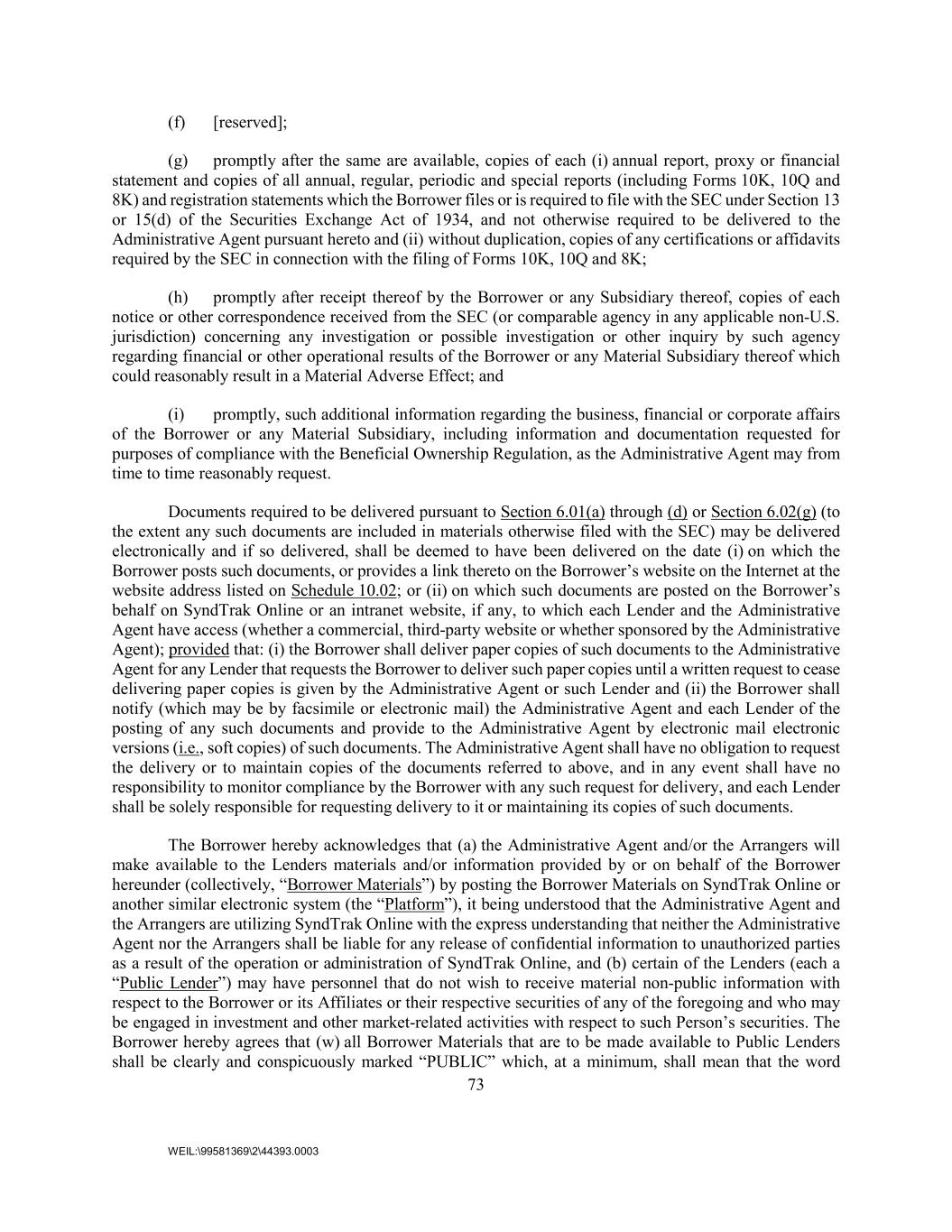 73 WEIL:\99581369\2\44393.0003 (f) [reserved]; (g) promptly after the same are available, copies of each (i) annual report, proxy or financial statement and copies of all annual, regular, periodic and special reports (including Forms 10K, 10Q and 8K) and registration statements which the Borrower files or is required to file with the SEC under Section 13 or 15(d) of the Securities Exchange Act of 1934, and not otherwise required to be delivered to the Administrative Agent pursuant hereto and (ii) without duplication, copies of any certifications or affidavits required by the SEC in connection with the filing of Forms 10K, 10Q and 8K; (h) promptly after receipt thereof by the Borrower or any Subsidiary thereof, copies of each notice or other correspondence received from the SEC (or comparable agency in any applicable non-U.S. jurisdiction) concerning any investigation or possible investigation or other inquiry by such agency regarding financial or other operational results of the Borrower or any Material Subsidiary thereof which could reasonably result in a Material Adverse Effect; and (i) promptly, such additional information regarding the business, financial or corporate affairs of the Borrower or any Material Subsidiary, including information and documentation requested for purposes of compliance with the Beneficial Ownership Regulation, as the Administrative Agent may from time to time reasonably request. Documents required to be delivered pursuant to Section 6.01(a) through (d) or Section 6.02(g) (to the extent any such documents are included in materials otherwise filed with the SEC) may be delivered electronically and if so delivered, shall be deemed to have been delivered on the date (i) on which the Borrower posts such documents, or provides a link thereto on the Borrower’s website on the Internet at the website address listed on Schedule 10.02; or (ii) on which such documents are posted on the Borrower’s behalf on SyndTrak Online or an intranet website, if any, to which each Lender and the Administrative Agent have access (whether a commercial, third-party website or whether sponsored by the Administrative Agent); provided that: (i) the Borrower shall deliver paper copies of such documents to the Administrative Agent for any Lender that requests the Borrower to deliver such paper copies until a written request to cease delivering paper copies is given by the Administrative Agent or such Lender and (ii) the Borrower shall notify (which may be by facsimile or electronic mail) the Administrative Agent and each Lender of the posting of any such documents and provide to the Administrative Agent by electronic mail electronic versions (i.e., soft copies) of such documents. The Administrative Agent shall have no obligation to request the delivery or to maintain copies of the documents referred to above, and in any event shall have no responsibility to monitor compliance by the Borrower with any such request for delivery, and each Lender shall be solely responsible for requesting delivery to it or maintaining its copies of such documents. The Borrower hereby acknowledges that (a) the Administrative Agent and/or the Arrangers will make available to the Lenders materials and/or information provided by or on behalf of the Borrower hereunder (collectively, “Borrower Materials”) by posting the Borrower Materials on SyndTrak Online or another similar electronic system (the “Platform”), it being understood that the Administrative Agent and the Arrangers are utilizing SyndTrak Online with the express understanding that neither the Administrative Agent nor the Arrangers shall be liable for any release of confidential information to unauthorized parties as a result of the operation or administration of SyndTrak Online, and (b) certain of the Lenders (each a “Public Lender”) may have personnel that do not wish to receive material non-public information with respect to the Borrower or its Affiliates or their respective securities of any of the foregoing and who may be engaged in investment and other market-related activities with respect to such Person’s securities. The Borrower hereby agrees that (w) all Borrower Materials that are to be made available to Public Lenders shall be clearly and conspicuously marked “PUBLIC” which, at a minimum, shall mean that the word