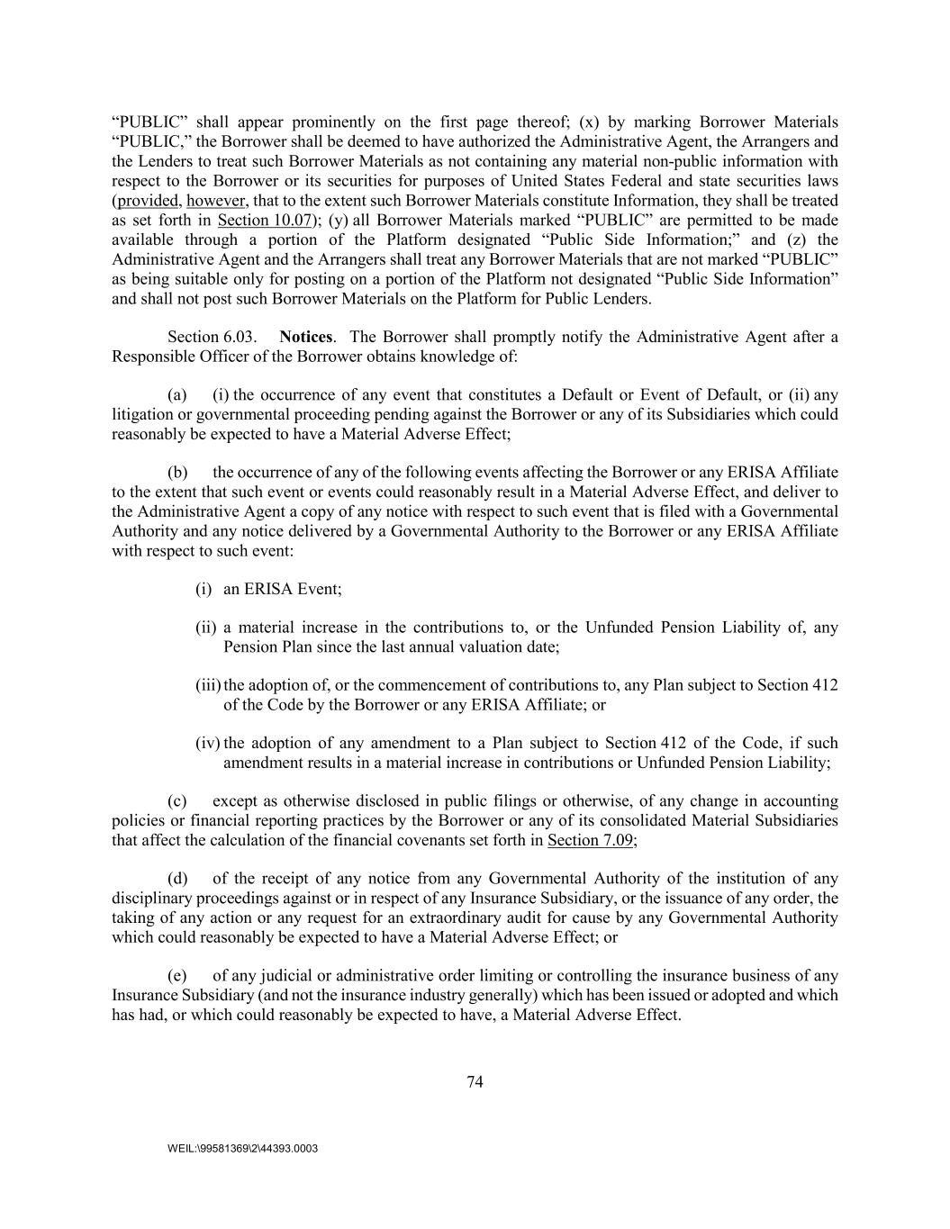 74 WEIL:\99581369\2\44393.0003 “PUBLIC” shall appear prominently on the first page thereof; (x) by marking Borrower Materials “PUBLIC,” the Borrower shall be deemed to have authorized the Administrative Agent, the Arrangers and the Lenders to treat such Borrower Materials as not containing any material non-public information with respect to the Borrower or its securities for purposes of United States Federal and state securities laws (provided, however, that to the extent such Borrower Materials constitute Information, they shall be treated as set forth in Section 10.07); (y) all Borrower Materials marked “PUBLIC” are permitted to be made available through a portion of the Platform designated “Public Side Information;” and (z) the Administrative Agent and the Arrangers shall treat any Borrower Materials that are not marked “PUBLIC” as being suitable only for posting on a portion of the Platform not designated “Public Side Information” and shall not post such Borrower Materials on the Platform for Public Lenders. Section 6.03. Notices. The Borrower shall promptly notify the Administrative Agent after a Responsible Officer of the Borrower obtains knowledge of: (a) (i) the occurrence of any event that constitutes a Default or Event of Default, or (ii) any litigation or governmental proceeding pending against the Borrower or any of its Subsidiaries which could reasonably be expected to have a Material Adverse Effect; (b) the occurrence of any of the following events affecting the Borrower or any ERISA Affiliate to the extent that such event or events could reasonably result in a Material Adverse Effect, and deliver to the Administrative Agent a copy of any notice with respect to such event that is filed with a Governmental Authority and any notice delivered by a Governmental Authority to the Borrower or any ERISA Affiliate with respect to such event: (i) an ERISA Event; (ii) a material increase in the contributions to, or the Unfunded Pension Liability of, any Pension Plan since the last annual valuation date; (iii) the adoption of, or the commencement of contributions to, any Plan subject to Section 412 of the Code by the Borrower or any ERISA Affiliate; or (iv) the adoption of any amendment to a Plan subject to Section 412 of the Code, if such amendment results in a material increase in contributions or Unfunded Pension Liability; (c) except as otherwise disclosed in public filings or otherwise, of any change in accounting policies or financial reporting practices by the Borrower or any of its consolidated Material Subsidiaries that affect the calculation of the financial covenants set forth in Section 7.09; (d) of the receipt of any notice from any Governmental Authority of the institution of any disciplinary proceedings against or in respect of any Insurance Subsidiary, or the issuance of any order, the taking of any action or any request for an extraordinary audit for cause by any Governmental Authority which could reasonably be expected to have a Material Adverse Effect; or (e) of any judicial or administrative order limiting or controlling the insurance business of any Insurance Subsidiary (and not the insurance industry generally) which has been issued or adopted and which has had, or which could reasonably be expected to have, a Material Adverse Effect.
