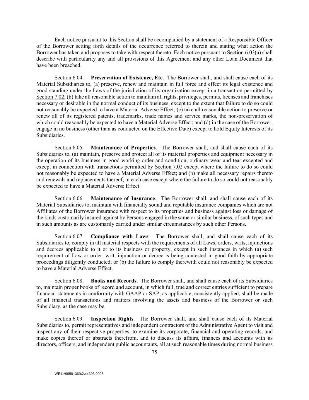 75 WEIL:\99581369\2\44393.0003 Each notice pursuant to this Section shall be accompanied by a statement of a Responsible Officer of the Borrower setting forth details of the occurrence referred to therein and stating what action the Borrower has taken and proposes to take with respect thereto. Each notice pursuant to Section 6.03(a) shall describe with particularity any and all provisions of this Agreement and any other Loan Document that have been breached. Section 6.04. Preservation of Existence, Etc. The Borrower shall, and shall cause each of its Material Subsidiaries to, (a) preserve, renew and maintain in full force and effect its legal existence and good standing under the Laws of the jurisdiction of its organization except in a transaction permitted by Section 7.02; (b) take all reasonable action to maintain all rights, privileges, permits, licenses and franchises necessary or desirable in the normal conduct of its business, except to the extent that failure to do so could not reasonably be expected to have a Material Adverse Effect; (c) take all reasonable action to preserve or renew all of its registered patents, trademarks, trade names and service marks, the non-preservation of which could reasonably be expected to have a Material Adverse Effect; and (d) in the case of the Borrower, engage in no business (other than as conducted on the Effective Date) except to hold Equity Interests of its Subsidiaries. Section 6.05. Maintenance of Properties. The Borrower shall, and shall cause each of its Subsidiaries to, (a) maintain, preserve and protect all of its material properties and equipment necessary in the operation of its business in good working order and condition, ordinary wear and tear excepted and except in connection with transactions permitted by Section 7.02 except where the failure to do so could not reasonably be expected to have a Material Adverse Effect; and (b) make all necessary repairs thereto and renewals and replacements thereof, in each case except where the failure to do so could not reasonably be expected to have a Material Adverse Effect. Section 6.06. Maintenance of Insurance. The Borrower shall, and shall cause each of its Material Subsidiaries to, maintain with financially sound and reputable insurance companies which are not Affiliates of the Borrower insurance with respect to its properties and business against loss or damage of the kinds customarily insured against by Persons engaged in the same or similar business, of such types and in such amounts as are customarily carried under similar circumstances by such other Persons. Section 6.07. Compliance with Laws. The Borrower shall, and shall cause each of its Subsidiaries to, comply in all material respects with the requirements of all Laws, orders, writs, injunctions and decrees applicable to it or to its business or property, except in such instances in which (a) such requirement of Law or order, writ, injunction or decree is being contested in good faith by appropriate proceedings diligently conducted; or (b) the failure to comply therewith could not reasonably be expected to have a Material Adverse Effect. Section 6.08. Books and Records. The Borrower shall, and shall cause each of its Subsidiaries to, maintain proper books of record and account, in which full, true and correct entries sufficient to prepare financial statements in conformity with GAAP or SAP, as applicable, consistently applied, shall be made of all financial transactions and matters involving the assets and business of the Borrower or such Subsidiary, as the case may be. Section 6.09. Inspection Rights. The Borrower shall, and shall cause each of its Material Subsidiaries to, permit representatives and independent contractors of the Administrative Agent to visit and inspect any of their respective properties, to examine its corporate, financial and operating records, and make copies thereof or abstracts therefrom, and to discuss its affairs, finances and accounts with its directors, officers, and independent public accountants, all at such reasonable times during normal business