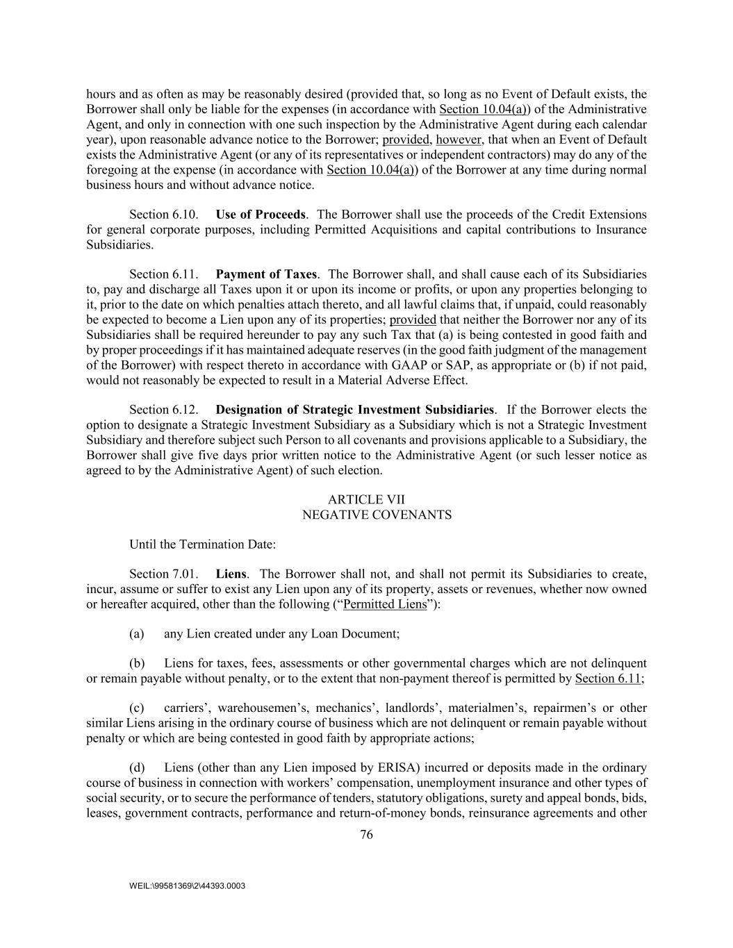 76 WEIL:\99581369\2\44393.0003 hours and as often as may be reasonably desired (provided that, so long as no Event of Default exists, the Borrower shall only be liable for the expenses (in accordance with Section 10.04(a)) of the Administrative Agent, and only in connection with one such inspection by the Administrative Agent during each calendar year), upon reasonable advance notice to the Borrower; provided, however, that when an Event of Default exists the Administrative Agent (or any of its representatives or independent contractors) may do any of the foregoing at the expense (in accordance with Section 10.04(a)) of the Borrower at any time during normal business hours and without advance notice. Section 6.10. Use of Proceeds. The Borrower shall use the proceeds of the Credit Extensions for general corporate purposes, including Permitted Acquisitions and capital contributions to Insurance Subsidiaries. Section 6.11. Payment of Taxes. The Borrower shall, and shall cause each of its Subsidiaries to, pay and discharge all Taxes upon it or upon its income or profits, or upon any properties belonging to it, prior to the date on which penalties attach thereto, and all lawful claims that, if unpaid, could reasonably be expected to become a Lien upon any of its properties; provided that neither the Borrower nor any of its Subsidiaries shall be required hereunder to pay any such Tax that (a) is being contested in good faith and by proper proceedings if it has maintained adequate reserves (in the good faith judgment of the management of the Borrower) with respect thereto in accordance with GAAP or SAP, as appropriate or (b) if not paid, would not reasonably be expected to result in a Material Adverse Effect. Section 6.12. Designation of Strategic Investment Subsidiaries. If the Borrower elects the option to designate a Strategic Investment Subsidiary as a Subsidiary which is not a Strategic Investment Subsidiary and therefore subject such Person to all covenants and provisions applicable to a Subsidiary, the Borrower shall give five days prior written notice to the Administrative Agent (or such lesser notice as agreed to by the Administrative Agent) of such election. ARTICLE VII NEGATIVE COVENANTS Until the Termination Date: Section 7.01. Liens. The Borrower shall not, and shall not permit its Subsidiaries to create, incur, assume or suffer to exist any Lien upon any of its property, assets or revenues, whether now owned or hereafter acquired, other than the following (“Permitted Liens”): (a) any Lien created under any Loan Document; (b) Liens for taxes, fees, assessments or other governmental charges which are not delinquent or remain payable without penalty, or to the extent that non-payment thereof is permitted by Section 6.11; (c) carriers’, warehousemen’s, mechanics’, landlords’, materialmen’s, repairmen’s or other similar Liens arising in the ordinary course of business which are not delinquent or remain payable without penalty or which are being contested in good faith by appropriate actions; (d) Liens (other than any Lien imposed by ERISA) incurred or deposits made in the ordinary course of business in connection with workers’ compensation, unemployment insurance and other types of social security, or to secure the performance of tenders, statutory obligations, surety and appeal bonds, bids, leases, government contracts, performance and return-of-money bonds, reinsurance agreements and other