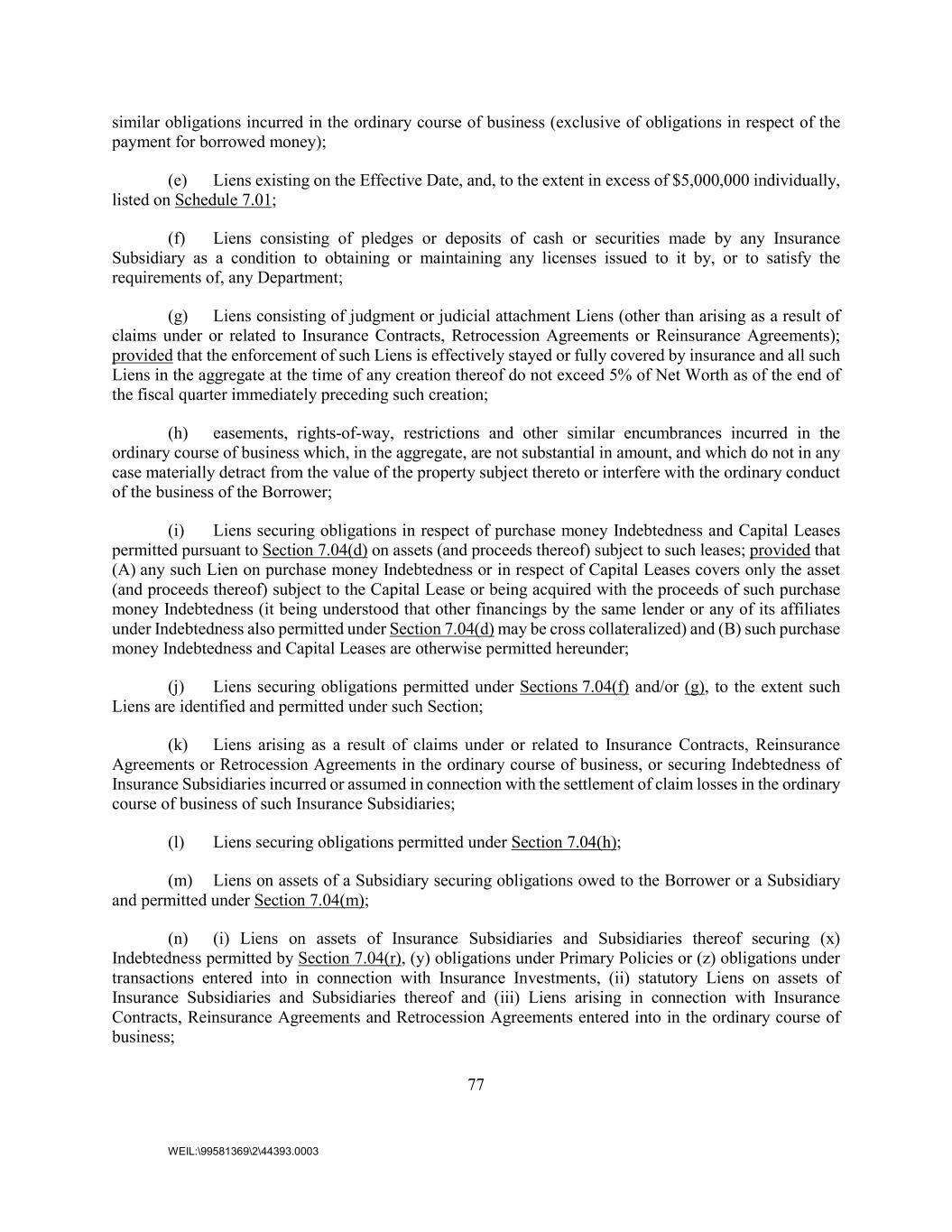 77 WEIL:\99581369\2\44393.0003 similar obligations incurred in the ordinary course of business (exclusive of obligations in respect of the payment for borrowed money); (e) Liens existing on the Effective Date, and, to the extent in excess of $5,000,000 individually, listed on Schedule 7.01; (f) Liens consisting of pledges or deposits of cash or securities made by any Insurance Subsidiary as a condition to obtaining or maintaining any licenses issued to it by, or to satisfy the requirements of, any Department; (g) Liens consisting of judgment or judicial attachment Liens (other than arising as a result of claims under or related to Insurance Contracts, Retrocession Agreements or Reinsurance Agreements); provided that the enforcement of such Liens is effectively stayed or fully covered by insurance and all such Liens in the aggregate at the time of any creation thereof do not exceed 5% of Net Worth as of the end of the fiscal quarter immediately preceding such creation; (h) easements, rights-of-way, restrictions and other similar encumbrances incurred in the ordinary course of business which, in the aggregate, are not substantial in amount, and which do not in any case materially detract from the value of the property subject thereto or interfere with the ordinary conduct of the business of the Borrower; (i) Liens securing obligations in respect of purchase money Indebtedness and Capital Leases permitted pursuant to Section 7.04(d) on assets (and proceeds thereof) subject to such leases; provided that (A) any such Lien on purchase money Indebtedness or in respect of Capital Leases covers only the asset (and proceeds thereof) subject to the Capital Lease or being acquired with the proceeds of such purchase money Indebtedness (it being understood that other financings by the same lender or any of its affiliates under Indebtedness also permitted under Section 7.04(d) may be cross collateralized) and (B) such purchase money Indebtedness and Capital Leases are otherwise permitted hereunder; (j) Liens securing obligations permitted under Sections 7.04(f) and/or (g), to the extent such Liens are identified and permitted under such Section; (k) Liens arising as a result of claims under or related to Insurance Contracts, Reinsurance Agreements or Retrocession Agreements in the ordinary course of business, or securing Indebtedness of Insurance Subsidiaries incurred or assumed in connection with the settlement of claim losses in the ordinary course of business of such Insurance Subsidiaries; (l) Liens securing obligations permitted under Section 7.04(h); (m) Liens on assets of a Subsidiary securing obligations owed to the Borrower or a Subsidiary and permitted under Section 7.04(m); (n) (i) Liens on assets of Insurance Subsidiaries and Subsidiaries thereof securing (x) Indebtedness permitted by Section 7.04(r), (y) obligations under Primary Policies or (z) obligations under transactions entered into in connection with Insurance Investments, (ii) statutory Liens on assets of Insurance Subsidiaries and Subsidiaries thereof and (iii) Liens arising in connection with Insurance Contracts, Reinsurance Agreements and Retrocession Agreements entered into in the ordinary course of business;