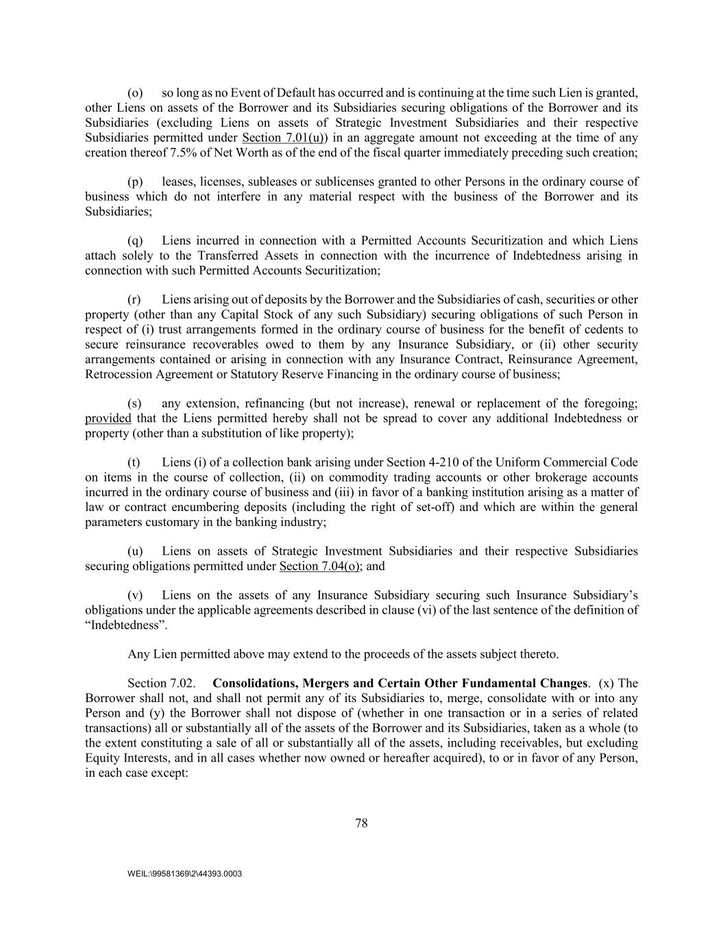 78 WEIL:\99581369\2\44393.0003 (o) so long as no Event of Default has occurred and is continuing at the time such Lien is granted, other Liens on assets of the Borrower and its Subsidiaries securing obligations of the Borrower and its Subsidiaries (excluding Liens on assets of Strategic Investment Subsidiaries and their respective Subsidiaries permitted under Section 7.01(u)) in an aggregate amount not exceeding at the time of any creation thereof 7.5% of Net Worth as of the end of the fiscal quarter immediately preceding such creation; (p) leases, licenses, subleases or sublicenses granted to other Persons in the ordinary course of business which do not interfere in any material respect with the business of the Borrower and its Subsidiaries; (q) Liens incurred in connection with a Permitted Accounts Securitization and which Liens attach solely to the Transferred Assets in connection with the incurrence of Indebtedness arising in connection with such Permitted Accounts Securitization; (r) Liens arising out of deposits by the Borrower and the Subsidiaries of cash, securities or other property (other than any Capital Stock of any such Subsidiary) securing obligations of such Person in respect of (i) trust arrangements formed in the ordinary course of business for the benefit of cedents to secure reinsurance recoverables owed to them by any Insurance Subsidiary, or (ii) other security arrangements contained or arising in connection with any Insurance Contract, Reinsurance Agreement, Retrocession Agreement or Statutory Reserve Financing in the ordinary course of business; (s) any extension, refinancing (but not increase), renewal or replacement of the foregoing; provided that the Liens permitted hereby shall not be spread to cover any additional Indebtedness or property (other than a substitution of like property); (t) Liens (i) of a collection bank arising under Section 4-210 of the Uniform Commercial Code on items in the course of collection, (ii) on commodity trading accounts or other brokerage accounts incurred in the ordinary course of business and (iii) in favor of a banking institution arising as a matter of law or contract encumbering deposits (including the right of set-off) and which are within the general parameters customary in the banking industry; (u) Liens on assets of Strategic Investment Subsidiaries and their respective Subsidiaries securing obligations permitted under Section 7.04(o); and (v) Liens on the assets of any Insurance Subsidiary securing such Insurance Subsidiary’s obligations under the applicable agreements described in clause (vi) of the last sentence of the definition of “Indebtedness”. Any Lien permitted above may extend to the proceeds of the assets subject thereto. Section 7.02. Consolidations, Mergers and Certain Other Fundamental Changes. (x) The Borrower shall not, and shall not permit any of its Subsidiaries to, merge, consolidate with or into any Person and (y) the Borrower shall not dispose of (whether in one transaction or in a series of related transactions) all or substantially all of the assets of the Borrower and its Subsidiaries, taken as a whole (to the extent constituting a sale of all or substantially all of the assets, including receivables, but excluding Equity Interests, and in all cases whether now owned or hereafter acquired), to or in favor of any Person, in each case except: