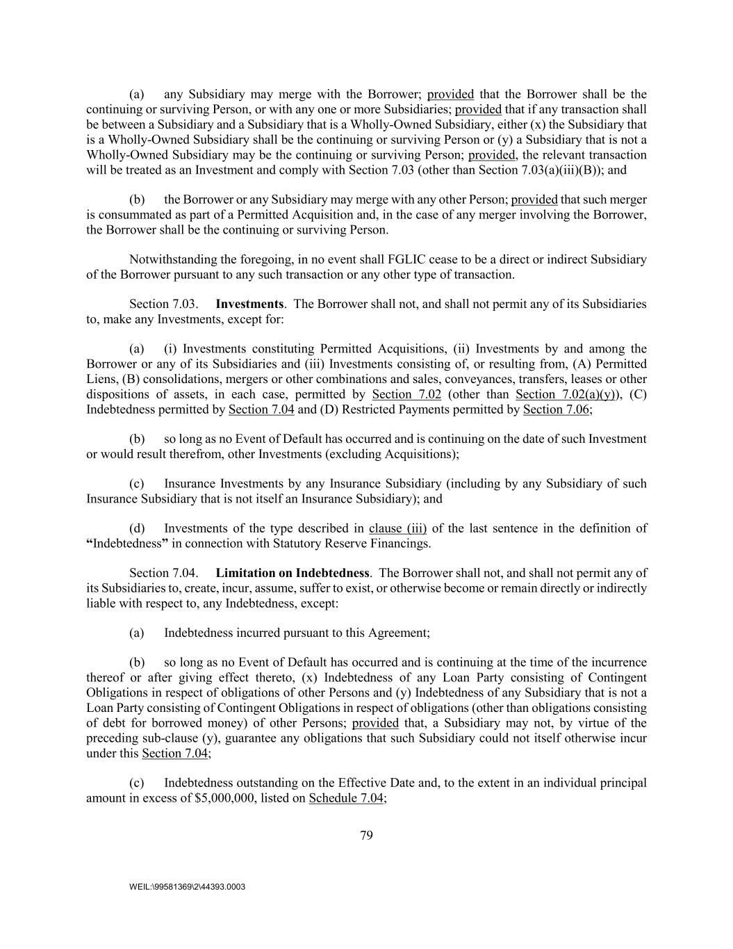 79 WEIL:\99581369\2\44393.0003 (a) any Subsidiary may merge with the Borrower; provided that the Borrower shall be the continuing or surviving Person, or with any one or more Subsidiaries; provided that if any transaction shall be between a Subsidiary and a Subsidiary that is a Wholly-Owned Subsidiary, either (x) the Subsidiary that is a Wholly-Owned Subsidiary shall be the continuing or surviving Person or (y) a Subsidiary that is not a Wholly-Owned Subsidiary may be the continuing or surviving Person; provided, the relevant transaction will be treated as an Investment and comply with Section 7.03 (other than Section 7.03(a)(iii)(B)); and (b) the Borrower or any Subsidiary may merge with any other Person; provided that such merger is consummated as part of a Permitted Acquisition and, in the case of any merger involving the Borrower, the Borrower shall be the continuing or surviving Person. Notwithstanding the foregoing, in no event shall FGLIC cease to be a direct or indirect Subsidiary of the Borrower pursuant to any such transaction or any other type of transaction. Section 7.03. Investments. The Borrower shall not, and shall not permit any of its Subsidiaries to, make any Investments, except for: (a) (i) Investments constituting Permitted Acquisitions, (ii) Investments by and among the Borrower or any of its Subsidiaries and (iii) Investments consisting of, or resulting from, (A) Permitted Liens, (B) consolidations, mergers or other combinations and sales, conveyances, transfers, leases or other dispositions of assets, in each case, permitted by Section 7.02 (other than Section 7.02(a)(y)), (C) Indebtedness permitted by Section 7.04 and (D) Restricted Payments permitted by Section 7.06; (b) so long as no Event of Default has occurred and is continuing on the date of such Investment or would result therefrom, other Investments (excluding Acquisitions); (c) Insurance Investments by any Insurance Subsidiary (including by any Subsidiary of such Insurance Subsidiary that is not itself an Insurance Subsidiary); and (d) Investments of the type described in clause (iii) of the last sentence in the definition of “Indebtedness” in connection with Statutory Reserve Financings. Section 7.04. Limitation on Indebtedness. The Borrower shall not, and shall not permit any of its Subsidiaries to, create, incur, assume, suffer to exist, or otherwise become or remain directly or indirectly liable with respect to, any Indebtedness, except: (a) Indebtedness incurred pursuant to this Agreement; (b) so long as no Event of Default has occurred and is continuing at the time of the incurrence thereof or after giving effect thereto, (x) Indebtedness of any Loan Party consisting of Contingent Obligations in respect of obligations of other Persons and (y) Indebtedness of any Subsidiary that is not a Loan Party consisting of Contingent Obligations in respect of obligations (other than obligations consisting of debt for borrowed money) of other Persons; provided that, a Subsidiary may not, by virtue of the preceding sub-clause (y), guarantee any obligations that such Subsidiary could not itself otherwise incur under this Section 7.04; (c) Indebtedness outstanding on the Effective Date and, to the extent in an individual principal amount in excess of $5,000,000, listed on Schedule 7.04;