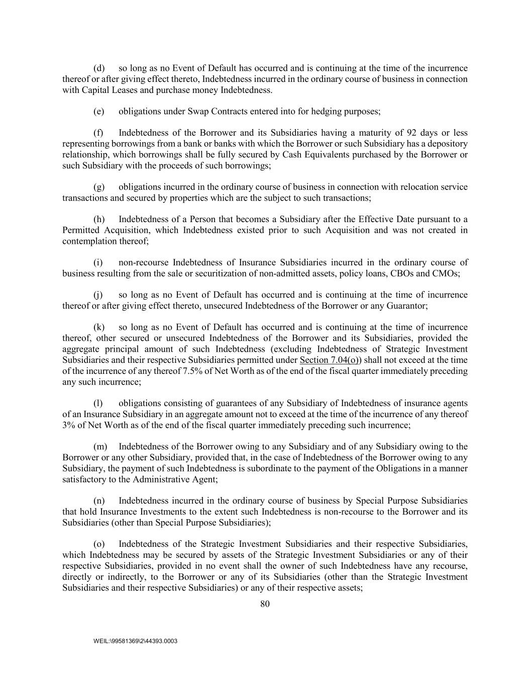 80 WEIL:\99581369\2\44393.0003 (d) so long as no Event of Default has occurred and is continuing at the time of the incurrence thereof or after giving effect thereto, Indebtedness incurred in the ordinary course of business in connection with Capital Leases and purchase money Indebtedness. (e) obligations under Swap Contracts entered into for hedging purposes; (f) Indebtedness of the Borrower and its Subsidiaries having a maturity of 92 days or less representing borrowings from a bank or banks with which the Borrower or such Subsidiary has a depository relationship, which borrowings shall be fully secured by Cash Equivalents purchased by the Borrower or such Subsidiary with the proceeds of such borrowings; (g) obligations incurred in the ordinary course of business in connection with relocation service transactions and secured by properties which are the subject to such transactions; (h) Indebtedness of a Person that becomes a Subsidiary after the Effective Date pursuant to a Permitted Acquisition, which Indebtedness existed prior to such Acquisition and was not created in contemplation thereof; (i) non-recourse Indebtedness of Insurance Subsidiaries incurred in the ordinary course of business resulting from the sale or securitization of non-admitted assets, policy loans, CBOs and CMOs; (j) so long as no Event of Default has occurred and is continuing at the time of incurrence thereof or after giving effect thereto, unsecured Indebtedness of the Borrower or any Guarantor; (k) so long as no Event of Default has occurred and is continuing at the time of incurrence thereof, other secured or unsecured Indebtedness of the Borrower and its Subsidiaries, provided the aggregate principal amount of such Indebtedness (excluding Indebtedness of Strategic Investment Subsidiaries and their respective Subsidiaries permitted under Section 7.04(o)) shall not exceed at the time of the incurrence of any thereof 7.5% of Net Worth as of the end of the fiscal quarter immediately preceding any such incurrence; (l) obligations consisting of guarantees of any Subsidiary of Indebtedness of insurance agents of an Insurance Subsidiary in an aggregate amount not to exceed at the time of the incurrence of any thereof 3% of Net Worth as of the end of the fiscal quarter immediately preceding such incurrence; (m) Indebtedness of the Borrower owing to any Subsidiary and of any Subsidiary owing to the Borrower or any other Subsidiary, provided that, in the case of Indebtedness of the Borrower owing to any Subsidiary, the payment of such Indebtedness is subordinate to the payment of the Obligations in a manner satisfactory to the Administrative Agent; (n) Indebtedness incurred in the ordinary course of business by Special Purpose Subsidiaries that hold Insurance Investments to the extent such Indebtedness is non-recourse to the Borrower and its Subsidiaries (other than Special Purpose Subsidiaries); (o) Indebtedness of the Strategic Investment Subsidiaries and their respective Subsidiaries, which Indebtedness may be secured by assets of the Strategic Investment Subsidiaries or any of their respective Subsidiaries, provided in no event shall the owner of such Indebtedness have any recourse, directly or indirectly, to the Borrower or any of its Subsidiaries (other than the Strategic Investment Subsidiaries and their respective Subsidiaries) or any of their respective assets;