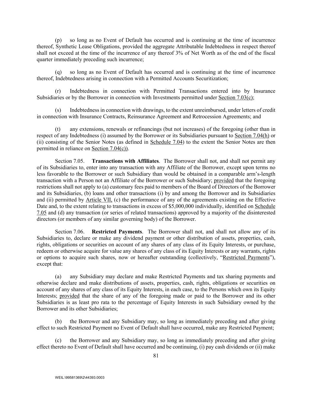 81 WEIL:\99581369\2\44393.0003 (p) so long as no Event of Default has occurred and is continuing at the time of incurrence thereof, Synthetic Lease Obligations, provided the aggregate Attributable Indebtedness in respect thereof shall not exceed at the time of the incurrence of any thereof 3% of Net Worth as of the end of the fiscal quarter immediately preceding such incurrence; (q) so long as no Event of Default has occurred and is continuing at the time of incurrence thereof, Indebtedness arising in connection with a Permitted Accounts Securitization; (r) Indebtedness in connection with Permitted Transactions entered into by Insurance Subsidiaries or by the Borrower in connection with Investments permitted under Section 7.03(c); (s) Indebtedness in connection with drawings, to the extent unreimbursed, under letters of credit in connection with Insurance Contracts, Reinsurance Agreement and Retrocession Agreements; and (t) any extensions, renewals or refinancings (but not increases) of the foregoing (other than in respect of any Indebtedness (i) assumed by the Borrower or its Subsidiaries pursuant to Section 7.04(h) or (ii) consisting of the Senior Notes (as defined in Schedule 7.04) to the extent the Senior Notes are then permitted in reliance on Section 7.04(c)). Section 7.05. Transactions with Affiliates. The Borrower shall not, and shall not permit any of its Subsidiaries to, enter into any transaction with any Affiliate of the Borrower, except upon terms no less favorable to the Borrower or such Subsidiary than would be obtained in a comparable arm’s-length transaction with a Person not an Affiliate of the Borrower or such Subsidiary; provided that the foregoing restrictions shall not apply to (a) customary fees paid to members of the Board of Directors of the Borrower and its Subsidiaries, (b) loans and other transactions (i) by and among the Borrower and its Subsidiaries and (ii) permitted by Article VII, (c) the performance of any of the agreements existing on the Effective Date and, to the extent relating to transactions in excess of $5,000,000 individually, identified on Schedule 7.05 and (d) any transaction (or series of related transactions) approved by a majority of the disinterested directors (or members of any similar governing body) of the Borrower. Section 7.06. Restricted Payments. The Borrower shall not, and shall not allow any of its Subsidiaries to, declare or make any dividend payment or other distribution of assets, properties, cash, rights, obligations or securities on account of any shares of any class of its Equity Interests, or purchase, redeem or otherwise acquire for value any shares of any class of its Equity Interests or any warrants, rights or options to acquire such shares, now or hereafter outstanding (collectively, “Restricted Payments”), except that: (a) any Subsidiary may declare and make Restricted Payments and tax sharing payments and otherwise declare and make distributions of assets, properties, cash, rights, obligations or securities on account of any shares of any class of its Equity Interests, in each case, to the Persons which own its Equity Interests; provided that the share of any of the foregoing made or paid to the Borrower and its other Subsidiaries is as least pro rata to the percentage of Equity Interests in such Subsidiary owned by the Borrower and its other Subsidiaries; (b) the Borrower and any Subsidiary may, so long as immediately preceding and after giving effect to such Restricted Payment no Event of Default shall have occurred, make any Restricted Payment; (c) the Borrower and any Subsidiary may, so long as immediately preceding and after giving effect thereto no Event of Default shall have occurred and be continuing, (i) pay cash dividends or (ii) make