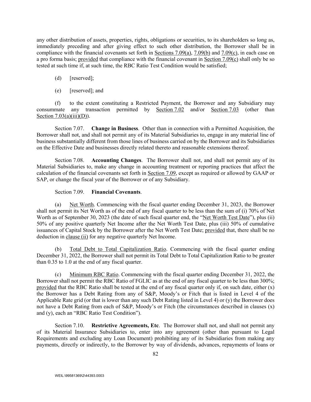 82 WEIL:\99581369\2\44393.0003 any other distribution of assets, properties, rights, obligations or securities, to its shareholders so long as, immediately preceding and after giving effect to such other distribution, the Borrower shall be in compliance with the financial covenants set forth in Sections 7.09(a), 7.09(b) and 7.09(c), in each case on a pro forma basis; provided that compliance with the financial covenant in Section 7.09(c) shall only be so tested at such time if, at such time, the RBC Ratio Test Condition would be satisfied; (d) [reserved]; (e) [reserved]; and (f) to the extent constituting a Restricted Payment, the Borrower and any Subsidiary may consummate any transaction permitted by Section 7.02 and/or Section 7.03 (other than Section 7.03(a)(iii)(D)). Section 7.07. Change in Business. Other than in connection with a Permitted Acquisition, the Borrower shall not, and shall not permit any of its Material Subsidiaries to, engage in any material line of business substantially different from those lines of business carried on by the Borrower and its Subsidiaries on the Effective Date and businesses directly related thereto and reasonable extensions thereof. Section 7.08. Accounting Changes. The Borrower shall not, and shall not permit any of its Material Subsidiaries to, make any change in accounting treatment or reporting practices that affect the calculation of the financial covenants set forth in Section 7.09, except as required or allowed by GAAP or SAP, or change the fiscal year of the Borrower or of any Subsidiary. Section 7.09. Financial Covenants. (a) Net Worth. Commencing with the fiscal quarter ending December 31, 2023, the Borrower shall not permit its Net Worth as of the end of any fiscal quarter to be less than the sum of (i) 70% of Net Worth as of September 30, 2023 (the date of such fiscal quarter end, the “Net Worth Test Date”), plus (ii) 50% of any positive quarterly Net Income after the Net Worth Test Date, plus (iii) 50% of cumulative issuances of Capital Stock by the Borrower after the Net Worth Test Date; provided that, there shall be no deduction in clause (ii) for any negative quarterly Net Income. (b) Total Debt to Total Capitalization Ratio. Commencing with the fiscal quarter ending December 31, 2022, the Borrower shall not permit its Total Debt to Total Capitalization Ratio to be greater than 0.35 to 1.0 at the end of any fiscal quarter. (c) Minimum RBC Ratio. Commencing with the fiscal quarter ending December 31, 2022, the Borrower shall not permit the RBC Ratio of FGLIC as at the end of any fiscal quarter to be less than 300%; provided that the RBC Ratio shall be tested at the end of any fiscal quarter only if, on such date, either (x) the Borrower has a Debt Rating from any of S&P, Moody’s or Fitch that is listed in Level 4 of the Applicable Rate grid (or that is lower than any such Debt Rating listed in Level 4) or (y) the Borrower does not have a Debt Rating from each of S&P, Moody’s or Fitch (the circumstances described in clauses (x) and (y), each an “RBC Ratio Test Condition”). Section 7.10. Restrictive Agreements, Etc. The Borrower shall not, and shall not permit any of its Material Insurance Subsidiaries to, enter into any agreement (other than pursuant to Legal Requirements and excluding any Loan Document) prohibiting any of its Subsidiaries from making any payments, directly or indirectly, to the Borrower by way of dividends, advances, repayments of loans or