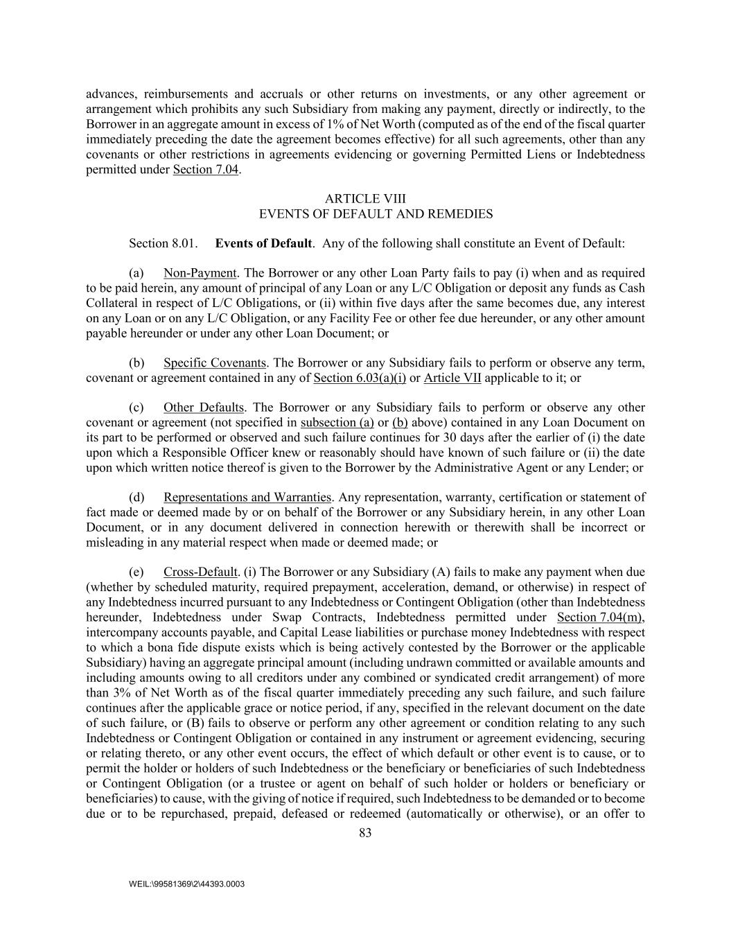 83 WEIL:\99581369\2\44393.0003 advances, reimbursements and accruals or other returns on investments, or any other agreement or arrangement which prohibits any such Subsidiary from making any payment, directly or indirectly, to the Borrower in an aggregate amount in excess of 1% of Net Worth (computed as of the end of the fiscal quarter immediately preceding the date the agreement becomes effective) for all such agreements, other than any covenants or other restrictions in agreements evidencing or governing Permitted Liens or Indebtedness permitted under Section 7.04. ARTICLE VIII EVENTS OF DEFAULT AND REMEDIES Section 8.01. Events of Default. Any of the following shall constitute an Event of Default: (a) Non-Payment. The Borrower or any other Loan Party fails to pay (i) when and as required to be paid herein, any amount of principal of any Loan or any L/C Obligation or deposit any funds as Cash Collateral in respect of L/C Obligations, or (ii) within five days after the same becomes due, any interest on any Loan or on any L/C Obligation, or any Facility Fee or other fee due hereunder, or any other amount payable hereunder or under any other Loan Document; or (b) Specific Covenants. The Borrower or any Subsidiary fails to perform or observe any term, covenant or agreement contained in any of Section 6.03(a)(i) or Article VII applicable to it; or (c) Other Defaults. The Borrower or any Subsidiary fails to perform or observe any other covenant or agreement (not specified in subsection (a) or (b) above) contained in any Loan Document on its part to be performed or observed and such failure continues for 30 days after the earlier of (i) the date upon which a Responsible Officer knew or reasonably should have known of such failure or (ii) the date upon which written notice thereof is given to the Borrower by the Administrative Agent or any Lender; or (d) Representations and Warranties. Any representation, warranty, certification or statement of fact made or deemed made by or on behalf of the Borrower or any Subsidiary herein, in any other Loan Document, or in any document delivered in connection herewith or therewith shall be incorrect or misleading in any material respect when made or deemed made; or (e) Cross-Default. (i) The Borrower or any Subsidiary (A) fails to make any payment when due (whether by scheduled maturity, required prepayment, acceleration, demand, or otherwise) in respect of any Indebtedness incurred pursuant to any Indebtedness or Contingent Obligation (other than Indebtedness hereunder, Indebtedness under Swap Contracts, Indebtedness permitted under Section 7.04(m), intercompany accounts payable, and Capital Lease liabilities or purchase money Indebtedness with respect to which a bona fide dispute exists which is being actively contested by the Borrower or the applicable Subsidiary) having an aggregate principal amount (including undrawn committed or available amounts and including amounts owing to all creditors under any combined or syndicated credit arrangement) of more than 3% of Net Worth as of the fiscal quarter immediately preceding any such failure, and such failure continues after the applicable grace or notice period, if any, specified in the relevant document on the date of such failure, or (B) fails to observe or perform any other agreement or condition relating to any such Indebtedness or Contingent Obligation or contained in any instrument or agreement evidencing, securing or relating thereto, or any other event occurs, the effect of which default or other event is to cause, or to permit the holder or holders of such Indebtedness or the beneficiary or beneficiaries of such Indebtedness or Contingent Obligation (or a trustee or agent on behalf of such holder or holders or beneficiary or beneficiaries) to cause, with the giving of notice if required, such Indebtedness to be demanded or to become due or to be repurchased, prepaid, defeased or redeemed (automatically or otherwise), or an offer to
