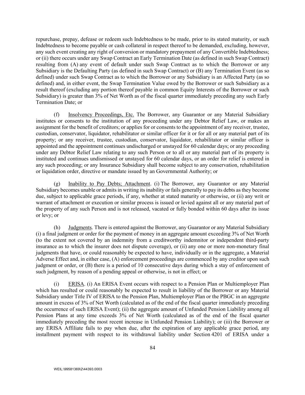 84 WEIL:\99581369\2\44393.0003 repurchase, prepay, defease or redeem such Indebtedness to be made, prior to its stated maturity, or such Indebtedness to become payable or cash collateral in respect thereof to be demanded, excluding, however, any such event creating any right of conversion or mandatory prepayment of any Convertible Indebtedness; or (ii) there occurs under any Swap Contract an Early Termination Date (as defined in such Swap Contract) resulting from (A) any event of default under such Swap Contract as to which the Borrower or any Subsidiary is the Defaulting Party (as defined in such Swap Contract) or (B) any Termination Event (as so defined) under such Swap Contract as to which the Borrower or any Subsidiary is an Affected Party (as so defined) and, in either event, the Swap Termination Value owed by the Borrower or such Subsidiary as a result thereof (excluding any portion thereof payable in common Equity Interests of the Borrower or such Subsidiary) is greater than 3% of Net Worth as of the fiscal quarter immediately preceding any such Early Termination Date; or (f) Insolvency Proceedings, Etc. The Borrower, any Guarantor or any Material Subsidiary institutes or consents to the institution of any proceeding under any Debtor Relief Law, or makes an assignment for the benefit of creditors; or applies for or consents to the appointment of any receiver, trustee, custodian, conservator, liquidator, rehabilitator or similar officer for it or for all or any material part of its property; or any receiver, trustee, custodian, conservator, liquidator, rehabilitator or similar officer is appointed and the appointment continues undischarged or unstayed for 60 calendar days; or any proceeding under any Debtor Relief Law relating to any such Person or to all or any material part of its property is instituted and continues undismissed or unstayed for 60 calendar days, or an order for relief is entered in any such proceeding; or any Insurance Subsidiary shall become subject to any conservation, rehabilitation or liquidation order, directive or mandate issued by an Governmental Authority; or (g) Inability to Pay Debts; Attachment. (i) The Borrower, any Guarantor or any Material Subsidiary becomes unable or admits in writing its inability or fails generally to pay its debts as they become due, subject to applicable grace periods, if any, whether at stated maturity or otherwise, or (ii) any writ or warrant of attachment or execution or similar process is issued or levied against all or any material part of the property of any such Person and is not released, vacated or fully bonded within 60 days after its issue or levy; or (h) Judgments. There is entered against the Borrower, any Guarantor or any Material Subsidiary (i) a final judgment or order for the payment of money in an aggregate amount exceeding 3% of Net Worth (to the extent not covered by an indemnity from a creditworthy indemnitor or independent third-party insurance as to which the insurer does not dispute coverage), or (ii) any one or more non-monetary final judgments that have, or could reasonably be expected to have, individually or in the aggregate, a Material Adverse Effect and, in either case, (A) enforcement proceedings are commenced by any creditor upon such judgment or order, or (B) there is a period of 10 consecutive days during which a stay of enforcement of such judgment, by reason of a pending appeal or otherwise, is not in effect; or (i) ERISA. (i) An ERISA Event occurs with respect to a Pension Plan or Multiemployer Plan which has resulted or could reasonably be expected to result in liability of the Borrower or any Material Subsidiary under Title IV of ERISA to the Pension Plan, Multiemployer Plan or the PBGC in an aggregate amount in excess of 3% of Net Worth (calculated as of the end of the fiscal quarter immediately preceding the occurrence of such ERISA Event); (ii) the aggregate amount of Unfunded Pension Liability among all Pension Plans at any time exceeds 3% of Net Worth (calculated as of the end of the fiscal quarter immediately preceding the most recent increase in Unfunded Pension Liability); or (iii) the Borrower or any ERISA Affiliate fails to pay when due, after the expiration of any applicable grace period, any installment payment with respect to its withdrawal liability under Section 4201 of ERISA under a