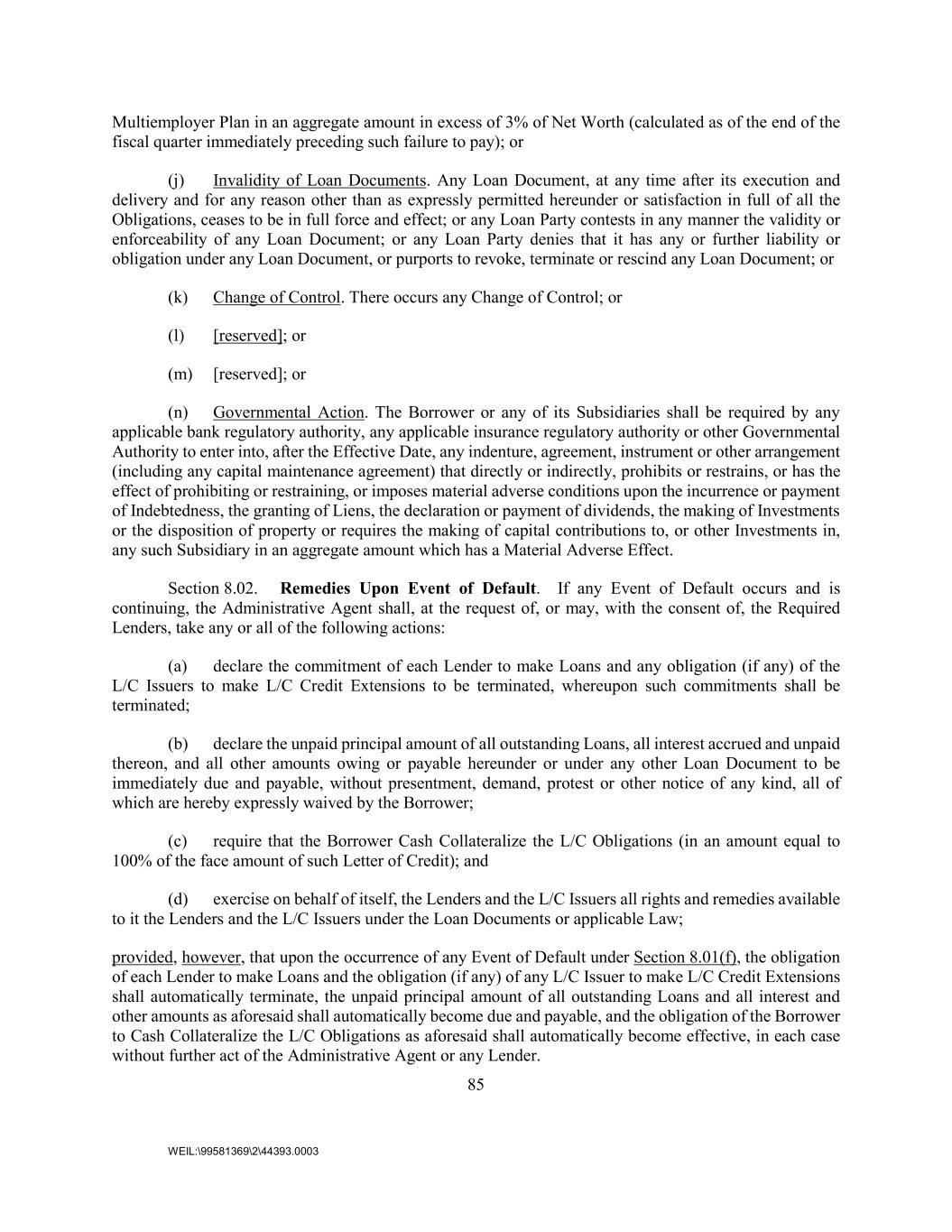 85 WEIL:\99581369\2\44393.0003 Multiemployer Plan in an aggregate amount in excess of 3% of Net Worth (calculated as of the end of the fiscal quarter immediately preceding such failure to pay); or (j) Invalidity of Loan Documents. Any Loan Document, at any time after its execution and delivery and for any reason other than as expressly permitted hereunder or satisfaction in full of all the Obligations, ceases to be in full force and effect; or any Loan Party contests in any manner the validity or enforceability of any Loan Document; or any Loan Party denies that it has any or further liability or obligation under any Loan Document, or purports to revoke, terminate or rescind any Loan Document; or (k) Change of Control. There occurs any Change of Control; or (l) [reserved]; or (m) [reserved]; or (n) Governmental Action. The Borrower or any of its Subsidiaries shall be required by any applicable bank regulatory authority, any applicable insurance regulatory authority or other Governmental Authority to enter into, after the Effective Date, any indenture, agreement, instrument or other arrangement (including any capital maintenance agreement) that directly or indirectly, prohibits or restrains, or has the effect of prohibiting or restraining, or imposes material adverse conditions upon the incurrence or payment of Indebtedness, the granting of Liens, the declaration or payment of dividends, the making of Investments or the disposition of property or requires the making of capital contributions to, or other Investments in, any such Subsidiary in an aggregate amount which has a Material Adverse Effect. Section 8.02. Remedies Upon Event of Default. If any Event of Default occurs and is continuing, the Administrative Agent shall, at the request of, or may, with the consent of, the Required Lenders, take any or all of the following actions: (a) declare the commitment of each Lender to make Loans and any obligation (if any) of the L/C Issuers to make L/C Credit Extensions to be terminated, whereupon such commitments shall be terminated; (b) declare the unpaid principal amount of all outstanding Loans, all interest accrued and unpaid thereon, and all other amounts owing or payable hereunder or under any other Loan Document to be immediately due and payable, without presentment, demand, protest or other notice of any kind, all of which are hereby expressly waived by the Borrower; (c) require that the Borrower Cash Collateralize the L/C Obligations (in an amount equal to 100% of the face amount of such Letter of Credit); and (d) exercise on behalf of itself, the Lenders and the L/C Issuers all rights and remedies available to it the Lenders and the L/C Issuers under the Loan Documents or applicable Law; provided, however, that upon the occurrence of any Event of Default under Section 8.01(f), the obligation of each Lender to make Loans and the obligation (if any) of any L/C Issuer to make L/C Credit Extensions shall automatically terminate, the unpaid principal amount of all outstanding Loans and all interest and other amounts as aforesaid shall automatically become due and payable, and the obligation of the Borrower to Cash Collateralize the L/C Obligations as aforesaid shall automatically become effective, in each case without further act of the Administrative Agent or any Lender.