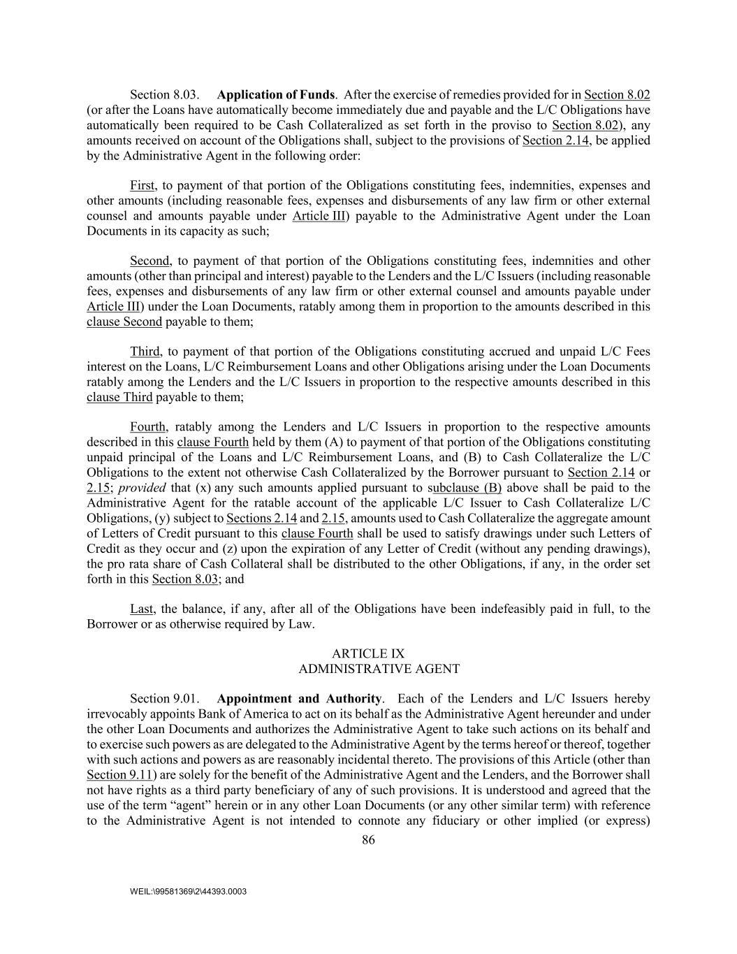 86 WEIL:\99581369\2\44393.0003 Section 8.03. Application of Funds. After the exercise of remedies provided for in Section 8.02 (or after the Loans have automatically become immediately due and payable and the L/C Obligations have automatically been required to be Cash Collateralized as set forth in the proviso to Section 8.02), any amounts received on account of the Obligations shall, subject to the provisions of Section 2.14, be applied by the Administrative Agent in the following order: First, to payment of that portion of the Obligations constituting fees, indemnities, expenses and other amounts (including reasonable fees, expenses and disbursements of any law firm or other external counsel and amounts payable under Article III) payable to the Administrative Agent under the Loan Documents in its capacity as such; Second, to payment of that portion of the Obligations constituting fees, indemnities and other amounts (other than principal and interest) payable to the Lenders and the L/C Issuers (including reasonable fees, expenses and disbursements of any law firm or other external counsel and amounts payable under Article III) under the Loan Documents, ratably among them in proportion to the amounts described in this clause Second payable to them; Third, to payment of that portion of the Obligations constituting accrued and unpaid L/C Fees interest on the Loans, L/C Reimbursement Loans and other Obligations arising under the Loan Documents ratably among the Lenders and the L/C Issuers in proportion to the respective amounts described in this clause Third payable to them; Fourth, ratably among the Lenders and L/C Issuers in proportion to the respective amounts described in this clause Fourth held by them (A) to payment of that portion of the Obligations constituting unpaid principal of the Loans and L/C Reimbursement Loans, and (B) to Cash Collateralize the L/C Obligations to the extent not otherwise Cash Collateralized by the Borrower pursuant to Section 2.14 or 2.15; provided that (x) any such amounts applied pursuant to subclause (B) above shall be paid to the Administrative Agent for the ratable account of the applicable L/C Issuer to Cash Collateralize L/C Obligations, (y) subject to Sections 2.14 and 2.15, amounts used to Cash Collateralize the aggregate amount of Letters of Credit pursuant to this clause Fourth shall be used to satisfy drawings under such Letters of Credit as they occur and (z) upon the expiration of any Letter of Credit (without any pending drawings), the pro rata share of Cash Collateral shall be distributed to the other Obligations, if any, in the order set forth in this Section 8.03; and Last, the balance, if any, after all of the Obligations have been indefeasibly paid in full, to the Borrower or as otherwise required by Law. ARTICLE IX ADMINISTRATIVE AGENT Section 9.01. Appointment and Authority. Each of the Lenders and L/C Issuers hereby irrevocably appoints Bank of America to act on its behalf as the Administrative Agent hereunder and under the other Loan Documents and authorizes the Administrative Agent to take such actions on its behalf and to exercise such powers as are delegated to the Administrative Agent by the terms hereof or thereof, together with such actions and powers as are reasonably incidental thereto. The provisions of this Article (other than Section 9.11) are solely for the benefit of the Administrative Agent and the Lenders, and the Borrower shall not have rights as a third party beneficiary of any of such provisions. It is understood and agreed that the use of the term “agent” herein or in any other Loan Documents (or any other similar term) with reference to the Administrative Agent is not intended to connote any fiduciary or other implied (or express)