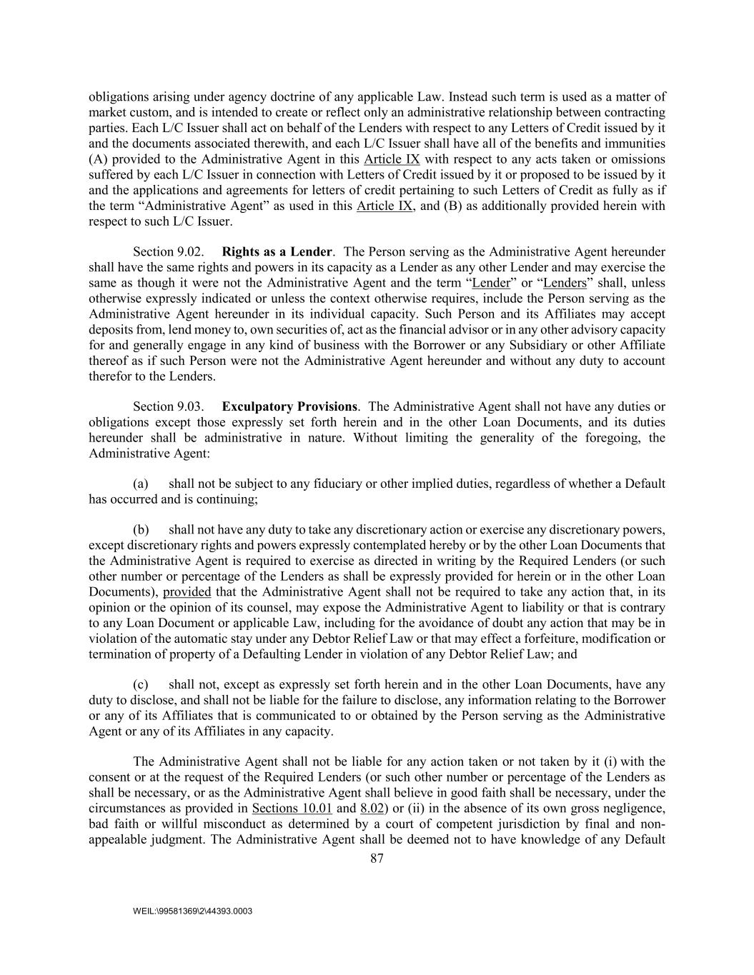 87 WEIL:\99581369\2\44393.0003 obligations arising under agency doctrine of any applicable Law. Instead such term is used as a matter of market custom, and is intended to create or reflect only an administrative relationship between contracting parties. Each L/C Issuer shall act on behalf of the Lenders with respect to any Letters of Credit issued by it and the documents associated therewith, and each L/C Issuer shall have all of the benefits and immunities (A) provided to the Administrative Agent in this Article IX with respect to any acts taken or omissions suffered by each L/C Issuer in connection with Letters of Credit issued by it or proposed to be issued by it and the applications and agreements for letters of credit pertaining to such Letters of Credit as fully as if the term “Administrative Agent” as used in this Article IX, and (B) as additionally provided herein with respect to such L/C Issuer. Section 9.02. Rights as a Lender. The Person serving as the Administrative Agent hereunder shall have the same rights and powers in its capacity as a Lender as any other Lender and may exercise the same as though it were not the Administrative Agent and the term “Lender” or “Lenders” shall, unless otherwise expressly indicated or unless the context otherwise requires, include the Person serving as the Administrative Agent hereunder in its individual capacity. Such Person and its Affiliates may accept deposits from, lend money to, own securities of, act as the financial advisor or in any other advisory capacity for and generally engage in any kind of business with the Borrower or any Subsidiary or other Affiliate thereof as if such Person were not the Administrative Agent hereunder and without any duty to account therefor to the Lenders. Section 9.03. Exculpatory Provisions. The Administrative Agent shall not have any duties or obligations except those expressly set forth herein and in the other Loan Documents, and its duties hereunder shall be administrative in nature. Without limiting the generality of the foregoing, the Administrative Agent: (a) shall not be subject to any fiduciary or other implied duties, regardless of whether a Default has occurred and is continuing; (b) shall not have any duty to take any discretionary action or exercise any discretionary powers, except discretionary rights and powers expressly contemplated hereby or by the other Loan Documents that the Administrative Agent is required to exercise as directed in writing by the Required Lenders (or such other number or percentage of the Lenders as shall be expressly provided for herein or in the other Loan Documents), provided that the Administrative Agent shall not be required to take any action that, in its opinion or the opinion of its counsel, may expose the Administrative Agent to liability or that is contrary to any Loan Document or applicable Law, including for the avoidance of doubt any action that may be in violation of the automatic stay under any Debtor Relief Law or that may effect a forfeiture, modification or termination of property of a Defaulting Lender in violation of any Debtor Relief Law; and (c) shall not, except as expressly set forth herein and in the other Loan Documents, have any duty to disclose, and shall not be liable for the failure to disclose, any information relating to the Borrower or any of its Affiliates that is communicated to or obtained by the Person serving as the Administrative Agent or any of its Affiliates in any capacity. The Administrative Agent shall not be liable for any action taken or not taken by it (i) with the consent or at the request of the Required Lenders (or such other number or percentage of the Lenders as shall be necessary, or as the Administrative Agent shall believe in good faith shall be necessary, under the circumstances as provided in Sections 10.01 and 8.02) or (ii) in the absence of its own gross negligence, bad faith or willful misconduct as determined by a court of competent jurisdiction by final and non- appealable judgment. The Administrative Agent shall be deemed not to have knowledge of any Default