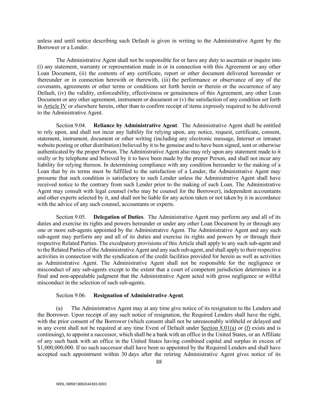 88 WEIL:\99581369\2\44393.0003 unless and until notice describing such Default is given in writing to the Administrative Agent by the Borrower or a Lender. The Administrative Agent shall not be responsible for or have any duty to ascertain or inquire into (i) any statement, warranty or representation made in or in connection with this Agreement or any other Loan Document, (ii) the contents of any certificate, report or other document delivered hereunder or thereunder or in connection herewith or therewith, (iii) the performance or observance of any of the covenants, agreements or other terms or conditions set forth herein or therein or the occurrence of any Default, (iv) the validity, enforceability, effectiveness or genuineness of this Agreement, any other Loan Document or any other agreement, instrument or document or (v) the satisfaction of any condition set forth in Article IV or elsewhere herein, other than to confirm receipt of items expressly required to be delivered to the Administrative Agent. Section 9.04. Reliance by Administrative Agent. The Administrative Agent shall be entitled to rely upon, and shall not incur any liability for relying upon, any notice, request, certificate, consent, statement, instrument, document or other writing (including any electronic message, Internet or intranet website posting or other distribution) believed by it to be genuine and to have been signed, sent or otherwise authenticated by the proper Person. The Administrative Agent also may rely upon any statement made to it orally or by telephone and believed by it to have been made by the proper Person, and shall not incur any liability for relying thereon. In determining compliance with any condition hereunder to the making of a Loan that by its terms must be fulfilled to the satisfaction of a Lender, the Administrative Agent may presume that such condition is satisfactory to such Lender unless the Administrative Agent shall have received notice to the contrary from such Lender prior to the making of such Loan. The Administrative Agent may consult with legal counsel (who may be counsel for the Borrower), independent accountants and other experts selected by it, and shall not be liable for any action taken or not taken by it in accordance with the advice of any such counsel, accountants or experts. Section 9.05. Delegation of Duties. The Administrative Agent may perform any and all of its duties and exercise its rights and powers hereunder or under any other Loan Document by or through any one or more sub-agents appointed by the Administrative Agent. The Administrative Agent and any such sub-agent may perform any and all of its duties and exercise its rights and powers by or through their respective Related Parties. The exculpatory provisions of this Article shall apply to any such sub-agent and to the Related Parties of the Administrative Agent and any such sub-agent, and shall apply to their respective activities in connection with the syndication of the credit facilities provided for herein as well as activities as Administrative Agent. The Administrative Agent shall not be responsible for the negligence or misconduct of any sub-agents except to the extent that a court of competent jurisdiction determines in a final and non-appealable judgment that the Administrative Agent acted with gross negligence or willful misconduct in the selection of such sub-agents. Section 9.06. Resignation of Administrative Agent. (a) The Administrative Agent may at any time give notice of its resignation to the Lenders and the Borrower. Upon receipt of any such notice of resignation, the Required Lenders shall have the right, with the prior consent of the Borrower (which consent shall not be unreasonably withheld or delayed and in any event shall not be required at any time Event of Default under Section 8.01(a) or (f) exists and is continuing), to appoint a successor, which shall be a bank with an office in the United States, or an Affiliate of any such bank with an office in the United States having combined capital and surplus in excess of $1,000,000,000. If no such successor shall have been so appointed by the Required Lenders and shall have accepted such appointment within 30 days after the retiring Administrative Agent gives notice of its