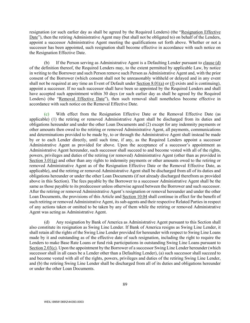 89 WEIL:\99581369\2\44393.0003 resignation (or such earlier day as shall be agreed by the Required Lenders) (the “Resignation Effective Date”), then the retiring Administrative Agent may (but shall not be obligated to) on behalf of the Lenders, appoint a successor Administrative Agent meeting the qualifications set forth above. Whether or not a successor has been appointed, such resignation shall become effective in accordance with such notice on the Resignation Effective Date. (b) If the Person serving as Administrative Agent is a Defaulting Lender pursuant to clause (d) of the definition thereof, the Required Lenders may, to the extent permitted by applicable Law, by notice in writing to the Borrower and such Person remove such Person as Administrative Agent and, with the prior consent of the Borrower (which consent shall not be unreasonably withheld or delayed and in any event shall not be required at any time an Event of Default under Section 8.01(a) or (f) exists and is continuing), appoint a successor. If no such successor shall have been so appointed by the Required Lenders and shall have accepted such appointment within 30 days (or such earlier day as shall be agreed by the Required Lenders) (the “Removal Effective Date”), then such removal shall nonetheless become effective in accordance with such notice on the Removal Effective Date. (c) With effect from the Resignation Effective Date or the Removal Effective Date (as applicable) (1) the retiring or removed Administrative Agent shall be discharged from its duties and obligations hereunder and under the other Loan Documents and (2) except for any indemnity payments or other amounts then owed to the retiring or removed Administrative Agent, all payments, communications and determinations provided to be made by, to or through the Administrative Agent shall instead be made by or to each Lender directly, until such time, if any, as the Required Lenders appoint a successor Administrative Agent as provided for above. Upon the acceptance of a successor’s appointment as Administrative Agent hereunder, such successor shall succeed to and become vested with all of the rights, powers, privileges and duties of the retiring (or removed) Administrative Agent (other than as provided in Section 3.01(g) and other than any rights to indemnity payments or other amounts owed to the retiring or removed Administrative Agent as of the Resignation Effective Date or the Removal Effective Date, as applicable), and the retiring or removed Administrative Agent shall be discharged from all of its duties and obligations hereunder or under the other Loan Documents (if not already discharged therefrom as provided above in this Section). The fees payable by the Borrower to a successor Administrative Agent shall be the same as those payable to its predecessor unless otherwise agreed between the Borrower and such successor. After the retiring or removed Administrative Agent’s resignation or removal hereunder and under the other Loan Documents, the provisions of this Article and Section 10.04 shall continue in effect for the benefit of such retiring or removed Administrative Agent, its sub-agents and their respective Related Parties in respect of any actions taken or omitted to be taken by any of them while the retiring or removed Administrative Agent was acting as Administrative Agent. (d) Any resignation by Bank of America as Administrative Agent pursuant to this Section shall also constitute its resignation as Swing Line Lender. If Bank of America resigns as Swing Line Lender, it shall retain all the rights of the Swing Line Lender provided for hereunder with respect to Swing Line Loans made by it and outstanding as of the effective date of such resignation, including the right to require the Lenders to make Base Rate Loans or fund risk participations in outstanding Swing Line Loans pursuant to Section 2.03(c). Upon the appointment by the Borrower of a successor Swing Line Lender hereunder (which successor shall in all cases be a Lender other than a Defaulting Lender), (a) such successor shall succeed to and become vested with all of the rights, powers, privileges and duties of the retiring Swing Line Lender, and (b) the retiring Swing Line Lender shall be discharged from all of its duties and obligations hereunder or under the other Loan Documents.