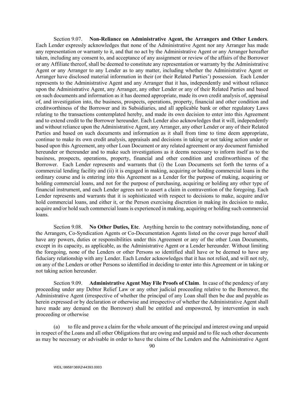90 WEIL:\99581369\2\44393.0003 Section 9.07. Non-Reliance on Administrative Agent, the Arrangers and Other Lenders. Each Lender expressly acknowledges that none of the Administrative Agent nor any Arranger has made any representation or warranty to it, and that no act by the Administrative Agent or any Arranger hereafter taken, including any consent to, and acceptance of any assignment or review of the affairs of the Borrower or any Affiliate thereof, shall be deemed to constitute any representation or warranty by the Administrative Agent or any Arranger to any Lender as to any matter, including whether the Administrative Agent or Arranger have disclosed material information in their (or their Related Parties’) possession. Each Lender represents to the Administrative Agent and any Arranger that it has, independently and without reliance upon the Administrative Agent, any Arranger, any other Lender or any of their Related Parties and based on such documents and information as it has deemed appropriate, made its own credit analysis of, appraisal of, and investigation into, the business, prospects, operations, property, financial and other condition and creditworthiness of the Borrower and its Subsidiaries, and all applicable bank or other regulatory Laws relating to the transactions contemplated hereby, and made its own decision to enter into this Agreement and to extend credit to the Borrower hereunder. Each Lender also acknowledges that it will, independently and without reliance upon the Administrative Agent, any Arranger, any other Lender or any of their Related Parties and based on such documents and information as it shall from time to time deem appropriate, continue to make its own credit analysis, appraisals and decisions in taking or not taking action under or based upon this Agreement, any other Loan Document or any related agreement or any document furnished hereunder or thereunder and to make such investigations as it deems necessary to inform itself as to the business, prospects, operations, property, financial and other condition and creditworthiness of the Borrower. Each Lender represents and warrants that (i) the Loan Documents set forth the terms of a commercial lending facility and (ii) it is engaged in making, acquiring or holding commercial loans in the ordinary course and is entering into this Agreement as a Lender for the purpose of making, acquiring or holding commercial loans, and not for the purpose of purchasing, acquiring or holding any other type of financial instrument, and each Lender agrees not to assert a claim in contravention of the foregoing. Each Lender represents and warrants that it is sophisticated with respect to decisions to make, acquire and/or hold commercial loans, and either it, or the Person exercising discretion in making its decision to make, acquire and/or hold such commercial loans is experienced in making, acquiring or holding such commercial loans. Section 9.08. No Other Duties, Etc. Anything herein to the contrary notwithstanding, none of the Arrangers, Co-Syndication Agents or Co-Documentation Agents listed on the cover page hereof shall have any powers, duties or responsibilities under this Agreement or any of the other Loan Documents, except in its capacity, as applicable, as the Administrative Agent or a Lender hereunder. Without limiting the foregoing, none of the Lenders or other Persons so identified shall have or be deemed to have any fiduciary relationship with any Lender. Each Lender acknowledges that it has not relied, and will not rely, on any of the Lenders or other Persons so identified in deciding to enter into this Agreement or in taking or not taking action hereunder. Section 9.09. Administrative Agent May File Proofs of Claim. In case of the pendency of any proceeding under any Debtor Relief Law or any other judicial proceeding relative to the Borrower, the Administrative Agent (irrespective of whether the principal of any Loan shall then be due and payable as herein expressed or by declaration or otherwise and irrespective of whether the Administrative Agent shall have made any demand on the Borrower) shall be entitled and empowered, by intervention in such proceeding or otherwise (a) to file and prove a claim for the whole amount of the principal and interest owing and unpaid in respect of the Loans and all other Obligations that are owing and unpaid and to file such other documents as may be necessary or advisable in order to have the claims of the Lenders and the Administrative Agent