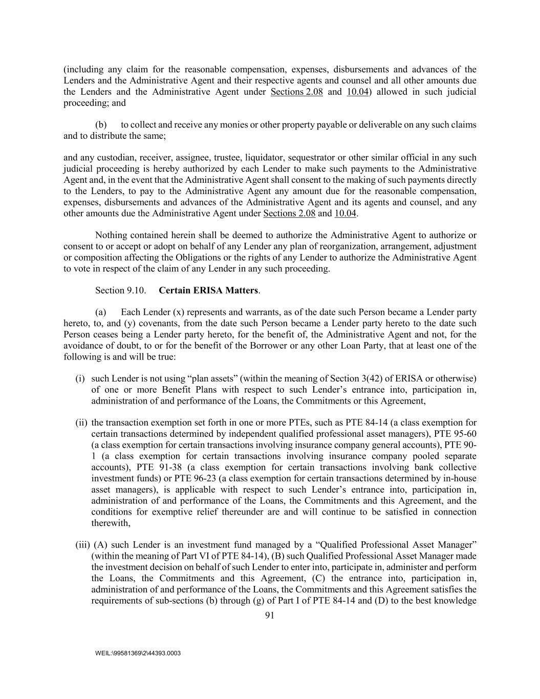 91 WEIL:\99581369\2\44393.0003 (including any claim for the reasonable compensation, expenses, disbursements and advances of the Lenders and the Administrative Agent and their respective agents and counsel and all other amounts due the Lenders and the Administrative Agent under Sections 2.08 and 10.04) allowed in such judicial proceeding; and (b) to collect and receive any monies or other property payable or deliverable on any such claims and to distribute the same; and any custodian, receiver, assignee, trustee, liquidator, sequestrator or other similar official in any such judicial proceeding is hereby authorized by each Lender to make such payments to the Administrative Agent and, in the event that the Administrative Agent shall consent to the making of such payments directly to the Lenders, to pay to the Administrative Agent any amount due for the reasonable compensation, expenses, disbursements and advances of the Administrative Agent and its agents and counsel, and any other amounts due the Administrative Agent under Sections 2.08 and 10.04. Nothing contained herein shall be deemed to authorize the Administrative Agent to authorize or consent to or accept or adopt on behalf of any Lender any plan of reorganization, arrangement, adjustment or composition affecting the Obligations or the rights of any Lender to authorize the Administrative Agent to vote in respect of the claim of any Lender in any such proceeding. Section 9.10. Certain ERISA Matters. (a) Each Lender (x) represents and warrants, as of the date such Person became a Lender party hereto, to, and (y) covenants, from the date such Person became a Lender party hereto to the date such Person ceases being a Lender party hereto, for the benefit of, the Administrative Agent and not, for the avoidance of doubt, to or for the benefit of the Borrower or any other Loan Party, that at least one of the following is and will be true: (i) such Lender is not using “plan assets” (within the meaning of Section 3(42) of ERISA or otherwise) of one or more Benefit Plans with respect to such Lender’s entrance into, participation in, administration of and performance of the Loans, the Commitments or this Agreement, (ii) the transaction exemption set forth in one or more PTEs, such as PTE 84-14 (a class exemption for certain transactions determined by independent qualified professional asset managers), PTE 95-60 (a class exemption for certain transactions involving insurance company general accounts), PTE 90- 1 (a class exemption for certain transactions involving insurance company pooled separate accounts), PTE 91-38 (a class exemption for certain transactions involving bank collective investment funds) or PTE 96-23 (a class exemption for certain transactions determined by in-house asset managers), is applicable with respect to such Lender’s entrance into, participation in, administration of and performance of the Loans, the Commitments and this Agreement, and the conditions for exemptive relief thereunder are and will continue to be satisfied in connection therewith, (iii) (A) such Lender is an investment fund managed by a “Qualified Professional Asset Manager” (within the meaning of Part VI of PTE 84-14), (B) such Qualified Professional Asset Manager made the investment decision on behalf of such Lender to enter into, participate in, administer and perform the Loans, the Commitments and this Agreement, (C) the entrance into, participation in, administration of and performance of the Loans, the Commitments and this Agreement satisfies the requirements of sub-sections (b) through (g) of Part I of PTE 84-14 and (D) to the best knowledge