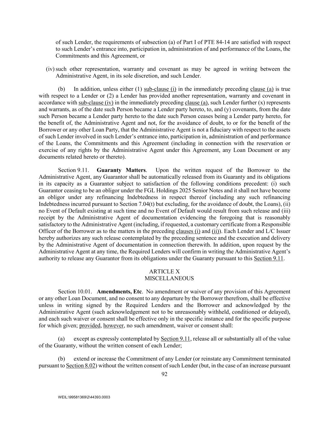 92 WEIL:\99581369\2\44393.0003 of such Lender, the requirements of subsection (a) of Part I of PTE 84-14 are satisfied with respect to such Lender’s entrance into, participation in, administration of and performance of the Loans, the Commitments and this Agreement, or (iv) such other representation, warranty and covenant as may be agreed in writing between the Administrative Agent, in its sole discretion, and such Lender. (b) In addition, unless either (1) sub-clause (i) in the immediately preceding clause (a) is true with respect to a Lender or (2) a Lender has provided another representation, warranty and covenant in accordance with sub-clause (iv) in the immediately preceding clause (a), such Lender further (x) represents and warrants, as of the date such Person became a Lender party hereto, to, and (y) covenants, from the date such Person became a Lender party hereto to the date such Person ceases being a Lender party hereto, for the benefit of, the Administrative Agent and not, for the avoidance of doubt, to or for the benefit of the Borrower or any other Loan Party, that the Administrative Agent is not a fiduciary with respect to the assets of such Lender involved in such Lender’s entrance into, participation in, administration of and performance of the Loans, the Commitments and this Agreement (including in connection with the reservation or exercise of any rights by the Administrative Agent under this Agreement, any Loan Document or any documents related hereto or thereto). Section 9.11. Guaranty Matters. Upon the written request of the Borrower to the Administrative Agent, any Guarantor shall be automatically released from its Guaranty and its obligations in its capacity as a Guarantor subject to satisfaction of the following conditions precedent: (i) such Guarantor ceasing to be an obligor under the FGL Holdings 2025 Senior Notes and it shall not have become an obligor under any refinancing Indebtedness in respect thereof (including any such refinancing Indebtedness incurred pursuant to Section 7.04(t) but excluding, for the avoidance of doubt, the Loans), (ii) no Event of Default existing at such time and no Event of Default would result from such release and (iii) receipt by the Administrative Agent of documentation evidencing the foregoing that is reasonably satisfactory to the Administrative Agent (including, if requested, a customary certificate from a Responsible Officer of the Borrower as to the matters in the preceding clauses (i) and (ii)). Each Lender and L/C Issuer hereby authorizes any such release contemplated by the preceding sentence and the execution and delivery by the Administrative Agent of documentation in connection therewith. In addition, upon request by the Administrative Agent at any time, the Required Lenders will confirm in writing the Administrative Agent’s authority to release any Guarantor from its obligations under the Guaranty pursuant to this Section 9.11. ARTICLE X MISCELLANEOUS Section 10.01. Amendments, Etc. No amendment or waiver of any provision of this Agreement or any other Loan Document, and no consent to any departure by the Borrower therefrom, shall be effective unless in writing signed by the Required Lenders and the Borrower and acknowledged by the Administrative Agent (such acknowledgement not to be unreasonably withheld, conditioned or delayed), and each such waiver or consent shall be effective only in the specific instance and for the specific purpose for which given; provided, however, no such amendment, waiver or consent shall: (a) except as expressly contemplated by Section 9.11, release all or substantially all of the value of the Guaranty, without the written consent of each Lender; (b) extend or increase the Commitment of any Lender (or reinstate any Commitment terminated pursuant to Section 8.02) without the written consent of such Lender (but, in the case of an increase pursuant
