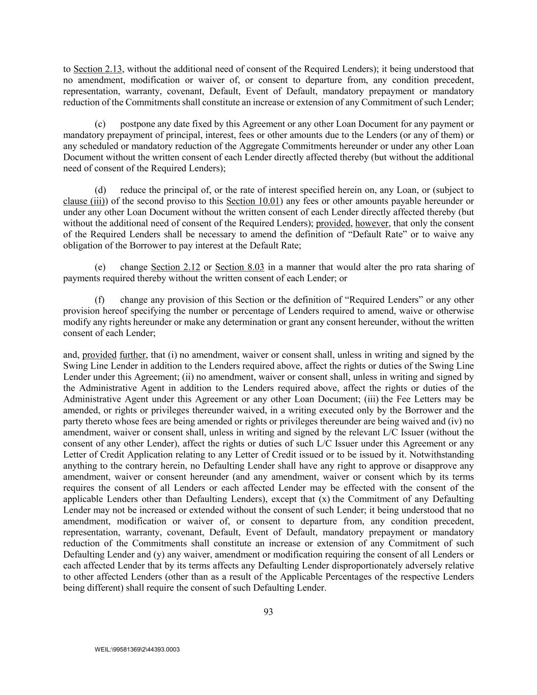 93 WEIL:\99581369\2\44393.0003 to Section 2.13, without the additional need of consent of the Required Lenders); it being understood that no amendment, modification or waiver of, or consent to departure from, any condition precedent, representation, warranty, covenant, Default, Event of Default, mandatory prepayment or mandatory reduction of the Commitments shall constitute an increase or extension of any Commitment of such Lender; (c) postpone any date fixed by this Agreement or any other Loan Document for any payment or mandatory prepayment of principal, interest, fees or other amounts due to the Lenders (or any of them) or any scheduled or mandatory reduction of the Aggregate Commitments hereunder or under any other Loan Document without the written consent of each Lender directly affected thereby (but without the additional need of consent of the Required Lenders); (d) reduce the principal of, or the rate of interest specified herein on, any Loan, or (subject to clause (iii)) of the second proviso to this Section 10.01) any fees or other amounts payable hereunder or under any other Loan Document without the written consent of each Lender directly affected thereby (but without the additional need of consent of the Required Lenders); provided, however, that only the consent of the Required Lenders shall be necessary to amend the definition of “Default Rate” or to waive any obligation of the Borrower to pay interest at the Default Rate; (e) change Section 2.12 or Section 8.03 in a manner that would alter the pro rata sharing of payments required thereby without the written consent of each Lender; or (f) change any provision of this Section or the definition of “Required Lenders” or any other provision hereof specifying the number or percentage of Lenders required to amend, waive or otherwise modify any rights hereunder or make any determination or grant any consent hereunder, without the written consent of each Lender; and, provided further, that (i) no amendment, waiver or consent shall, unless in writing and signed by the Swing Line Lender in addition to the Lenders required above, affect the rights or duties of the Swing Line Lender under this Agreement; (ii) no amendment, waiver or consent shall, unless in writing and signed by the Administrative Agent in addition to the Lenders required above, affect the rights or duties of the Administrative Agent under this Agreement or any other Loan Document; (iii) the Fee Letters may be amended, or rights or privileges thereunder waived, in a writing executed only by the Borrower and the party thereto whose fees are being amended or rights or privileges thereunder are being waived and (iv) no amendment, waiver or consent shall, unless in writing and signed by the relevant L/C Issuer (without the consent of any other Lender), affect the rights or duties of such L/C Issuer under this Agreement or any Letter of Credit Application relating to any Letter of Credit issued or to be issued by it. Notwithstanding anything to the contrary herein, no Defaulting Lender shall have any right to approve or disapprove any amendment, waiver or consent hereunder (and any amendment, waiver or consent which by its terms requires the consent of all Lenders or each affected Lender may be effected with the consent of the applicable Lenders other than Defaulting Lenders), except that (x) the Commitment of any Defaulting Lender may not be increased or extended without the consent of such Lender; it being understood that no amendment, modification or waiver of, or consent to departure from, any condition precedent, representation, warranty, covenant, Default, Event of Default, mandatory prepayment or mandatory reduction of the Commitments shall constitute an increase or extension of any Commitment of such Defaulting Lender and (y) any waiver, amendment or modification requiring the consent of all Lenders or each affected Lender that by its terms affects any Defaulting Lender disproportionately adversely relative to other affected Lenders (other than as a result of the Applicable Percentages of the respective Lenders being different) shall require the consent of such Defaulting Lender.
