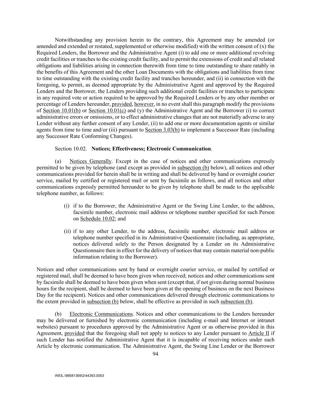 94 WEIL:\99581369\2\44393.0003 Notwithstanding any provision herein to the contrary, this Agreement may be amended (or amended and extended or restated, supplemented or otherwise modified) with the written consent of (x) the Required Lenders, the Borrower and the Administrative Agent (i) to add one or more additional revolving credit facilities or tranches to the existing credit facility, and to permit the extensions of credit and all related obligations and liabilities arising in connection therewith from time to time outstanding to share ratably in the benefits of this Agreement and the other Loan Documents with the obligations and liabilities from time to time outstanding with the existing credit facility and tranches hereunder, and (ii) in connection with the foregoing, to permit, as deemed appropriate by the Administrative Agent and approved by the Required Lenders and the Borrower, the Lenders providing such additional credit facilities or tranches to participate in any required vote or action required to be approved by the Required Lenders or by any other member or percentage of Lenders hereunder, provided, however, in no event shall this paragraph modify the provisions of Section 10.01(b) or Section 10.01(c) and (y) the Administrative Agent and the Borrower (i) to correct administrative errors or omissions, or to effect administrative changes that are not materially adverse to any Lender without any further consent of any Lender, (ii) to add one or more documentation agents or similar agents from time to time and/or (iii) pursuant to Section 3.03(b) to implement a Successor Rate (including any Successor Rate Conforming Changes). Section 10.02. Notices; Effectiveness; Electronic Communication. (a) Notices Generally. Except in the case of notices and other communications expressly permitted to be given by telephone (and except as provided in subsection (b) below), all notices and other communications provided for herein shall be in writing and shall be delivered by hand or overnight courier service, mailed by certified or registered mail or sent by facsimile as follows, and all notices and other communications expressly permitted hereunder to be given by telephone shall be made to the applicable telephone number, as follows: (i) if to the Borrower, the Administrative Agent or the Swing Line Lender, to the address, facsimile number, electronic mail address or telephone number specified for such Person on Schedule 10.02; and (ii) if to any other Lender, to the address, facsimile number, electronic mail address or telephone number specified in its Administrative Questionnaire (including, as appropriate, notices delivered solely to the Person designated by a Lender on its Administrative Questionnaire then in effect for the delivery of notices that may contain material non-public information relating to the Borrower). Notices and other communications sent by hand or overnight courier service, or mailed by certified or registered mail, shall be deemed to have been given when received; notices and other communications sent by facsimile shall be deemed to have been given when sent (except that, if not given during normal business hours for the recipient, shall be deemed to have been given at the opening of business on the next Business Day for the recipient). Notices and other communications delivered through electronic communications to the extent provided in subsection (b) below, shall be effective as provided in such subsection (b). (b) Electronic Communications. Notices and other communications to the Lenders hereunder may be delivered or furnished by electronic communication (including e-mail and Internet or intranet websites) pursuant to procedures approved by the Administrative Agent or as otherwise provided in this Agreement, provided that the foregoing shall not apply to notices to any Lender pursuant to Article II if such Lender has notified the Administrative Agent that it is incapable of receiving notices under such Article by electronic communication. The Administrative Agent, the Swing Line Lender or the Borrower