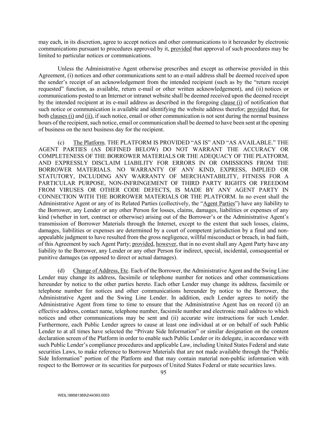 95 WEIL:\99581369\2\44393.0003 may each, in its discretion, agree to accept notices and other communications to it hereunder by electronic communications pursuant to procedures approved by it, provided that approval of such procedures may be limited to particular notices or communications. Unless the Administrative Agent otherwise prescribes and except as otherwise provided in this Agreement, (i) notices and other communications sent to an e-mail address shall be deemed received upon the sender’s receipt of an acknowledgement from the intended recipient (such as by the “return receipt requested” function, as available, return e-mail or other written acknowledgement), and (ii) notices or communications posted to an Internet or intranet website shall be deemed received upon the deemed receipt by the intended recipient at its e-mail address as described in the foregoing clause (i) of notification that such notice or communication is available and identifying the website address therefor; provided that, for both clauses (i) and (ii), if such notice, email or other communication is not sent during the normal business hours of the recipient, such notice, email or communication shall be deemed to have been sent at the opening of business on the next business day for the recipient. (c) The Platform. THE PLATFORM IS PROVIDED “AS IS” AND “AS AVAILABLE.” THE AGENT PARTIES (AS DEFINED BELOW) DO NOT WARRANT THE ACCURACY OR COMPLETENESS OF THE BORROWER MATERIALS OR THE ADEQUACY OF THE PLATFORM, AND EXPRESSLY DISCLAIM LIABILITY FOR ERRORS IN OR OMISSIONS FROM THE BORROWER MATERIALS. NO WARRANTY OF ANY KIND, EXPRESS, IMPLIED OR STATUTORY, INCLUDING ANY WARRANTY OF MERCHANTABILITY, FITNESS FOR A PARTICULAR PURPOSE, NON-INFRINGEMENT OF THIRD PARTY RIGHTS OR FREEDOM FROM VIRUSES OR OTHER CODE DEFECTS, IS MADE BY ANY AGENT PARTY IN CONNECTION WITH THE BORROWER MATERIALS OR THE PLATFORM. In no event shall the Administrative Agent or any of its Related Parties (collectively, the “Agent Parties”) have any liability to the Borrower, any Lender or any other Person for losses, claims, damages, liabilities or expenses of any kind (whether in tort, contract or otherwise) arising out of the Borrower’s or the Administrative Agent’s transmission of Borrower Materials through the Internet, except to the extent that such losses, claims, damages, liabilities or expenses are determined by a court of competent jurisdiction by a final and non- appealable judgment to have resulted from the gross negligence, willful misconduct or breach, in bad faith, of this Agreement by such Agent Party; provided, however, that in no event shall any Agent Party have any liability to the Borrower, any Lender or any other Person for indirect, special, incidental, consequential or punitive damages (as opposed to direct or actual damages). (d) Change of Address, Etc. Each of the Borrower, the Administrative Agent and the Swing Line Lender may change its address, facsimile or telephone number for notices and other communications hereunder by notice to the other parties hereto. Each other Lender may change its address, facsimile or telephone number for notices and other communications hereunder by notice to the Borrower, the Administrative Agent and the Swing Line Lender. In addition, each Lender agrees to notify the Administrative Agent from time to time to ensure that the Administrative Agent has on record (i) an effective address, contact name, telephone number, facsimile number and electronic mail address to which notices and other communications may be sent and (ii) accurate wire instructions for such Lender. Furthermore, each Public Lender agrees to cause at least one individual at or on behalf of such Public Lender to at all times have selected the “Private Side Information” or similar designation on the content declaration screen of the Platform in order to enable such Public Lender or its delegate, in accordance with such Public Lender’s compliance procedures and applicable Law, including United States Federal and state securities Laws, to make reference to Borrower Materials that are not made available through the “Public Side Information” portion of the Platform and that may contain material non-public information with respect to the Borrower or its securities for purposes of United States Federal or state securities laws.