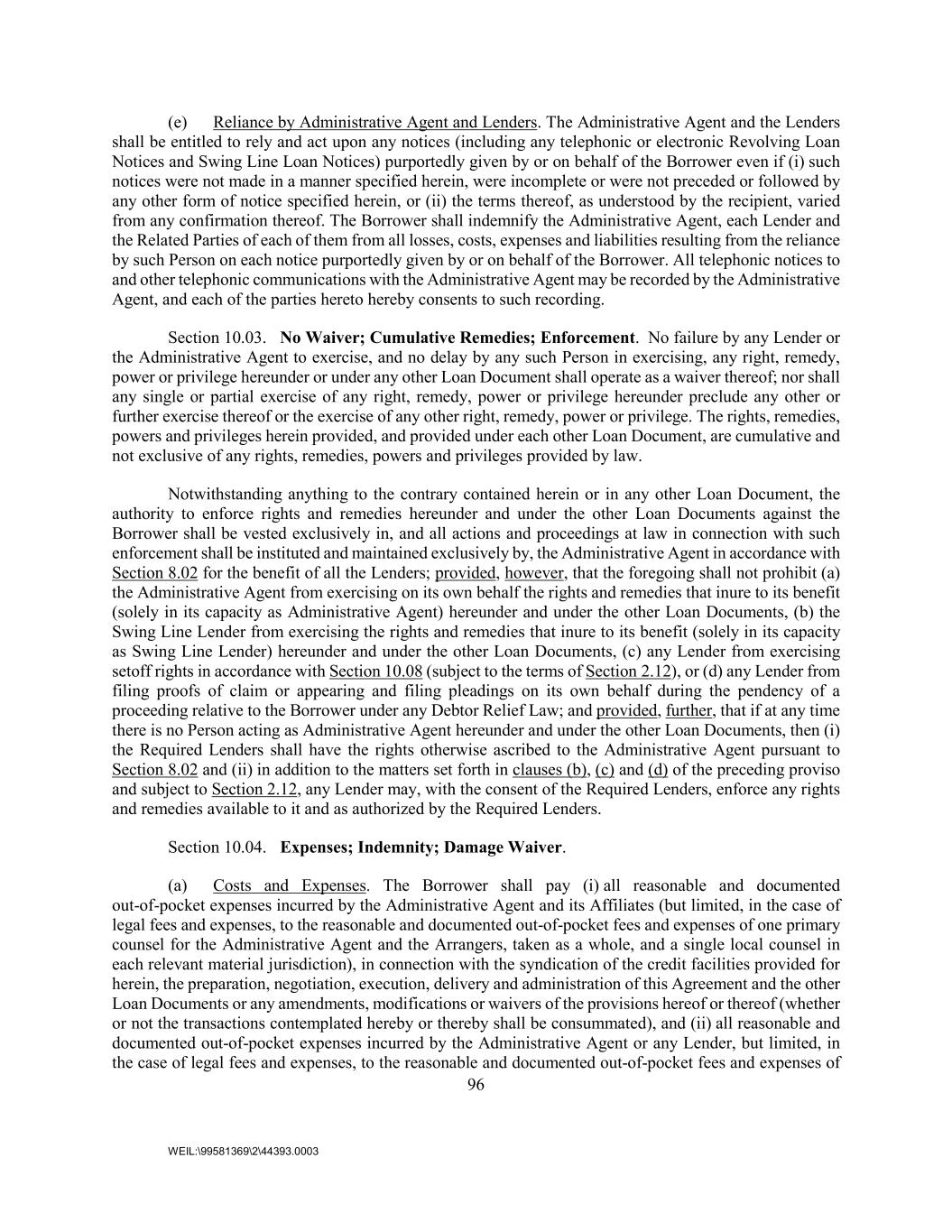 96 WEIL:\99581369\2\44393.0003 (e) Reliance by Administrative Agent and Lenders. The Administrative Agent and the Lenders shall be entitled to rely and act upon any notices (including any telephonic or electronic Revolving Loan Notices and Swing Line Loan Notices) purportedly given by or on behalf of the Borrower even if (i) such notices were not made in a manner specified herein, were incomplete or were not preceded or followed by any other form of notice specified herein, or (ii) the terms thereof, as understood by the recipient, varied from any confirmation thereof. The Borrower shall indemnify the Administrative Agent, each Lender and the Related Parties of each of them from all losses, costs, expenses and liabilities resulting from the reliance by such Person on each notice purportedly given by or on behalf of the Borrower. All telephonic notices to and other telephonic communications with the Administrative Agent may be recorded by the Administrative Agent, and each of the parties hereto hereby consents to such recording. Section 10.03. No Waiver; Cumulative Remedies; Enforcement. No failure by any Lender or the Administrative Agent to exercise, and no delay by any such Person in exercising, any right, remedy, power or privilege hereunder or under any other Loan Document shall operate as a waiver thereof; nor shall any single or partial exercise of any right, remedy, power or privilege hereunder preclude any other or further exercise thereof or the exercise of any other right, remedy, power or privilege. The rights, remedies, powers and privileges herein provided, and provided under each other Loan Document, are cumulative and not exclusive of any rights, remedies, powers and privileges provided by law. Notwithstanding anything to the contrary contained herein or in any other Loan Document, the authority to enforce rights and remedies hereunder and under the other Loan Documents against the Borrower shall be vested exclusively in, and all actions and proceedings at law in connection with such enforcement shall be instituted and maintained exclusively by, the Administrative Agent in accordance with Section 8.02 for the benefit of all the Lenders; provided, however, that the foregoing shall not prohibit (a) the Administrative Agent from exercising on its own behalf the rights and remedies that inure to its benefit (solely in its capacity as Administrative Agent) hereunder and under the other Loan Documents, (b) the Swing Line Lender from exercising the rights and remedies that inure to its benefit (solely in its capacity as Swing Line Lender) hereunder and under the other Loan Documents, (c) any Lender from exercising setoff rights in accordance with Section 10.08 (subject to the terms of Section 2.12), or (d) any Lender from filing proofs of claim or appearing and filing pleadings on its own behalf during the pendency of a proceeding relative to the Borrower under any Debtor Relief Law; and provided, further, that if at any time there is no Person acting as Administrative Agent hereunder and under the other Loan Documents, then (i) the Required Lenders shall have the rights otherwise ascribed to the Administrative Agent pursuant to Section 8.02 and (ii) in addition to the matters set forth in clauses (b), (c) and (d) of the preceding proviso and subject to Section 2.12, any Lender may, with the consent of the Required Lenders, enforce any rights and remedies available to it and as authorized by the Required Lenders. Section 10.04. Expenses; Indemnity; Damage Waiver. (a) Costs and Expenses. The Borrower shall pay (i) all reasonable and documented out-of-pocket expenses incurred by the Administrative Agent and its Affiliates (but limited, in the case of legal fees and expenses, to the reasonable and documented out-of-pocket fees and expenses of one primary counsel for the Administrative Agent and the Arrangers, taken as a whole, and a single local counsel in each relevant material jurisdiction), in connection with the syndication of the credit facilities provided for herein, the preparation, negotiation, execution, delivery and administration of this Agreement and the other Loan Documents or any amendments, modifications or waivers of the provisions hereof or thereof (whether or not the transactions contemplated hereby or thereby shall be consummated), and (ii) all reasonable and documented out-of-pocket expenses incurred by the Administrative Agent or any Lender, but limited, in the case of legal fees and expenses, to the reasonable and documented out-of-pocket fees and expenses of