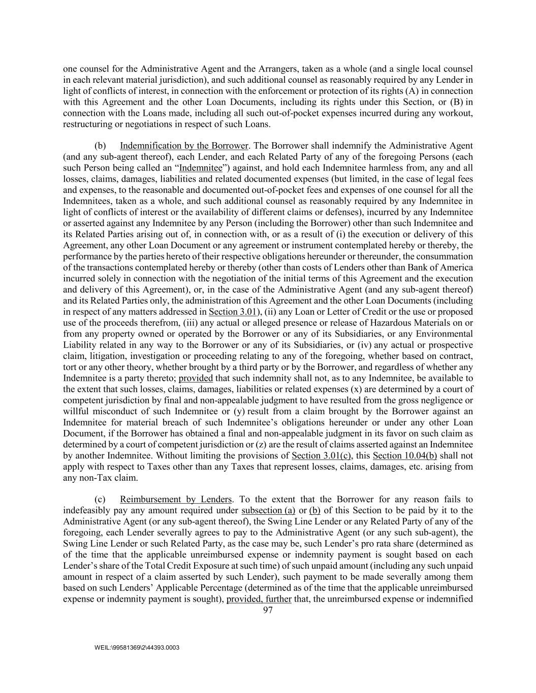 97 WEIL:\99581369\2\44393.0003 one counsel for the Administrative Agent and the Arrangers, taken as a whole (and a single local counsel in each relevant material jurisdiction), and such additional counsel as reasonably required by any Lender in light of conflicts of interest, in connection with the enforcement or protection of its rights (A) in connection with this Agreement and the other Loan Documents, including its rights under this Section, or (B) in connection with the Loans made, including all such out-of-pocket expenses incurred during any workout, restructuring or negotiations in respect of such Loans. (b) Indemnification by the Borrower. The Borrower shall indemnify the Administrative Agent (and any sub-agent thereof), each Lender, and each Related Party of any of the foregoing Persons (each such Person being called an “Indemnitee”) against, and hold each Indemnitee harmless from, any and all losses, claims, damages, liabilities and related documented expenses (but limited, in the case of legal fees and expenses, to the reasonable and documented out-of-pocket fees and expenses of one counsel for all the Indemnitees, taken as a whole, and such additional counsel as reasonably required by any Indemnitee in light of conflicts of interest or the availability of different claims or defenses), incurred by any Indemnitee or asserted against any Indemnitee by any Person (including the Borrower) other than such Indemnitee and its Related Parties arising out of, in connection with, or as a result of (i) the execution or delivery of this Agreement, any other Loan Document or any agreement or instrument contemplated hereby or thereby, the performance by the parties hereto of their respective obligations hereunder or thereunder, the consummation of the transactions contemplated hereby or thereby (other than costs of Lenders other than Bank of America incurred solely in connection with the negotiation of the initial terms of this Agreement and the execution and delivery of this Agreement), or, in the case of the Administrative Agent (and any sub-agent thereof) and its Related Parties only, the administration of this Agreement and the other Loan Documents (including in respect of any matters addressed in Section 3.01), (ii) any Loan or Letter of Credit or the use or proposed use of the proceeds therefrom, (iii) any actual or alleged presence or release of Hazardous Materials on or from any property owned or operated by the Borrower or any of its Subsidiaries, or any Environmental Liability related in any way to the Borrower or any of its Subsidiaries, or (iv) any actual or prospective claim, litigation, investigation or proceeding relating to any of the foregoing, whether based on contract, tort or any other theory, whether brought by a third party or by the Borrower, and regardless of whether any Indemnitee is a party thereto; provided that such indemnity shall not, as to any Indemnitee, be available to the extent that such losses, claims, damages, liabilities or related expenses (x) are determined by a court of competent jurisdiction by final and non-appealable judgment to have resulted from the gross negligence or willful misconduct of such Indemnitee or (y) result from a claim brought by the Borrower against an Indemnitee for material breach of such Indemnitee’s obligations hereunder or under any other Loan Document, if the Borrower has obtained a final and non-appealable judgment in its favor on such claim as determined by a court of competent jurisdiction or (z) are the result of claims asserted against an Indemnitee by another Indemnitee. Without limiting the provisions of Section 3.01(c), this Section 10.04(b) shall not apply with respect to Taxes other than any Taxes that represent losses, claims, damages, etc. arising from any non-Tax claim. (c) Reimbursement by Lenders. To the extent that the Borrower for any reason fails to indefeasibly pay any amount required under subsection (a) or (b) of this Section to be paid by it to the Administrative Agent (or any sub-agent thereof), the Swing Line Lender or any Related Party of any of the foregoing, each Lender severally agrees to pay to the Administrative Agent (or any such sub-agent), the Swing Line Lender or such Related Party, as the case may be, such Lender’s pro rata share (determined as of the time that the applicable unreimbursed expense or indemnity payment is sought based on each Lender’s share of the Total Credit Exposure at such time) of such unpaid amount (including any such unpaid amount in respect of a claim asserted by such Lender), such payment to be made severally among them based on such Lenders’ Applicable Percentage (determined as of the time that the applicable unreimbursed expense or indemnity payment is sought), provided, further that, the unreimbursed expense or indemnified