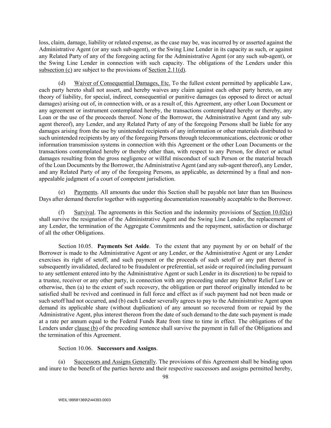 98 WEIL:\99581369\2\44393.0003 loss, claim, damage, liability or related expense, as the case may be, was incurred by or asserted against the Administrative Agent (or any such sub-agent), or the Swing Line Lender in its capacity as such, or against any Related Party of any of the foregoing acting for the Administrative Agent (or any such sub-agent), or the Swing Line Lender in connection with such capacity. The obligations of the Lenders under this subsection (c) are subject to the provisions of Section 2.11(d). (d) Waiver of Consequential Damages, Etc. To the fullest extent permitted by applicable Law, each party hereto shall not assert, and hereby waives any claim against each other party hereto, on any theory of liability, for special, indirect, consequential or punitive damages (as opposed to direct or actual damages) arising out of, in connection with, or as a result of, this Agreement, any other Loan Document or any agreement or instrument contemplated hereby, the transactions contemplated hereby or thereby, any Loan or the use of the proceeds thereof. None of the Borrower, the Administrative Agent (and any sub- agent thereof), any Lender, and any Related Party of any of the foregoing Persons shall be liable for any damages arising from the use by unintended recipients of any information or other materials distributed to such unintended recipients by any of the foregoing Persons through telecommunications, electronic or other information transmission systems in connection with this Agreement or the other Loan Documents or the transactions contemplated hereby or thereby other than, with respect to any Person, for direct or actual damages resulting from the gross negligence or willful misconduct of such Person or the material breach of the Loan Documents by the Borrower, the Administrative Agent (and any sub-agent thereof), any Lender, and any Related Party of any of the foregoing Persons, as applicable, as determined by a final and non- appealable judgment of a court of competent jurisdiction. (e) Payments. All amounts due under this Section shall be payable not later than ten Business Days after demand therefor together with supporting documentation reasonably acceptable to the Borrower. (f) Survival. The agreements in this Section and the indemnity provisions of Section 10.02(e) shall survive the resignation of the Administrative Agent and the Swing Line Lender, the replacement of any Lender, the termination of the Aggregate Commitments and the repayment, satisfaction or discharge of all the other Obligations. Section 10.05. Payments Set Aside. To the extent that any payment by or on behalf of the Borrower is made to the Administrative Agent or any Lender, or the Administrative Agent or any Lender exercises its right of setoff, and such payment or the proceeds of such setoff or any part thereof is subsequently invalidated, declared to be fraudulent or preferential, set aside or required (including pursuant to any settlement entered into by the Administrative Agent or such Lender in its discretion) to be repaid to a trustee, receiver or any other party, in connection with any proceeding under any Debtor Relief Law or otherwise, then (a) to the extent of such recovery, the obligation or part thereof originally intended to be satisfied shall be revived and continued in full force and effect as if such payment had not been made or such setoff had not occurred, and (b) each Lender severally agrees to pay to the Administrative Agent upon demand its applicable share (without duplication) of any amount so recovered from or repaid by the Administrative Agent, plus interest thereon from the date of such demand to the date such payment is made at a rate per annum equal to the Federal Funds Rate from time to time in effect. The obligations of the Lenders under clause (b) of the preceding sentence shall survive the payment in full of the Obligations and the termination of this Agreement. Section 10.06. Successors and Assigns. (a) Successors and Assigns Generally. The provisions of this Agreement shall be binding upon and inure to the benefit of the parties hereto and their respective successors and assigns permitted hereby,
