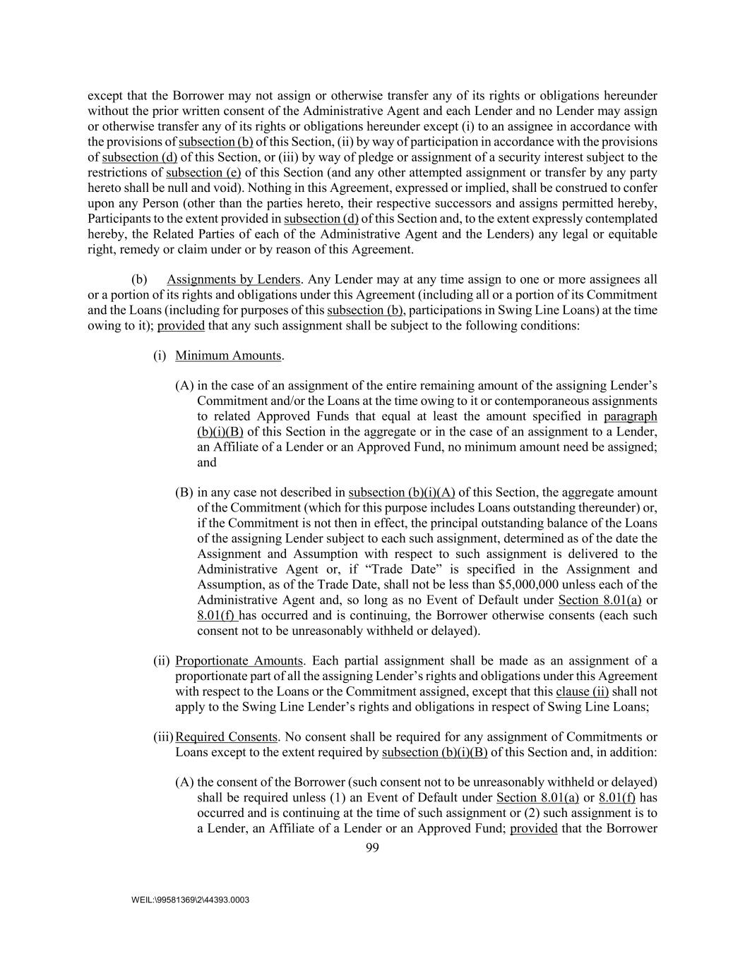99 WEIL:\99581369\2\44393.0003 except that the Borrower may not assign or otherwise transfer any of its rights or obligations hereunder without the prior written consent of the Administrative Agent and each Lender and no Lender may assign or otherwise transfer any of its rights or obligations hereunder except (i) to an assignee in accordance with the provisions of subsection (b) of this Section, (ii) by way of participation in accordance with the provisions of subsection (d) of this Section, or (iii) by way of pledge or assignment of a security interest subject to the restrictions of subsection (e) of this Section (and any other attempted assignment or transfer by any party hereto shall be null and void). Nothing in this Agreement, expressed or implied, shall be construed to confer upon any Person (other than the parties hereto, their respective successors and assigns permitted hereby, Participants to the extent provided in subsection (d) of this Section and, to the extent expressly contemplated hereby, the Related Parties of each of the Administrative Agent and the Lenders) any legal or equitable right, remedy or claim under or by reason of this Agreement. (b) Assignments by Lenders. Any Lender may at any time assign to one or more assignees all or a portion of its rights and obligations under this Agreement (including all or a portion of its Commitment and the Loans (including for purposes of this subsection (b), participations in Swing Line Loans) at the time owing to it); provided that any such assignment shall be subject to the following conditions: (i) Minimum Amounts. (A) in the case of an assignment of the entire remaining amount of the assigning Lender’s Commitment and/or the Loans at the time owing to it or contemporaneous assignments to related Approved Funds that equal at least the amount specified in paragraph (b)(i)(B) of this Section in the aggregate or in the case of an assignment to a Lender, an Affiliate of a Lender or an Approved Fund, no minimum amount need be assigned; and (B) in any case not described in subsection (b)(i)(A) of this Section, the aggregate amount of the Commitment (which for this purpose includes Loans outstanding thereunder) or, if the Commitment is not then in effect, the principal outstanding balance of the Loans of the assigning Lender subject to each such assignment, determined as of the date the Assignment and Assumption with respect to such assignment is delivered to the Administrative Agent or, if “Trade Date” is specified in the Assignment and Assumption, as of the Trade Date, shall not be less than $5,000,000 unless each of the Administrative Agent and, so long as no Event of Default under Section 8.01(a) or 8.01(f) has occurred and is continuing, the Borrower otherwise consents (each such consent not to be unreasonably withheld or delayed). (ii) Proportionate Amounts. Each partial assignment shall be made as an assignment of a proportionate part of all the assigning Lender’s rights and obligations under this Agreement with respect to the Loans or the Commitment assigned, except that this clause (ii) shall not apply to the Swing Line Lender’s rights and obligations in respect of Swing Line Loans; (iii) Required Consents. No consent shall be required for any assignment of Commitments or Loans except to the extent required by subsection (b)(i)(B) of this Section and, in addition: (A) the consent of the Borrower (such consent not to be unreasonably withheld or delayed) shall be required unless (1) an Event of Default under Section 8.01(a) or 8.01(f) has occurred and is continuing at the time of such assignment or (2) such assignment is to a Lender, an Affiliate of a Lender or an Approved Fund; provided that the Borrower