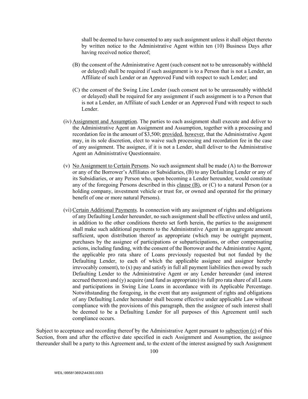 100 WEIL:\99581369\2\44393.0003 shall be deemed to have consented to any such assignment unless it shall object thereto by written notice to the Administrative Agent within ten (10) Business Days after having received notice thereof; (B) the consent of the Administrative Agent (such consent not to be unreasonably withheld or delayed) shall be required if such assignment is to a Person that is not a Lender, an Affiliate of such Lender or an Approved Fund with respect to such Lender; and (C) the consent of the Swing Line Lender (such consent not to be unreasonably withheld or delayed) shall be required for any assignment if such assignment is to a Person that is not a Lender, an Affiliate of such Lender or an Approved Fund with respect to such Lender. (iv) Assignment and Assumption. The parties to each assignment shall execute and deliver to the Administrative Agent an Assignment and Assumption, together with a processing and recordation fee in the amount of $3,500; provided, however, that the Administrative Agent may, in its sole discretion, elect to waive such processing and recordation fee in the case of any assignment. The assignee, if it is not a Lender, shall deliver to the Administrative Agent an Administrative Questionnaire. (v) No Assignment to Certain Persons. No such assignment shall be made (A) to the Borrower or any of the Borrower’s Affiliates or Subsidiaries, (B) to any Defaulting Lender or any of its Subsidiaries, or any Person who, upon becoming a Lender hereunder, would constitute any of the foregoing Persons described in this clause (B), or (C) to a natural Person (or a holding company, investment vehicle or trust for, or owned and operated for the primary benefit of one or more natural Persons). (vi) Certain Additional Payments. In connection with any assignment of rights and obligations of any Defaulting Lender hereunder, no such assignment shall be effective unless and until, in addition to the other conditions thereto set forth herein, the parties to the assignment shall make such additional payments to the Administrative Agent in an aggregate amount sufficient, upon distribution thereof as appropriate (which may be outright payment, purchases by the assignee of participations or subparticipations, or other compensating actions, including funding, with the consent of the Borrower and the Administrative Agent, the applicable pro rata share of Loans previously requested but not funded by the Defaulting Lender, to each of which the applicable assignee and assignor hereby irrevocably consent), to (x) pay and satisfy in full all payment liabilities then owed by such Defaulting Lender to the Administrative Agent or any Lender hereunder (and interest accrued thereon) and (y) acquire (and fund as appropriate) its full pro rata share of all Loans and participations in Swing Line Loans in accordance with its Applicable Percentage. Notwithstanding the foregoing, in the event that any assignment of rights and obligations of any Defaulting Lender hereunder shall become effective under applicable Law without compliance with the provisions of this paragraph, then the assignee of such interest shall be deemed to be a Defaulting Lender for all purposes of this Agreement until such compliance occurs. Subject to acceptance and recording thereof by the Administrative Agent pursuant to subsection (c) of this Section, from and after the effective date specified in each Assignment and Assumption, the assignee thereunder shall be a party to this Agreement and, to the extent of the interest assigned by such Assignment