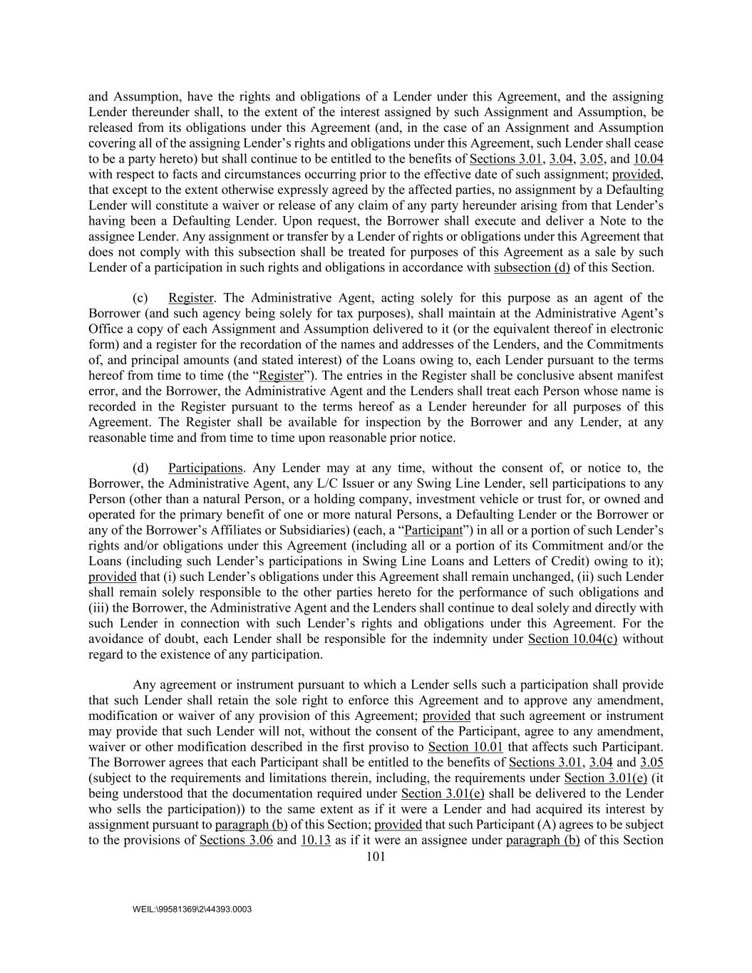 101 WEIL:\99581369\2\44393.0003 and Assumption, have the rights and obligations of a Lender under this Agreement, and the assigning Lender thereunder shall, to the extent of the interest assigned by such Assignment and Assumption, be released from its obligations under this Agreement (and, in the case of an Assignment and Assumption covering all of the assigning Lender’s rights and obligations under this Agreement, such Lender shall cease to be a party hereto) but shall continue to be entitled to the benefits of Sections 3.01, 3.04, 3.05, and 10.04 with respect to facts and circumstances occurring prior to the effective date of such assignment; provided, that except to the extent otherwise expressly agreed by the affected parties, no assignment by a Defaulting Lender will constitute a waiver or release of any claim of any party hereunder arising from that Lender’s having been a Defaulting Lender. Upon request, the Borrower shall execute and deliver a Note to the assignee Lender. Any assignment or transfer by a Lender of rights or obligations under this Agreement that does not comply with this subsection shall be treated for purposes of this Agreement as a sale by such Lender of a participation in such rights and obligations in accordance with subsection (d) of this Section. (c) Register. The Administrative Agent, acting solely for this purpose as an agent of the Borrower (and such agency being solely for tax purposes), shall maintain at the Administrative Agent’s Office a copy of each Assignment and Assumption delivered to it (or the equivalent thereof in electronic form) and a register for the recordation of the names and addresses of the Lenders, and the Commitments of, and principal amounts (and stated interest) of the Loans owing to, each Lender pursuant to the terms hereof from time to time (the “Register”). The entries in the Register shall be conclusive absent manifest error, and the Borrower, the Administrative Agent and the Lenders shall treat each Person whose name is recorded in the Register pursuant to the terms hereof as a Lender hereunder for all purposes of this Agreement. The Register shall be available for inspection by the Borrower and any Lender, at any reasonable time and from time to time upon reasonable prior notice. (d) Participations. Any Lender may at any time, without the consent of, or notice to, the Borrower, the Administrative Agent, any L/C Issuer or any Swing Line Lender, sell participations to any Person (other than a natural Person, or a holding company, investment vehicle or trust for, or owned and operated for the primary benefit of one or more natural Persons, a Defaulting Lender or the Borrower or any of the Borrower’s Affiliates or Subsidiaries) (each, a “Participant”) in all or a portion of such Lender’s rights and/or obligations under this Agreement (including all or a portion of its Commitment and/or the Loans (including such Lender’s participations in Swing Line Loans and Letters of Credit) owing to it); provided that (i) such Lender’s obligations under this Agreement shall remain unchanged, (ii) such Lender shall remain solely responsible to the other parties hereto for the performance of such obligations and (iii) the Borrower, the Administrative Agent and the Lenders shall continue to deal solely and directly with such Lender in connection with such Lender’s rights and obligations under this Agreement. For the avoidance of doubt, each Lender shall be responsible for the indemnity under Section 10.04(c) without regard to the existence of any participation. Any agreement or instrument pursuant to which a Lender sells such a participation shall provide that such Lender shall retain the sole right to enforce this Agreement and to approve any amendment, modification or waiver of any provision of this Agreement; provided that such agreement or instrument may provide that such Lender will not, without the consent of the Participant, agree to any amendment, waiver or other modification described in the first proviso to Section 10.01 that affects such Participant. The Borrower agrees that each Participant shall be entitled to the benefits of Sections 3.01, 3.04 and 3.05 (subject to the requirements and limitations therein, including, the requirements under Section 3.01(e) (it being understood that the documentation required under Section 3.01(e) shall be delivered to the Lender who sells the participation)) to the same extent as if it were a Lender and had acquired its interest by assignment pursuant to paragraph (b) of this Section; provided that such Participant (A) agrees to be subject to the provisions of Sections 3.06 and 10.13 as if it were an assignee under paragraph (b) of this Section