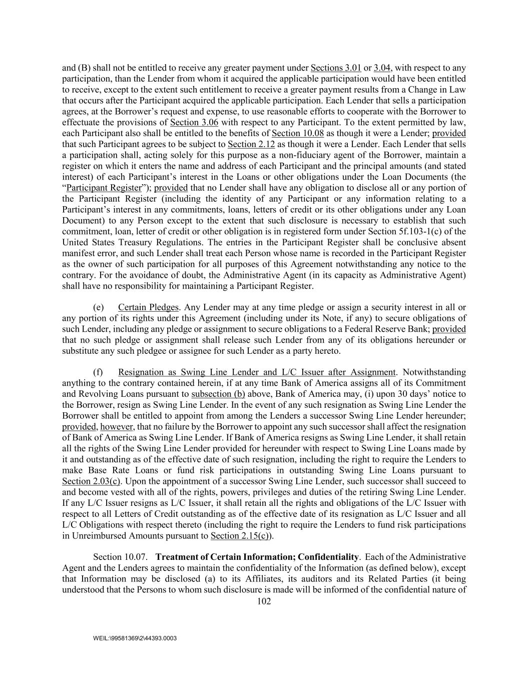 102 WEIL:\99581369\2\44393.0003 and (B) shall not be entitled to receive any greater payment under Sections 3.01 or 3.04, with respect to any participation, than the Lender from whom it acquired the applicable participation would have been entitled to receive, except to the extent such entitlement to receive a greater payment results from a Change in Law that occurs after the Participant acquired the applicable participation. Each Lender that sells a participation agrees, at the Borrower’s request and expense, to use reasonable efforts to cooperate with the Borrower to effectuate the provisions of Section 3.06 with respect to any Participant. To the extent permitted by law, each Participant also shall be entitled to the benefits of Section 10.08 as though it were a Lender; provided that such Participant agrees to be subject to Section 2.12 as though it were a Lender. Each Lender that sells a participation shall, acting solely for this purpose as a non-fiduciary agent of the Borrower, maintain a register on which it enters the name and address of each Participant and the principal amounts (and stated interest) of each Participant’s interest in the Loans or other obligations under the Loan Documents (the “Participant Register”); provided that no Lender shall have any obligation to disclose all or any portion of the Participant Register (including the identity of any Participant or any information relating to a Participant’s interest in any commitments, loans, letters of credit or its other obligations under any Loan Document) to any Person except to the extent that such disclosure is necessary to establish that such commitment, loan, letter of credit or other obligation is in registered form under Section 5f.103-1(c) of the United States Treasury Regulations. The entries in the Participant Register shall be conclusive absent manifest error, and such Lender shall treat each Person whose name is recorded in the Participant Register as the owner of such participation for all purposes of this Agreement notwithstanding any notice to the contrary. For the avoidance of doubt, the Administrative Agent (in its capacity as Administrative Agent) shall have no responsibility for maintaining a Participant Register. (e) Certain Pledges. Any Lender may at any time pledge or assign a security interest in all or any portion of its rights under this Agreement (including under its Note, if any) to secure obligations of such Lender, including any pledge or assignment to secure obligations to a Federal Reserve Bank; provided that no such pledge or assignment shall release such Lender from any of its obligations hereunder or substitute any such pledgee or assignee for such Lender as a party hereto. (f) Resignation as Swing Line Lender and L/C Issuer after Assignment. Notwithstanding anything to the contrary contained herein, if at any time Bank of America assigns all of its Commitment and Revolving Loans pursuant to subsection (b) above, Bank of America may, (i) upon 30 days’ notice to the Borrower, resign as Swing Line Lender. In the event of any such resignation as Swing Line Lender the Borrower shall be entitled to appoint from among the Lenders a successor Swing Line Lender hereunder; provided, however, that no failure by the Borrower to appoint any such successor shall affect the resignation of Bank of America as Swing Line Lender. If Bank of America resigns as Swing Line Lender, it shall retain all the rights of the Swing Line Lender provided for hereunder with respect to Swing Line Loans made by it and outstanding as of the effective date of such resignation, including the right to require the Lenders to make Base Rate Loans or fund risk participations in outstanding Swing Line Loans pursuant to Section 2.03(c). Upon the appointment of a successor Swing Line Lender, such successor shall succeed to and become vested with all of the rights, powers, privileges and duties of the retiring Swing Line Lender. If any L/C Issuer resigns as L/C Issuer, it shall retain all the rights and obligations of the L/C Issuer with respect to all Letters of Credit outstanding as of the effective date of its resignation as L/C Issuer and all L/C Obligations with respect thereto (including the right to require the Lenders to fund risk participations in Unreimbursed Amounts pursuant to Section 2.15(c)). Section 10.07. Treatment of Certain Information; Confidentiality. Each of the Administrative Agent and the Lenders agrees to maintain the confidentiality of the Information (as defined below), except that Information may be disclosed (a) to its Affiliates, its auditors and its Related Parties (it being understood that the Persons to whom such disclosure is made will be informed of the confidential nature of