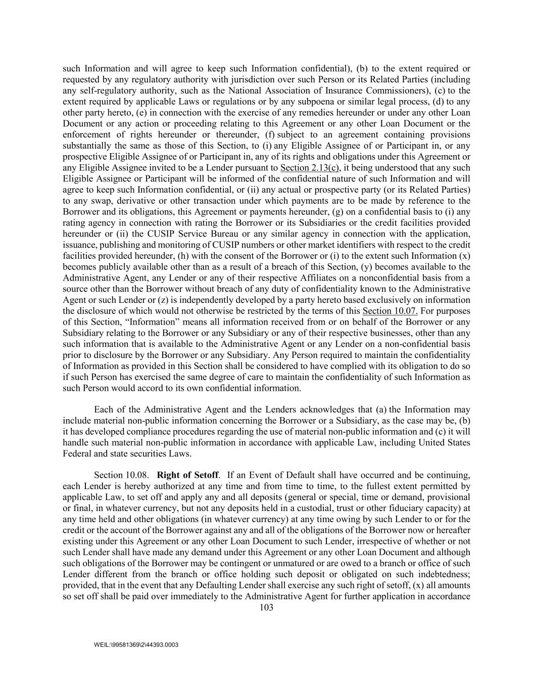 103 WEIL:\99581369\2\44393.0003 such Information and will agree to keep such Information confidential), (b) to the extent required or requested by any regulatory authority with jurisdiction over such Person or its Related Parties (including any self-regulatory authority, such as the National Association of Insurance Commissioners), (c) to the extent required by applicable Laws or regulations or by any subpoena or similar legal process, (d) to any other party hereto, (e) in connection with the exercise of any remedies hereunder or under any other Loan Document or any action or proceeding relating to this Agreement or any other Loan Document or the enforcement of rights hereunder or thereunder, (f) subject to an agreement containing provisions substantially the same as those of this Section, to (i) any Eligible Assignee of or Participant in, or any prospective Eligible Assignee of or Participant in, any of its rights and obligations under this Agreement or any Eligible Assignee invited to be a Lender pursuant to Section 2.13(c), it being understood that any such Eligible Assignee or Participant will be informed of the confidential nature of such Information and will agree to keep such Information confidential, or (ii) any actual or prospective party (or its Related Parties) to any swap, derivative or other transaction under which payments are to be made by reference to the Borrower and its obligations, this Agreement or payments hereunder, (g) on a confidential basis to (i) any rating agency in connection with rating the Borrower or its Subsidiaries or the credit facilities provided hereunder or (ii) the CUSIP Service Bureau or any similar agency in connection with the application, issuance, publishing and monitoring of CUSIP numbers or other market identifiers with respect to the credit facilities provided hereunder, (h) with the consent of the Borrower or (i) to the extent such Information (x) becomes publicly available other than as a result of a breach of this Section, (y) becomes available to the Administrative Agent, any Lender or any of their respective Affiliates on a nonconfidential basis from a source other than the Borrower without breach of any duty of confidentiality known to the Administrative Agent or such Lender or (z) is independently developed by a party hereto based exclusively on information the disclosure of which would not otherwise be restricted by the terms of this Section 10.07. For purposes of this Section, “Information” means all information received from or on behalf of the Borrower or any Subsidiary relating to the Borrower or any Subsidiary or any of their respective businesses, other than any such information that is available to the Administrative Agent or any Lender on a non-confidential basis prior to disclosure by the Borrower or any Subsidiary. Any Person required to maintain the confidentiality of Information as provided in this Section shall be considered to have complied with its obligation to do so if such Person has exercised the same degree of care to maintain the confidentiality of such Information as such Person would accord to its own confidential information. Each of the Administrative Agent and the Lenders acknowledges that (a) the Information may include material non-public information concerning the Borrower or a Subsidiary, as the case may be, (b) it has developed compliance procedures regarding the use of material non-public information and (c) it will handle such material non-public information in accordance with applicable Law, including United States Federal and state securities Laws. Section 10.08. Right of Setoff. If an Event of Default shall have occurred and be continuing, each Lender is hereby authorized at any time and from time to time, to the fullest extent permitted by applicable Law, to set off and apply any and all deposits (general or special, time or demand, provisional or final, in whatever currency, but not any deposits held in a custodial, trust or other fiduciary capacity) at any time held and other obligations (in whatever currency) at any time owing by such Lender to or for the credit or the account of the Borrower against any and all of the obligations of the Borrower now or hereafter existing under this Agreement or any other Loan Document to such Lender, irrespective of whether or not such Lender shall have made any demand under this Agreement or any other Loan Document and although such obligations of the Borrower may be contingent or unmatured or are owed to a branch or office of such Lender different from the branch or office holding such deposit or obligated on such indebtedness; provided, that in the event that any Defaulting Lender shall exercise any such right of setoff, (x) all amounts so set off shall be paid over immediately to the Administrative Agent for further application in accordance