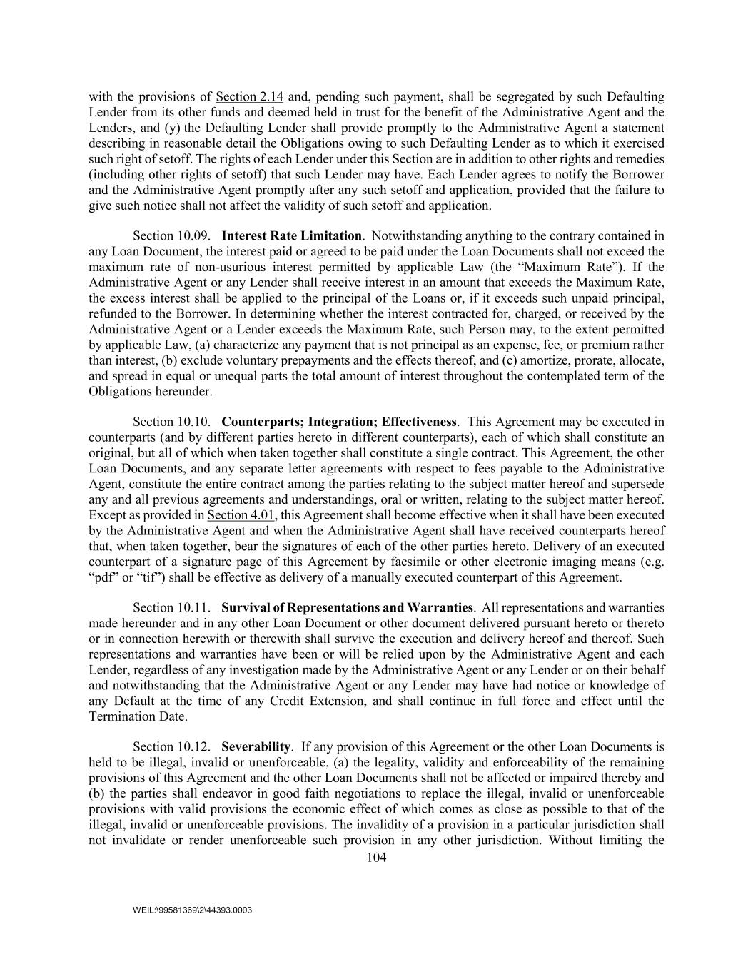 104 WEIL:\99581369\2\44393.0003 with the provisions of Section 2.14 and, pending such payment, shall be segregated by such Defaulting Lender from its other funds and deemed held in trust for the benefit of the Administrative Agent and the Lenders, and (y) the Defaulting Lender shall provide promptly to the Administrative Agent a statement describing in reasonable detail the Obligations owing to such Defaulting Lender as to which it exercised such right of setoff. The rights of each Lender under this Section are in addition to other rights and remedies (including other rights of setoff) that such Lender may have. Each Lender agrees to notify the Borrower and the Administrative Agent promptly after any such setoff and application, provided that the failure to give such notice shall not affect the validity of such setoff and application. Section 10.09. Interest Rate Limitation. Notwithstanding anything to the contrary contained in any Loan Document, the interest paid or agreed to be paid under the Loan Documents shall not exceed the maximum rate of non-usurious interest permitted by applicable Law (the “Maximum Rate”). If the Administrative Agent or any Lender shall receive interest in an amount that exceeds the Maximum Rate, the excess interest shall be applied to the principal of the Loans or, if it exceeds such unpaid principal, refunded to the Borrower. In determining whether the interest contracted for, charged, or received by the Administrative Agent or a Lender exceeds the Maximum Rate, such Person may, to the extent permitted by applicable Law, (a) characterize any payment that is not principal as an expense, fee, or premium rather than interest, (b) exclude voluntary prepayments and the effects thereof, and (c) amortize, prorate, allocate, and spread in equal or unequal parts the total amount of interest throughout the contemplated term of the Obligations hereunder. Section 10.10. Counterparts; Integration; Effectiveness. This Agreement may be executed in counterparts (and by different parties hereto in different counterparts), each of which shall constitute an original, but all of which when taken together shall constitute a single contract. This Agreement, the other Loan Documents, and any separate letter agreements with respect to fees payable to the Administrative Agent, constitute the entire contract among the parties relating to the subject matter hereof and supersede any and all previous agreements and understandings, oral or written, relating to the subject matter hereof. Except as provided in Section 4.01, this Agreement shall become effective when it shall have been executed by the Administrative Agent and when the Administrative Agent shall have received counterparts hereof that, when taken together, bear the signatures of each of the other parties hereto. Delivery of an executed counterpart of a signature page of this Agreement by facsimile or other electronic imaging means (e.g. “pdf” or “tif”) shall be effective as delivery of a manually executed counterpart of this Agreement. Section 10.11. Survival of Representations and Warranties. All representations and warranties made hereunder and in any other Loan Document or other document delivered pursuant hereto or thereto or in connection herewith or therewith shall survive the execution and delivery hereof and thereof. Such representations and warranties have been or will be relied upon by the Administrative Agent and each Lender, regardless of any investigation made by the Administrative Agent or any Lender or on their behalf and notwithstanding that the Administrative Agent or any Lender may have had notice or knowledge of any Default at the time of any Credit Extension, and shall continue in full force and effect until the Termination Date. Section 10.12. Severability. If any provision of this Agreement or the other Loan Documents is held to be illegal, invalid or unenforceable, (a) the legality, validity and enforceability of the remaining provisions of this Agreement and the other Loan Documents shall not be affected or impaired thereby and (b) the parties shall endeavor in good faith negotiations to replace the illegal, invalid or unenforceable provisions with valid provisions the economic effect of which comes as close as possible to that of the illegal, invalid or unenforceable provisions. The invalidity of a provision in a particular jurisdiction shall not invalidate or render unenforceable such provision in any other jurisdiction. Without limiting the