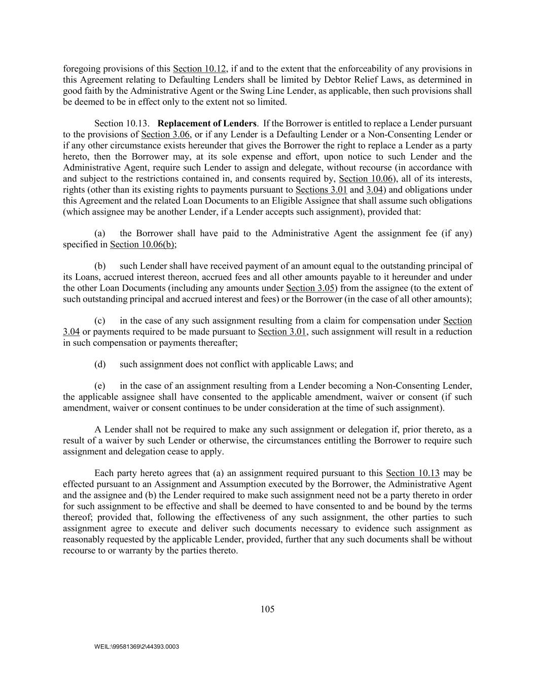 105 WEIL:\99581369\2\44393.0003 foregoing provisions of this Section 10.12, if and to the extent that the enforceability of any provisions in this Agreement relating to Defaulting Lenders shall be limited by Debtor Relief Laws, as determined in good faith by the Administrative Agent or the Swing Line Lender, as applicable, then such provisions shall be deemed to be in effect only to the extent not so limited. Section 10.13. Replacement of Lenders. If the Borrower is entitled to replace a Lender pursuant to the provisions of Section 3.06, or if any Lender is a Defaulting Lender or a Non-Consenting Lender or if any other circumstance exists hereunder that gives the Borrower the right to replace a Lender as a party hereto, then the Borrower may, at its sole expense and effort, upon notice to such Lender and the Administrative Agent, require such Lender to assign and delegate, without recourse (in accordance with and subject to the restrictions contained in, and consents required by, Section 10.06), all of its interests, rights (other than its existing rights to payments pursuant to Sections 3.01 and 3.04) and obligations under this Agreement and the related Loan Documents to an Eligible Assignee that shall assume such obligations (which assignee may be another Lender, if a Lender accepts such assignment), provided that: (a) the Borrower shall have paid to the Administrative Agent the assignment fee (if any) specified in Section 10.06(b); (b) such Lender shall have received payment of an amount equal to the outstanding principal of its Loans, accrued interest thereon, accrued fees and all other amounts payable to it hereunder and under the other Loan Documents (including any amounts under Section 3.05) from the assignee (to the extent of such outstanding principal and accrued interest and fees) or the Borrower (in the case of all other amounts); (c) in the case of any such assignment resulting from a claim for compensation under Section 3.04 or payments required to be made pursuant to Section 3.01, such assignment will result in a reduction in such compensation or payments thereafter; (d) such assignment does not conflict with applicable Laws; and (e) in the case of an assignment resulting from a Lender becoming a Non-Consenting Lender, the applicable assignee shall have consented to the applicable amendment, waiver or consent (if such amendment, waiver or consent continues to be under consideration at the time of such assignment). A Lender shall not be required to make any such assignment or delegation if, prior thereto, as a result of a waiver by such Lender or otherwise, the circumstances entitling the Borrower to require such assignment and delegation cease to apply. Each party hereto agrees that (a) an assignment required pursuant to this Section 10.13 may be effected pursuant to an Assignment and Assumption executed by the Borrower, the Administrative Agent and the assignee and (b) the Lender required to make such assignment need not be a party thereto in order for such assignment to be effective and shall be deemed to have consented to and be bound by the terms thereof; provided that, following the effectiveness of any such assignment, the other parties to such assignment agree to execute and deliver such documents necessary to evidence such assignment as reasonably requested by the applicable Lender, provided, further that any such documents shall be without recourse to or warranty by the parties thereto.