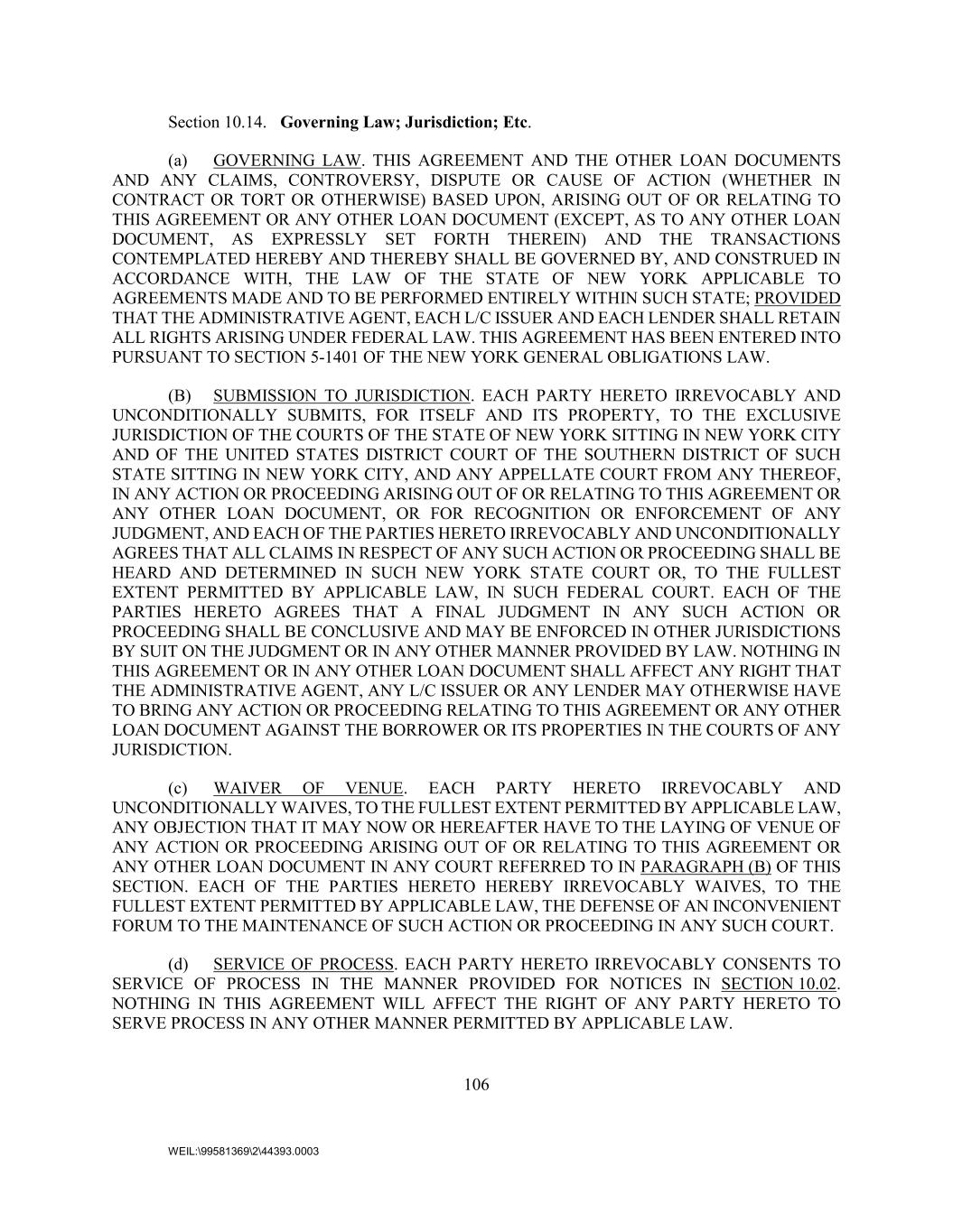 106 WEIL:\99581369\2\44393.0003 Section 10.14. Governing Law; Jurisdiction; Etc. (a) GOVERNING LAW. THIS AGREEMENT AND THE OTHER LOAN DOCUMENTS AND ANY CLAIMS, CONTROVERSY, DISPUTE OR CAUSE OF ACTION (WHETHER IN CONTRACT OR TORT OR OTHERWISE) BASED UPON, ARISING OUT OF OR RELATING TO THIS AGREEMENT OR ANY OTHER LOAN DOCUMENT (EXCEPT, AS TO ANY OTHER LOAN DOCUMENT, AS EXPRESSLY SET FORTH THEREIN) AND THE TRANSACTIONS CONTEMPLATED HEREBY AND THEREBY SHALL BE GOVERNED BY, AND CONSTRUED IN ACCORDANCE WITH, THE LAW OF THE STATE OF NEW YORK APPLICABLE TO AGREEMENTS MADE AND TO BE PERFORMED ENTIRELY WITHIN SUCH STATE; PROVIDED THAT THE ADMINISTRATIVE AGENT, EACH L/C ISSUER AND EACH LENDER SHALL RETAIN ALL RIGHTS ARISING UNDER FEDERAL LAW. THIS AGREEMENT HAS BEEN ENTERED INTO PURSUANT TO SECTION 5-1401 OF THE NEW YORK GENERAL OBLIGATIONS LAW. (B) SUBMISSION TO JURISDICTION. EACH PARTY HERETO IRREVOCABLY AND UNCONDITIONALLY SUBMITS, FOR ITSELF AND ITS PROPERTY, TO THE EXCLUSIVE JURISDICTION OF THE COURTS OF THE STATE OF NEW YORK SITTING IN NEW YORK CITY AND OF THE UNITED STATES DISTRICT COURT OF THE SOUTHERN DISTRICT OF SUCH STATE SITTING IN NEW YORK CITY, AND ANY APPELLATE COURT FROM ANY THEREOF, IN ANY ACTION OR PROCEEDING ARISING OUT OF OR RELATING TO THIS AGREEMENT OR ANY OTHER LOAN DOCUMENT, OR FOR RECOGNITION OR ENFORCEMENT OF ANY JUDGMENT, AND EACH OF THE PARTIES HERETO IRREVOCABLY AND UNCONDITIONALLY AGREES THAT ALL CLAIMS IN RESPECT OF ANY SUCH ACTION OR PROCEEDING SHALL BE HEARD AND DETERMINED IN SUCH NEW YORK STATE COURT OR, TO THE FULLEST EXTENT PERMITTED BY APPLICABLE LAW, IN SUCH FEDERAL COURT. EACH OF THE PARTIES HERETO AGREES THAT A FINAL JUDGMENT IN ANY SUCH ACTION OR PROCEEDING SHALL BE CONCLUSIVE AND MAY BE ENFORCED IN OTHER JURISDICTIONS BY SUIT ON THE JUDGMENT OR IN ANY OTHER MANNER PROVIDED BY LAW. NOTHING IN THIS AGREEMENT OR IN ANY OTHER LOAN DOCUMENT SHALL AFFECT ANY RIGHT THAT THE ADMINISTRATIVE AGENT, ANY L/C ISSUER OR ANY LENDER MAY OTHERWISE HAVE TO BRING ANY ACTION OR PROCEEDING RELATING TO THIS AGREEMENT OR ANY OTHER LOAN DOCUMENT AGAINST THE BORROWER OR ITS PROPERTIES IN THE COURTS OF ANY JURISDICTION. (c) WAIVER OF VENUE. EACH PARTY HERETO IRREVOCABLY AND UNCONDITIONALLY WAIVES, TO THE FULLEST EXTENT PERMITTED BY APPLICABLE LAW, ANY OBJECTION THAT IT MAY NOW OR HEREAFTER HAVE TO THE LAYING OF VENUE OF ANY ACTION OR PROCEEDING ARISING OUT OF OR RELATING TO THIS AGREEMENT OR ANY OTHER LOAN DOCUMENT IN ANY COURT REFERRED TO IN PARAGRAPH (B) OF THIS SECTION. EACH OF THE PARTIES HERETO HEREBY IRREVOCABLY WAIVES, TO THE FULLEST EXTENT PERMITTED BY APPLICABLE LAW, THE DEFENSE OF AN INCONVENIENT FORUM TO THE MAINTENANCE OF SUCH ACTION OR PROCEEDING IN ANY SUCH COURT. (d) SERVICE OF PROCESS. EACH PARTY HERETO IRREVOCABLY CONSENTS TO SERVICE OF PROCESS IN THE MANNER PROVIDED FOR NOTICES IN SECTION 10.02. NOTHING IN THIS AGREEMENT WILL AFFECT THE RIGHT OF ANY PARTY HERETO TO SERVE PROCESS IN ANY OTHER MANNER PERMITTED BY APPLICABLE LAW.