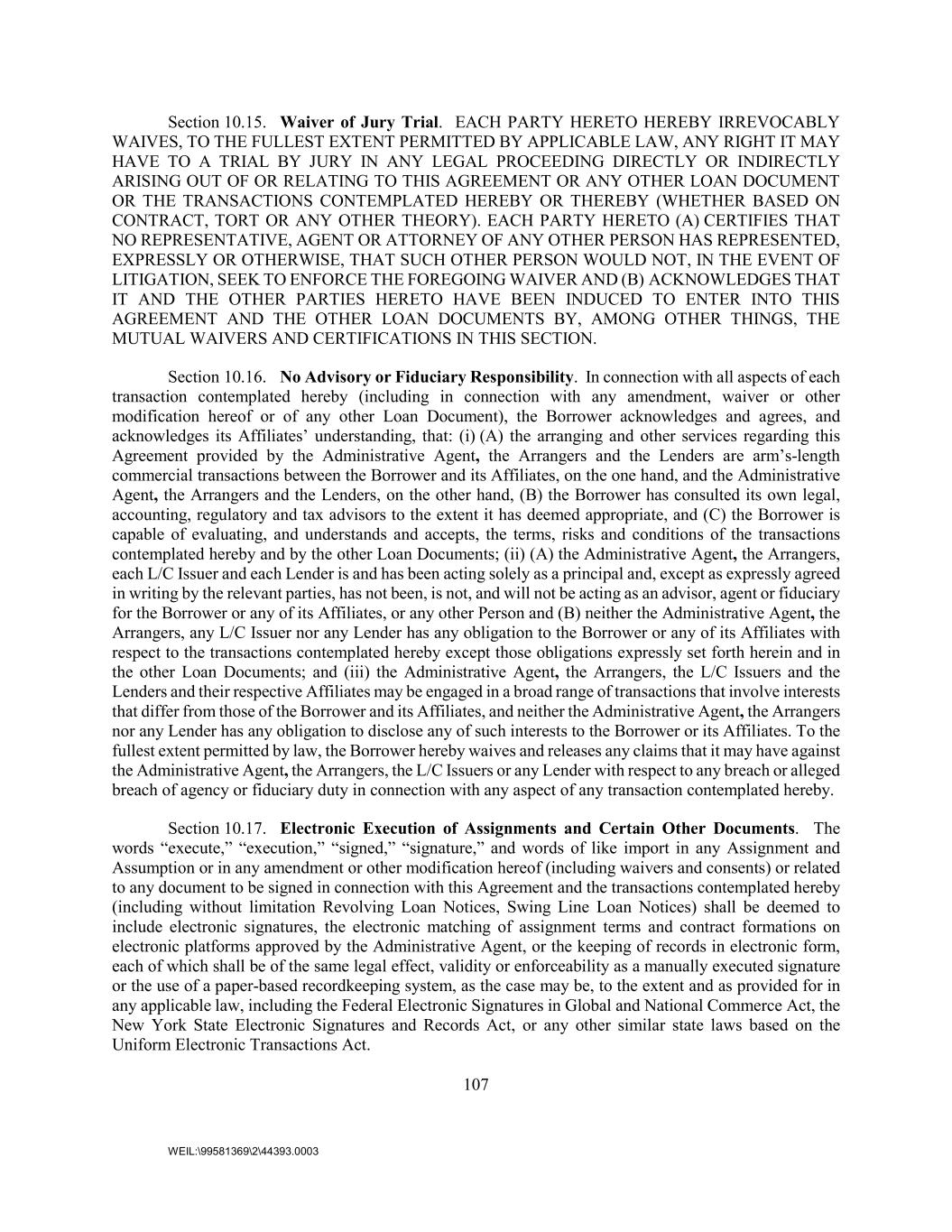107 WEIL:\99581369\2\44393.0003 Section 10.15. Waiver of Jury Trial. EACH PARTY HERETO HEREBY IRREVOCABLY WAIVES, TO THE FULLEST EXTENT PERMITTED BY APPLICABLE LAW, ANY RIGHT IT MAY HAVE TO A TRIAL BY JURY IN ANY LEGAL PROCEEDING DIRECTLY OR INDIRECTLY ARISING OUT OF OR RELATING TO THIS AGREEMENT OR ANY OTHER LOAN DOCUMENT OR THE TRANSACTIONS CONTEMPLATED HEREBY OR THEREBY (WHETHER BASED ON CONTRACT, TORT OR ANY OTHER THEORY). EACH PARTY HERETO (A) CERTIFIES THAT NO REPRESENTATIVE, AGENT OR ATTORNEY OF ANY OTHER PERSON HAS REPRESENTED, EXPRESSLY OR OTHERWISE, THAT SUCH OTHER PERSON WOULD NOT, IN THE EVENT OF LITIGATION, SEEK TO ENFORCE THE FOREGOING WAIVER AND (B) ACKNOWLEDGES THAT IT AND THE OTHER PARTIES HERETO HAVE BEEN INDUCED TO ENTER INTO THIS AGREEMENT AND THE OTHER LOAN DOCUMENTS BY, AMONG OTHER THINGS, THE MUTUAL WAIVERS AND CERTIFICATIONS IN THIS SECTION. Section 10.16. No Advisory or Fiduciary Responsibility. In connection with all aspects of each transaction contemplated hereby (including in connection with any amendment, waiver or other modification hereof or of any other Loan Document), the Borrower acknowledges and agrees, and acknowledges its Affiliates’ understanding, that: (i) (A) the arranging and other services regarding this Agreement provided by the Administrative Agent, the Arrangers and the Lenders are arm’s-length commercial transactions between the Borrower and its Affiliates, on the one hand, and the Administrative Agent, the Arrangers and the Lenders, on the other hand, (B) the Borrower has consulted its own legal, accounting, regulatory and tax advisors to the extent it has deemed appropriate, and (C) the Borrower is capable of evaluating, and understands and accepts, the terms, risks and conditions of the transactions contemplated hereby and by the other Loan Documents; (ii) (A) the Administrative Agent, the Arrangers, each L/C Issuer and each Lender is and has been acting solely as a principal and, except as expressly agreed in writing by the relevant parties, has not been, is not, and will not be acting as an advisor, agent or fiduciary for the Borrower or any of its Affiliates, or any other Person and (B) neither the Administrative Agent, the Arrangers, any L/C Issuer nor any Lender has any obligation to the Borrower or any of its Affiliates with respect to the transactions contemplated hereby except those obligations expressly set forth herein and in the other Loan Documents; and (iii) the Administrative Agent, the Arrangers, the L/C Issuers and the Lenders and their respective Affiliates may be engaged in a broad range of transactions that involve interests that differ from those of the Borrower and its Affiliates, and neither the Administrative Agent, the Arrangers nor any Lender has any obligation to disclose any of such interests to the Borrower or its Affiliates. To the fullest extent permitted by law, the Borrower hereby waives and releases any claims that it may have against the Administrative Agent, the Arrangers, the L/C Issuers or any Lender with respect to any breach or alleged breach of agency or fiduciary duty in connection with any aspect of any transaction contemplated hereby. Section 10.17. Electronic Execution of Assignments and Certain Other Documents. The words “execute,” “execution,” “signed,” “signature,” and words of like import in any Assignment and Assumption or in any amendment or other modification hereof (including waivers and consents) or related to any document to be signed in connection with this Agreement and the transactions contemplated hereby (including without limitation Revolving Loan Notices, Swing Line Loan Notices) shall be deemed to include electronic signatures, the electronic matching of assignment terms and contract formations on electronic platforms approved by the Administrative Agent, or the keeping of records in electronic form, each of which shall be of the same legal effect, validity or enforceability as a manually executed signature or the use of a paper-based recordkeeping system, as the case may be, to the extent and as provided for in any applicable law, including the Federal Electronic Signatures in Global and National Commerce Act, the New York State Electronic Signatures and Records Act, or any other similar state laws based on the Uniform Electronic Transactions Act.