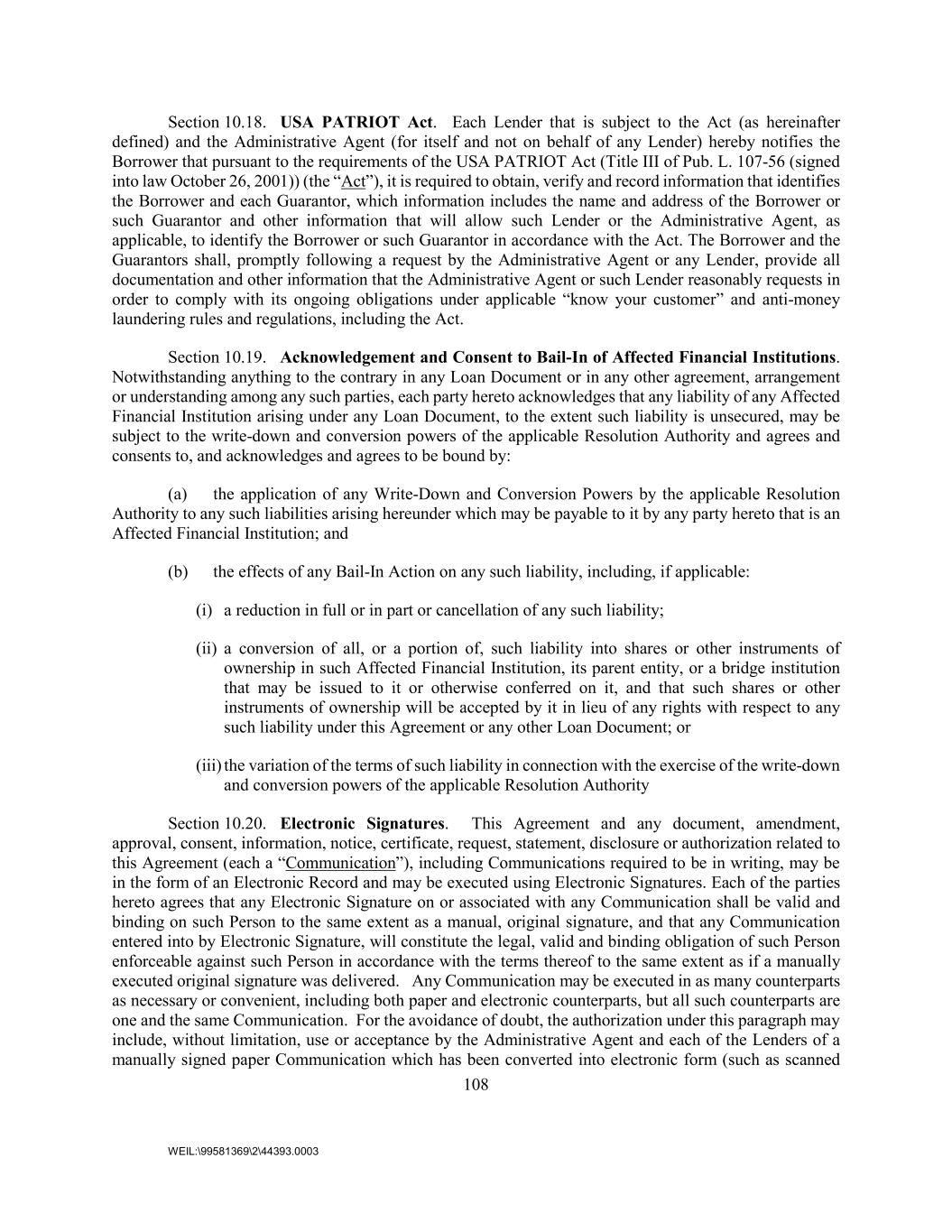 108 WEIL:\99581369\2\44393.0003 Section 10.18. USA PATRIOT Act. Each Lender that is subject to the Act (as hereinafter defined) and the Administrative Agent (for itself and not on behalf of any Lender) hereby notifies the Borrower that pursuant to the requirements of the USA PATRIOT Act (Title III of Pub. L. 107-56 (signed into law October 26, 2001)) (the “Act”), it is required to obtain, verify and record information that identifies the Borrower and each Guarantor, which information includes the name and address of the Borrower or such Guarantor and other information that will allow such Lender or the Administrative Agent, as applicable, to identify the Borrower or such Guarantor in accordance with the Act. The Borrower and the Guarantors shall, promptly following a request by the Administrative Agent or any Lender, provide all documentation and other information that the Administrative Agent or such Lender reasonably requests in order to comply with its ongoing obligations under applicable “know your customer” and anti-money laundering rules and regulations, including the Act. Section 10.19. Acknowledgement and Consent to Bail-In of Affected Financial Institutions. Notwithstanding anything to the contrary in any Loan Document or in any other agreement, arrangement or understanding among any such parties, each party hereto acknowledges that any liability of any Affected Financial Institution arising under any Loan Document, to the extent such liability is unsecured, may be subject to the write-down and conversion powers of the applicable Resolution Authority and agrees and consents to, and acknowledges and agrees to be bound by: (a) the application of any Write-Down and Conversion Powers by the applicable Resolution Authority to any such liabilities arising hereunder which may be payable to it by any party hereto that is an Affected Financial Institution; and (b) the effects of any Bail-In Action on any such liability, including, if applicable: (i) a reduction in full or in part or cancellation of any such liability; (ii) a conversion of all, or a portion of, such liability into shares or other instruments of ownership in such Affected Financial Institution, its parent entity, or a bridge institution that may be issued to it or otherwise conferred on it, and that such shares or other instruments of ownership will be accepted by it in lieu of any rights with respect to any such liability under this Agreement or any other Loan Document; or (iii) the variation of the terms of such liability in connection with the exercise of the write-down and conversion powers of the applicable Resolution Authority Section 10.20. Electronic Signatures. This Agreement and any document, amendment, approval, consent, information, notice, certificate, request, statement, disclosure or authorization related to this Agreement (each a “Communication”), including Communications required to be in writing, may be in the form of an Electronic Record and may be executed using Electronic Signatures. Each of the parties hereto agrees that any Electronic Signature on or associated with any Communication shall be valid and binding on such Person to the same extent as a manual, original signature, and that any Communication entered into by Electronic Signature, will constitute the legal, valid and binding obligation of such Person enforceable against such Person in accordance with the terms thereof to the same extent as if a manually executed original signature was delivered. Any Communication may be executed in as many counterparts as necessary or convenient, including both paper and electronic counterparts, but all such counterparts are one and the same Communication. For the avoidance of doubt, the authorization under this paragraph may include, without limitation, use or acceptance by the Administrative Agent and each of the Lenders of a manually signed paper Communication which has been converted into electronic form (such as scanned