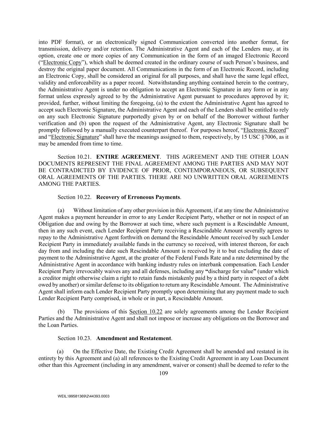 109 WEIL:\99581369\2\44393.0003 into PDF format), or an electronically signed Communication converted into another format, for transmission, delivery and/or retention. The Administrative Agent and each of the Lenders may, at its option, create one or more copies of any Communication in the form of an imaged Electronic Record (“Electronic Copy”), which shall be deemed created in the ordinary course of such Person’s business, and destroy the original paper document. All Communications in the form of an Electronic Record, including an Electronic Copy, shall be considered an original for all purposes, and shall have the same legal effect, validity and enforceability as a paper record. Notwithstanding anything contained herein to the contrary, the Administrative Agent is under no obligation to accept an Electronic Signature in any form or in any format unless expressly agreed to by the Administrative Agent pursuant to procedures approved by it; provided, further, without limiting the foregoing, (a) to the extent the Administrative Agent has agreed to accept such Electronic Signature, the Administrative Agent and each of the Lenders shall be entitled to rely on any such Electronic Signature purportedly given by or on behalf of the Borrower without further verification and (b) upon the request of the Administrative Agent, any Electronic Signature shall be promptly followed by a manually executed counterpart thereof. For purposes hereof, “Electronic Record” and “Electronic Signature” shall have the meanings assigned to them, respectively, by 15 USC §7006, as it may be amended from time to time. Section 10.21. ENTIRE AGREEMENT. THIS AGREEMENT AND THE OTHER LOAN DOCUMENTS REPRESENT THE FINAL AGREEMENT AMONG THE PARTIES AND MAY NOT BE CONTRADICTED BY EVIDENCE OF PRIOR, CONTEMPORANEOUS, OR SUBSEQUENT ORAL AGREEMENTS OF THE PARTIES. THERE ARE NO UNWRITTEN ORAL AGREEMENTS AMONG THE PARTIES. Section 10.22. Recovery of Erroneous Payments. (a) Without limitation of any other provision in this Agreement, if at any time the Administrative Agent makes a payment hereunder in error to any Lender Recipient Party, whether or not in respect of an Obligation due and owing by the Borrower at such time, where such payment is a Rescindable Amount, then in any such event, each Lender Recipient Party receiving a Rescindable Amount severally agrees to repay to the Administrative Agent forthwith on demand the Rescindable Amount received by such Lender Recipient Party in immediately available funds in the currency so received, with interest thereon, for each day from and including the date such Rescindable Amount is received by it to but excluding the date of payment to the Administrative Agent, at the greater of the Federal Funds Rate and a rate determined by the Administrative Agent in accordance with banking industry rules on interbank compensation. Each Lender Recipient Party irrevocably waives any and all defenses, including any “discharge for value” (under which a creditor might otherwise claim a right to retain funds mistakenly paid by a third party in respect of a debt owed by another) or similar defense to its obligation to return any Rescindable Amount. The Administrative Agent shall inform each Lender Recipient Party promptly upon determining that any payment made to such Lender Recipient Party comprised, in whole or in part, a Rescindable Amount. (b) The provisions of this Section 10.22 are solely agreements among the Lender Recipient Parties and the Administrative Agent and shall not impose or increase any obligations on the Borrower and the Loan Parties. Section 10.23. Amendment and Restatement. (a) On the Effective Date, the Existing Credit Agreement shall be amended and restated in its entirety by this Agreement and (a) all references to the Existing Credit Agreement in any Loan Document other than this Agreement (including in any amendment, waiver or consent) shall be deemed to refer to the