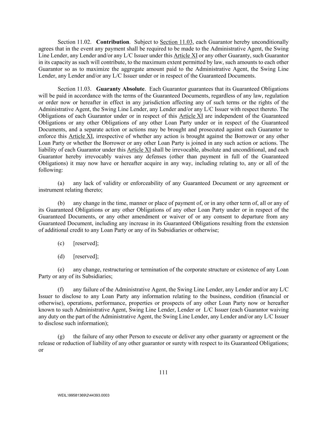 111 WEIL:\99581369\2\44393.0003 Section 11.02. Contribution. Subject to Section 11.03, each Guarantor hereby unconditionally agrees that in the event any payment shall be required to be made to the Administrative Agent, the Swing Line Lender, any Lender and/or any L/C Issuer under this Article XI or any other Guaranty, such Guarantor in its capacity as such will contribute, to the maximum extent permitted by law, such amounts to each other Guarantor so as to maximize the aggregate amount paid to the Administrative Agent, the Swing Line Lender, any Lender and/or any L/C Issuer under or in respect of the Guaranteed Documents. Section 11.03. Guaranty Absolute. Each Guarantor guarantees that its Guaranteed Obligations will be paid in accordance with the terms of the Guaranteed Documents, regardless of any law, regulation or order now or hereafter in effect in any jurisdiction affecting any of such terms or the rights of the Administrative Agent, the Swing Line Lender, any Lender and/or any L/C Issuer with respect thereto. The Obligations of each Guarantor under or in respect of this Article XI are independent of the Guaranteed Obligations or any other Obligations of any other Loan Party under or in respect of the Guaranteed Documents, and a separate action or actions may be brought and prosecuted against each Guarantor to enforce this Article XI, irrespective of whether any action is brought against the Borrower or any other Loan Party or whether the Borrower or any other Loan Party is joined in any such action or actions. The liability of each Guarantor under this Article XI shall be irrevocable, absolute and unconditional, and each Guarantor hereby irrevocably waives any defenses (other than payment in full of the Guaranteed Obligations) it may now have or hereafter acquire in any way, including relating to, any or all of the following: (a) any lack of validity or enforceability of any Guaranteed Document or any agreement or instrument relating thereto; (b) any change in the time, manner or place of payment of, or in any other term of, all or any of its Guaranteed Obligations or any other Obligations of any other Loan Party under or in respect of the Guaranteed Documents, or any other amendment or waiver of or any consent to departure from any Guaranteed Document, including any increase in its Guaranteed Obligations resulting from the extension of additional credit to any Loan Party or any of its Subsidiaries or otherwise; (c) [reserved]; (d) [reserved]; (e) any change, restructuring or termination of the corporate structure or existence of any Loan Party or any of its Subsidiaries; (f) any failure of the Administrative Agent, the Swing Line Lender, any Lender and/or any L/C Issuer to disclose to any Loan Party any information relating to the business, condition (financial or otherwise), operations, performance, properties or prospects of any other Loan Party now or hereafter known to such Administrative Agent, Swing Line Lender, Lender or L/C Issuer (each Guarantor waiving any duty on the part of the Administrative Agent, the Swing Line Lender, any Lender and/or any L/C Issuer to disclose such information); (g) the failure of any other Person to execute or deliver any other guaranty or agreement or the release or reduction of liability of any other guarantor or surety with respect to its Guaranteed Obligations; or