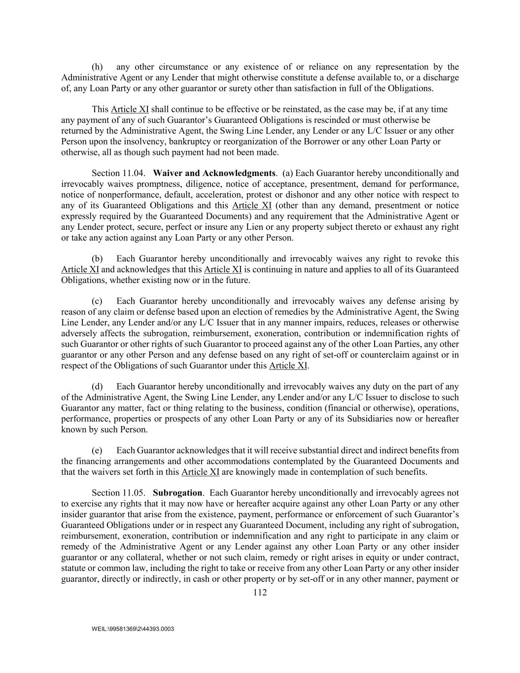 112 WEIL:\99581369\2\44393.0003 (h) any other circumstance or any existence of or reliance on any representation by the Administrative Agent or any Lender that might otherwise constitute a defense available to, or a discharge of, any Loan Party or any other guarantor or surety other than satisfaction in full of the Obligations. This Article XI shall continue to be effective or be reinstated, as the case may be, if at any time any payment of any of such Guarantor’s Guaranteed Obligations is rescinded or must otherwise be returned by the Administrative Agent, the Swing Line Lender, any Lender or any L/C Issuer or any other Person upon the insolvency, bankruptcy or reorganization of the Borrower or any other Loan Party or otherwise, all as though such payment had not been made. Section 11.04. Waiver and Acknowledgments. (a) Each Guarantor hereby unconditionally and irrevocably waives promptness, diligence, notice of acceptance, presentment, demand for performance, notice of nonperformance, default, acceleration, protest or dishonor and any other notice with respect to any of its Guaranteed Obligations and this Article XI (other than any demand, presentment or notice expressly required by the Guaranteed Documents) and any requirement that the Administrative Agent or any Lender protect, secure, perfect or insure any Lien or any property subject thereto or exhaust any right or take any action against any Loan Party or any other Person. (b) Each Guarantor hereby unconditionally and irrevocably waives any right to revoke this Article XI and acknowledges that this Article XI is continuing in nature and applies to all of its Guaranteed Obligations, whether existing now or in the future. (c) Each Guarantor hereby unconditionally and irrevocably waives any defense arising by reason of any claim or defense based upon an election of remedies by the Administrative Agent, the Swing Line Lender, any Lender and/or any L/C Issuer that in any manner impairs, reduces, releases or otherwise adversely affects the subrogation, reimbursement, exoneration, contribution or indemnification rights of such Guarantor or other rights of such Guarantor to proceed against any of the other Loan Parties, any other guarantor or any other Person and any defense based on any right of set-off or counterclaim against or in respect of the Obligations of such Guarantor under this Article XI. (d) Each Guarantor hereby unconditionally and irrevocably waives any duty on the part of any of the Administrative Agent, the Swing Line Lender, any Lender and/or any L/C Issuer to disclose to such Guarantor any matter, fact or thing relating to the business, condition (financial or otherwise), operations, performance, properties or prospects of any other Loan Party or any of its Subsidiaries now or hereafter known by such Person. (e) Each Guarantor acknowledges that it will receive substantial direct and indirect benefits from the financing arrangements and other accommodations contemplated by the Guaranteed Documents and that the waivers set forth in this Article XI are knowingly made in contemplation of such benefits. Section 11.05. Subrogation. Each Guarantor hereby unconditionally and irrevocably agrees not to exercise any rights that it may now have or hereafter acquire against any other Loan Party or any other insider guarantor that arise from the existence, payment, performance or enforcement of such Guarantor’s Guaranteed Obligations under or in respect any Guaranteed Document, including any right of subrogation, reimbursement, exoneration, contribution or indemnification and any right to participate in any claim or remedy of the Administrative Agent or any Lender against any other Loan Party or any other insider guarantor or any collateral, whether or not such claim, remedy or right arises in equity or under contract, statute or common law, including the right to take or receive from any other Loan Party or any other insider guarantor, directly or indirectly, in cash or other property or by set-off or in any other manner, payment or