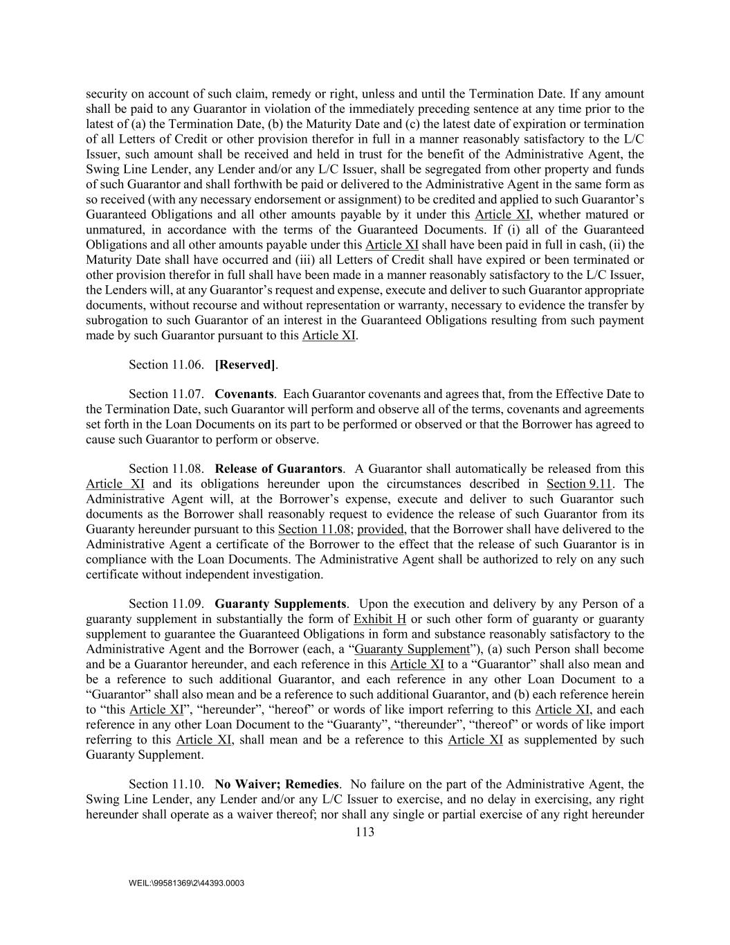 113 WEIL:\99581369\2\44393.0003 security on account of such claim, remedy or right, unless and until the Termination Date. If any amount shall be paid to any Guarantor in violation of the immediately preceding sentence at any time prior to the latest of (a) the Termination Date, (b) the Maturity Date and (c) the latest date of expiration or termination of all Letters of Credit or other provision therefor in full in a manner reasonably satisfactory to the L/C Issuer, such amount shall be received and held in trust for the benefit of the Administrative Agent, the Swing Line Lender, any Lender and/or any L/C Issuer, shall be segregated from other property and funds of such Guarantor and shall forthwith be paid or delivered to the Administrative Agent in the same form as so received (with any necessary endorsement or assignment) to be credited and applied to such Guarantor’s Guaranteed Obligations and all other amounts payable by it under this Article XI, whether matured or unmatured, in accordance with the terms of the Guaranteed Documents. If (i) all of the Guaranteed Obligations and all other amounts payable under this Article XI shall have been paid in full in cash, (ii) the Maturity Date shall have occurred and (iii) all Letters of Credit shall have expired or been terminated or other provision therefor in full shall have been made in a manner reasonably satisfactory to the L/C Issuer, the Lenders will, at any Guarantor’s request and expense, execute and deliver to such Guarantor appropriate documents, without recourse and without representation or warranty, necessary to evidence the transfer by subrogation to such Guarantor of an interest in the Guaranteed Obligations resulting from such payment made by such Guarantor pursuant to this Article XI. Section 11.06. [Reserved]. Section 11.07. Covenants. Each Guarantor covenants and agrees that, from the Effective Date to the Termination Date, such Guarantor will perform and observe all of the terms, covenants and agreements set forth in the Loan Documents on its part to be performed or observed or that the Borrower has agreed to cause such Guarantor to perform or observe. Section 11.08. Release of Guarantors. A Guarantor shall automatically be released from this Article XI and its obligations hereunder upon the circumstances described in Section 9.11. The Administrative Agent will, at the Borrower’s expense, execute and deliver to such Guarantor such documents as the Borrower shall reasonably request to evidence the release of such Guarantor from its Guaranty hereunder pursuant to this Section 11.08; provided, that the Borrower shall have delivered to the Administrative Agent a certificate of the Borrower to the effect that the release of such Guarantor is in compliance with the Loan Documents. The Administrative Agent shall be authorized to rely on any such certificate without independent investigation. Section 11.09. Guaranty Supplements. Upon the execution and delivery by any Person of a guaranty supplement in substantially the form of Exhibit H or such other form of guaranty or guaranty supplement to guarantee the Guaranteed Obligations in form and substance reasonably satisfactory to the Administrative Agent and the Borrower (each, a “Guaranty Supplement”), (a) such Person shall become and be a Guarantor hereunder, and each reference in this Article XI to a “Guarantor” shall also mean and be a reference to such additional Guarantor, and each reference in any other Loan Document to a “Guarantor” shall also mean and be a reference to such additional Guarantor, and (b) each reference herein to “this Article XI”, “hereunder”, “hereof” or words of like import referring to this Article XI, and each reference in any other Loan Document to the “Guaranty”, “thereunder”, “thereof” or words of like import referring to this Article XI, shall mean and be a reference to this Article XI as supplemented by such Guaranty Supplement. Section 11.10. No Waiver; Remedies. No failure on the part of the Administrative Agent, the Swing Line Lender, any Lender and/or any L/C Issuer to exercise, and no delay in exercising, any right hereunder shall operate as a waiver thereof; nor shall any single or partial exercise of any right hereunder