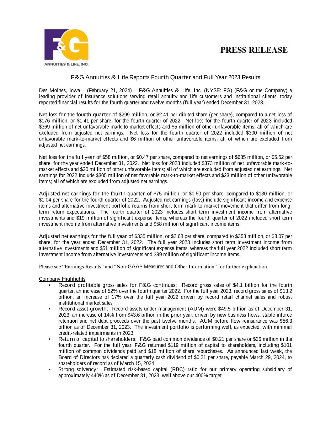F&G Annuities & Life Reports Fourth Quarter and Full Year 2023 Results Des Moines, Iowa – (February 21, 2024) – F&G Annuities & Life, Inc. (NYSE: FG) (F&G or the Company) a leading provider of insurance solutions serving retail annuity and life customers and institutional clients, today reported financial results for the fourth quarter and twelve months (full year) ended December 31, 2023. Net loss for the fourth quarter of $299 million, or $2.41 per diluted share (per share), compared to a net loss of $176 million, or $1.41 per share, for the fourth quarter of 2022. Net loss for the fourth quarter of 2023 included $369 million of net unfavorable mark-to-market effects and $5 million of other unfavorable items; all of which are excluded from adjusted net earnings. Net loss for the fourth quarter of 2022 included $300 million of net unfavorable mark-to-market effects and $6 million of other unfavorable items; all of which are excluded from adjusted net earnings. Net loss for the full year of $58 million, or $0.47 per share, compared to net earnings of $635 million, or $5.52 per share, for the year ended December 31, 2022. Net loss for 2023 included $373 million of net unfavorable mark-to- market effects and $20 million of other unfavorable items; all of which are excluded from adjusted net earnings. Net earnings for 2022 include $305 million of net favorable mark-to-market effects and $23 million of other unfavorable items; all of which are excluded from adjusted net earnings. Adjusted net earnings for the fourth quarter of $75 million, or $0.60 per share, compared to $130 million, or $1.04 per share for the fourth quarter of 2022. Adjusted net earnings (loss) include significant income and expense items and alternative investment portfolio returns from short-term mark-to-market movement that differ from long- term return expectations. The fourth quarter of 2023 includes short term investment income from alternative investments and $19 million of significant expense items, whereas the fourth quarter of 2022 included short term investment income from alternative investments and $58 million of significant income items. Adjusted net earnings for the full year of $335 million, or $2.68 per share, compared to $353 million, or $3.07 per share, for the year ended December 31, 2022. The full year 2023 includes short term investment income from alternative investments and $51 million of significant expense items, whereas the full year 2022 included short term investment income from alternative investments and $99 million of significant income items. Please see “Earnings Results” and “Non-GAAP Measures and Other Information” for further explanation. Company Highlights • Record profitable gross sales for F&G continues: Record gross sales of $4.1 billion for the fourth quarter, an increase of 52% over the fourth quarter 2022. For the full year 2023, record gross sales of $13.2 billion, an increase of 17% over the full year 2022 driven by record retail channel sales and robust institutional market sales • Record asset growth: Record assets under management (AUM) were $49.5 billion as of December 31, 2023, an increase of 14% from $43.6 billion in the prior year, driven by new business flows, stable inforce retention and net debt proceeds over the past twelve months. AUM before flow reinsurance was $56.3 billion as of December 31, 2023. The investment portfolio is performing well, as expected, with minimal credit-related impairments in 2023 • Return of capital to shareholders: F&G paid common dividends of $0.21 per share or $26 million in the fourth quarter. For the full year, F&G returned $119 million of capital to shareholders, including $101 million of common dividends paid and $18 million of share repurchases. As announced last week, the Board of Directors has declared a quarterly cash dividend of $0.21 per share, payable March 29, 2024, to shareholders of record as of March 15, 2024 • Strong solvency: Estimated risk-based capital (RBC) ratio for our primary operating subsidiary of approximately 440% as of December 31, 2023, well above our 400% target