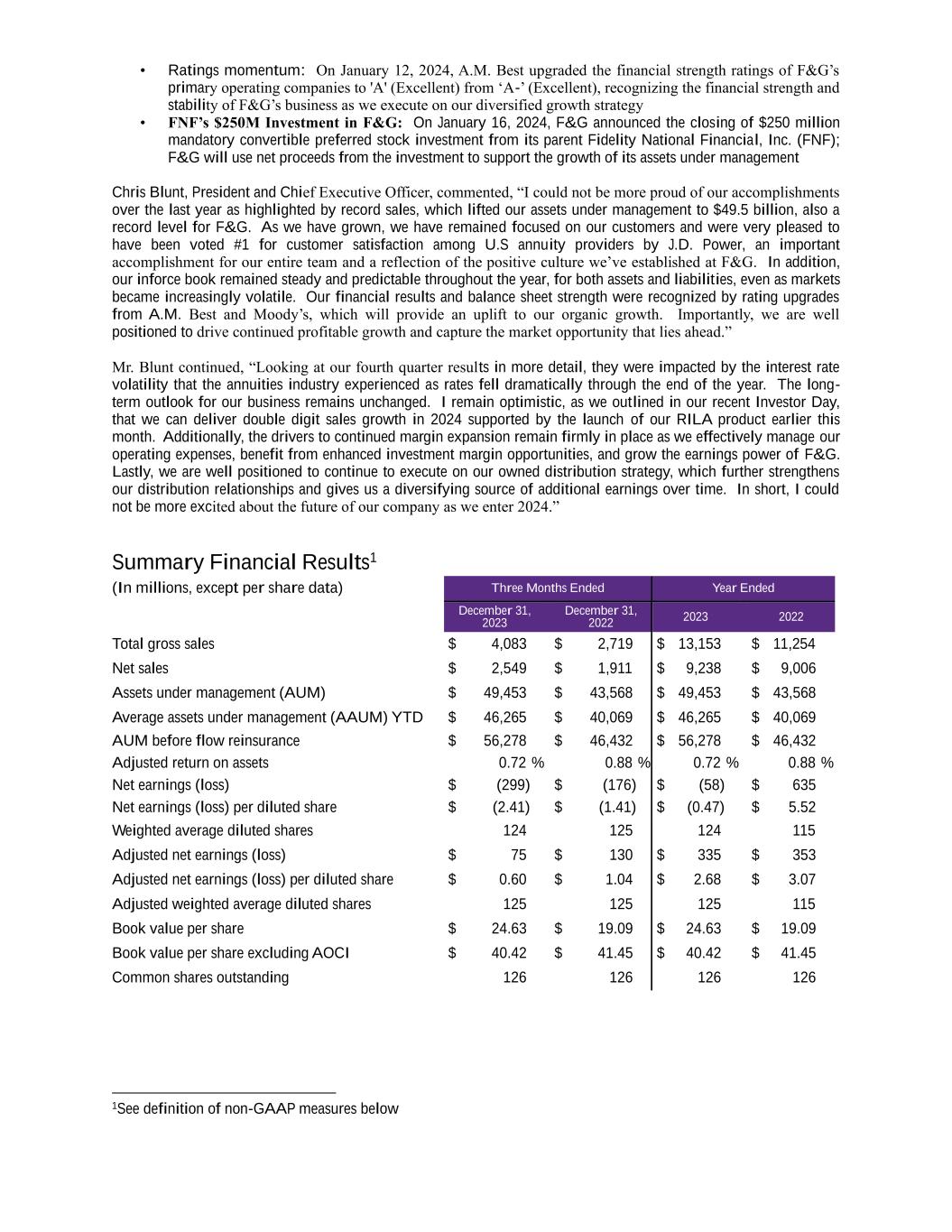 • Ratings momentum: On January 12, 2024, A.M. Best upgraded the financial strength ratings of F&G’s primary operating companies to 'A' (Excellent) from ‘A-’ (Excellent), recognizing the financial strength and stability of F&G’s business as we execute on our diversified growth strategy • FNF’s $250M Investment in F&G: On January 16, 2024, F&G announced the closing of $250 million mandatory convertible preferred stock investment from its parent Fidelity National Financial, Inc. (FNF); F&G will use net proceeds from the investment to support the growth of its assets under management Chris Blunt, President and Chief Executive Officer, commented, “I could not be more proud of our accomplishments over the last year as highlighted by record sales, which lifted our assets under management to $49.5 billion, also a record level for F&G. As we have grown, we have remained focused on our customers and were very pleased to have been voted #1 for customer satisfaction among U.S annuity providers by J.D. Power, an important accomplishment for our entire team and a reflection of the positive culture we’ve established at F&G. In addition, our inforce book remained steady and predictable throughout the year, for both assets and liabilities, even as markets became increasingly volatile. Our financial results and balance sheet strength were recognized by rating upgrades from A.M. Best and Moody’s, which will provide an uplift to our organic growth. Importantly, we are well positioned to drive continued profitable growth and capture the market opportunity that lies ahead.” Mr. Blunt continued, “Looking at our fourth quarter results in more detail, they were impacted by the interest rate volatility that the annuities industry experienced as rates fell dramatically through the end of the year. The long- term outlook for our business remains unchanged. I remain optimistic, as we outlined in our recent Investor Day, that we can deliver double digit sales growth in 2024 supported by the launch of our RILA product earlier this month. Additionally, the drivers to continued margin expansion remain firmly in place as we effectively manage our operating expenses, benefit from enhanced investment margin opportunities, and grow the earnings power of F&G. Lastly, we are well positioned to continue to execute on our owned distribution strategy, which further strengthens our distribution relationships and gives us a diversifying source of additional earnings over time. In short, I could not be more excited about the future of our company as we enter 2024.” Summary Financial Results1 (In millions, except per share data) Three Months Ended Year Ended December 31, 2023 December 31, 2022 2023 2022 Total gross sales $ 4,083 $ 2,719 $ 13,153 $ 11,254 Net sales $ 2,549 $ 1,911 $ 9,238 $ 9,006 Assets under management (AUM) $ 49,453 $ 43,568 $ 49,453 $ 43,568 Average assets under management (AAUM) YTD $ 46,265 $ 40,069 $ 46,265 $ 40,069 AUM before flow reinsurance $ 56,278 $ 46,432 $ 56,278 $ 46,432 Adjusted return on assets 0.72 % 0.88 % 0.72 % 0.88 % Net earnings (loss) $ (299) $ (176) $ (58) $ 635 Net earnings (loss) per diluted share $ (2.41) $ (1.41) $ (0.47) $ 5.52 Weighted average diluted shares 124 125 124 115 Adjusted net earnings (loss) $ 75 $ 130 $ 335 $ 353 Adjusted net earnings (loss) per diluted share $ 0.60 $ 1.04 $ 2.68 $ 3.07 Adjusted weighted average diluted shares 125 125 125 115 Book value per share $ 24.63 $ 19.09 $ 24.63 $ 19.09 Book value per share excluding AOCI $ 40.42 $ 41.45 $ 40.42 $ 41.45 Common shares outstanding 126 126 126 126 1See definition of non-GAAP measures below