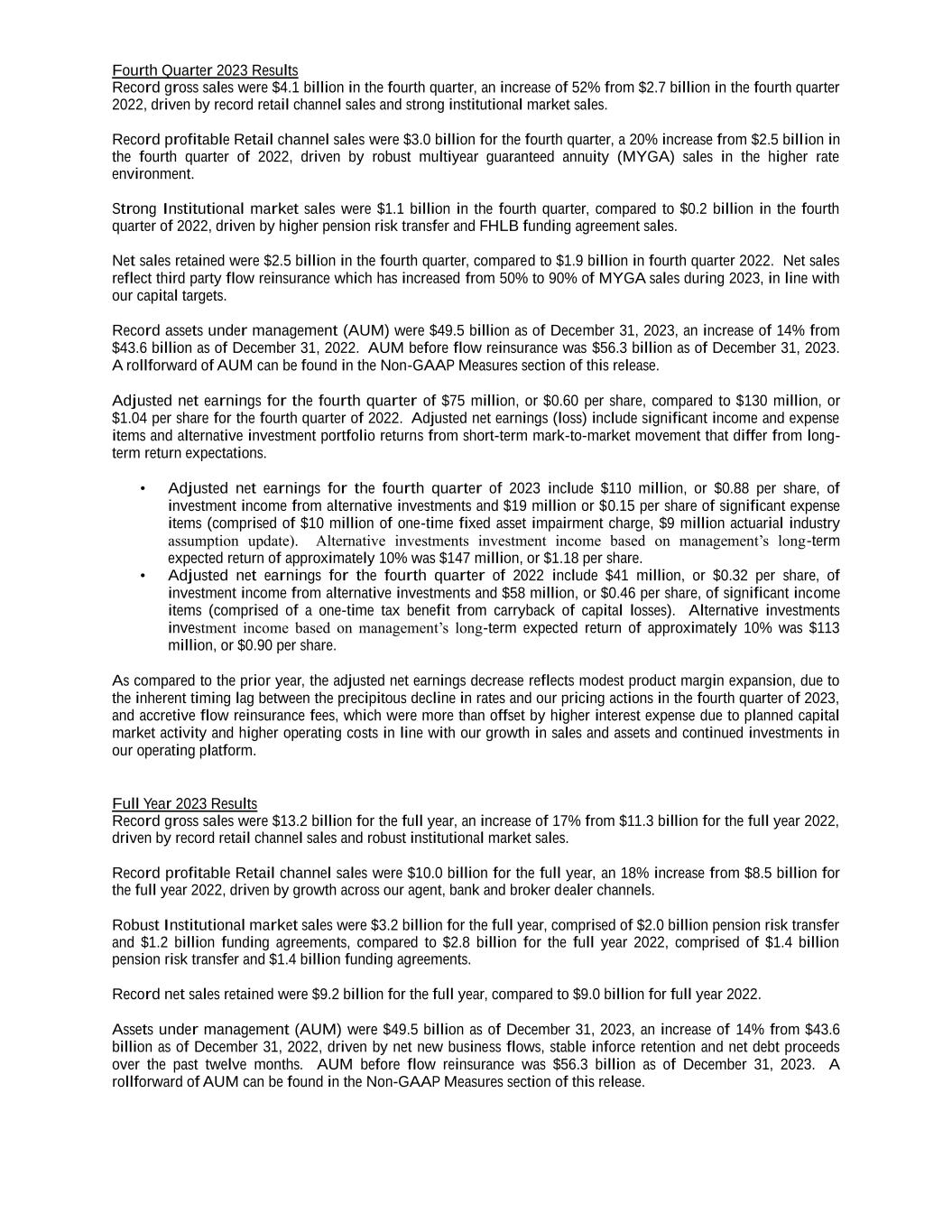 Fourth Quarter 2023 Results Record gross sales were $4.1 billion in the fourth quarter, an increase of 52% from $2.7 billion in the fourth quarter 2022, driven by record retail channel sales and strong institutional market sales. Record profitable Retail channel sales were $3.0 billion for the fourth quarter, a 20% increase from $2.5 billion in the fourth quarter of 2022, driven by robust multiyear guaranteed annuity (MYGA) sales in the higher rate environment. Strong Institutional market sales were $1.1 billion in the fourth quarter, compared to $0.2 billion in the fourth quarter of 2022, driven by higher pension risk transfer and FHLB funding agreement sales. Net sales retained were $2.5 billion in the fourth quarter, compared to $1.9 billion in fourth quarter 2022. Net sales reflect third party flow reinsurance which has increased from 50% to 90% of MYGA sales during 2023, in line with our capital targets. Record assets under management (AUM) were $49.5 billion as of December 31, 2023, an increase of 14% from $43.6 billion as of December 31, 2022. AUM before flow reinsurance was $56.3 billion as of December 31, 2023. A rollforward of AUM can be found in the Non-GAAP Measures section of this release. Adjusted net earnings for the fourth quarter of $75 million, or $0.60 per share, compared to $130 million, or $1.04 per share for the fourth quarter of 2022. Adjusted net earnings (loss) include significant income and expense items and alternative investment portfolio returns from short-term mark-to-market movement that differ from long- term return expectations. • Adjusted net earnings for the fourth quarter of 2023 include $110 million, or $0.88 per share, of investment income from alternative investments and $19 million or $0.15 per share of significant expense items (comprised of $10 million of one-time fixed asset impairment charge, $9 million actuarial industry assumption update). Alternative investments investment income based on management’s long-term expected return of approximately 10% was $147 million, or $1.18 per share. • Adjusted net earnings for the fourth quarter of 2022 include $41 million, or $0.32 per share, of investment income from alternative investments and $58 million, or $0.46 per share, of significant income items (comprised of a one-time tax benefit from carryback of capital losses). Alternative investments investment income based on management’s long-term expected return of approximately 10% was $113 million, or $0.90 per share. As compared to the prior year, the adjusted net earnings decrease reflects modest product margin expansion, due to the inherent timing lag between the precipitous decline in rates and our pricing actions in the fourth quarter of 2023, and accretive flow reinsurance fees, which were more than offset by higher interest expense due to planned capital market activity and higher operating costs in line with our growth in sales and assets and continued investments in our operating platform. Full Year 2023 Results Record gross sales were $13.2 billion for the full year, an increase of 17% from $11.3 billion for the full year 2022, driven by record retail channel sales and robust institutional market sales. Record profitable Retail channel sales were $10.0 billion for the full year, an 18% increase from $8.5 billion for the full year 2022, driven by growth across our agent, bank and broker dealer channels. Robust Institutional market sales were $3.2 billion for the full year, comprised of $2.0 billion pension risk transfer and $1.2 billion funding agreements, compared to $2.8 billion for the full year 2022, comprised of $1.4 billion pension risk transfer and $1.4 billion funding agreements. Record net sales retained were $9.2 billion for the full year, compared to $9.0 billion for full year 2022. Assets under management (AUM) were $49.5 billion as of December 31, 2023, an increase of 14% from $43.6 billion as of December 31, 2022, driven by net new business flows, stable inforce retention and net debt proceeds over the past twelve months. AUM before flow reinsurance was $56.3 billion as of December 31, 2023. A rollforward of AUM can be found in the Non-GAAP Measures section of this release.